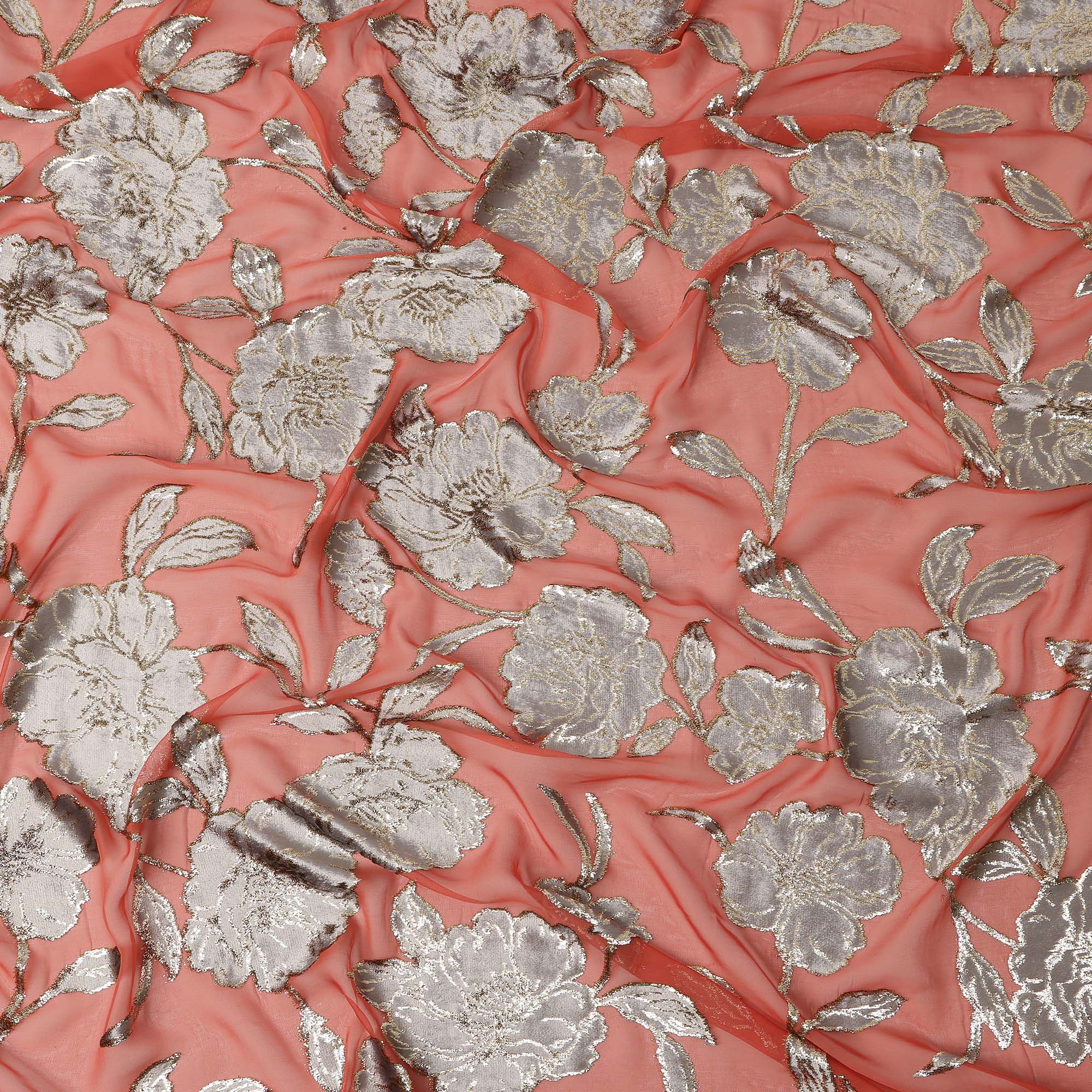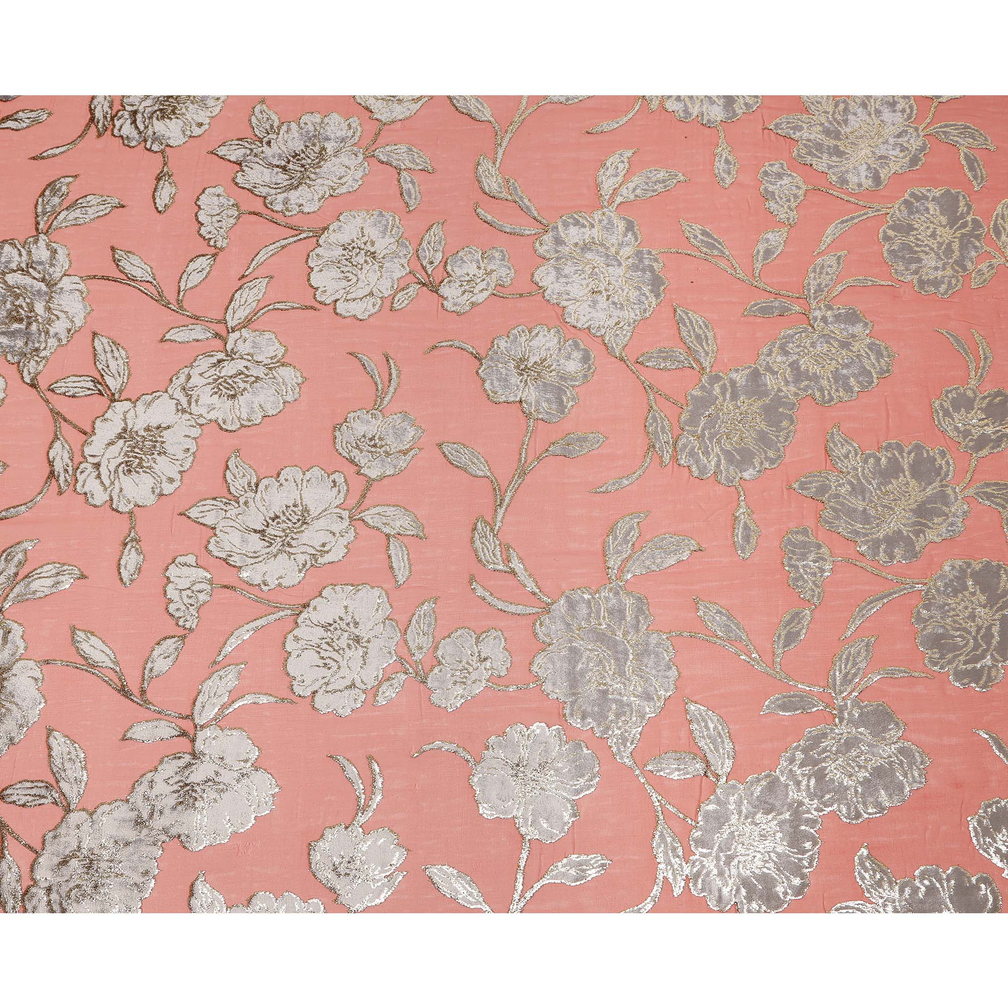 Elegant peach hue highlighted with shimmering metallic velvet floral motifs