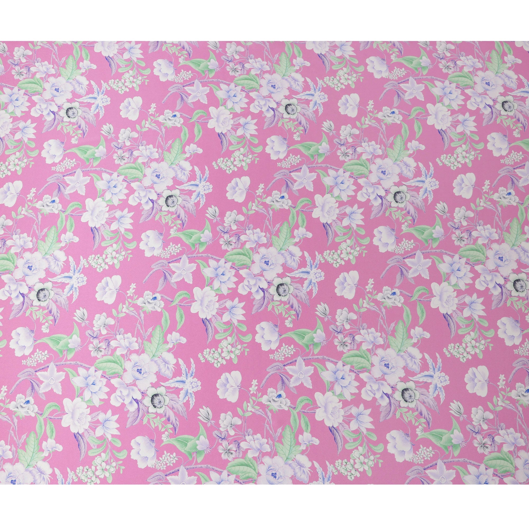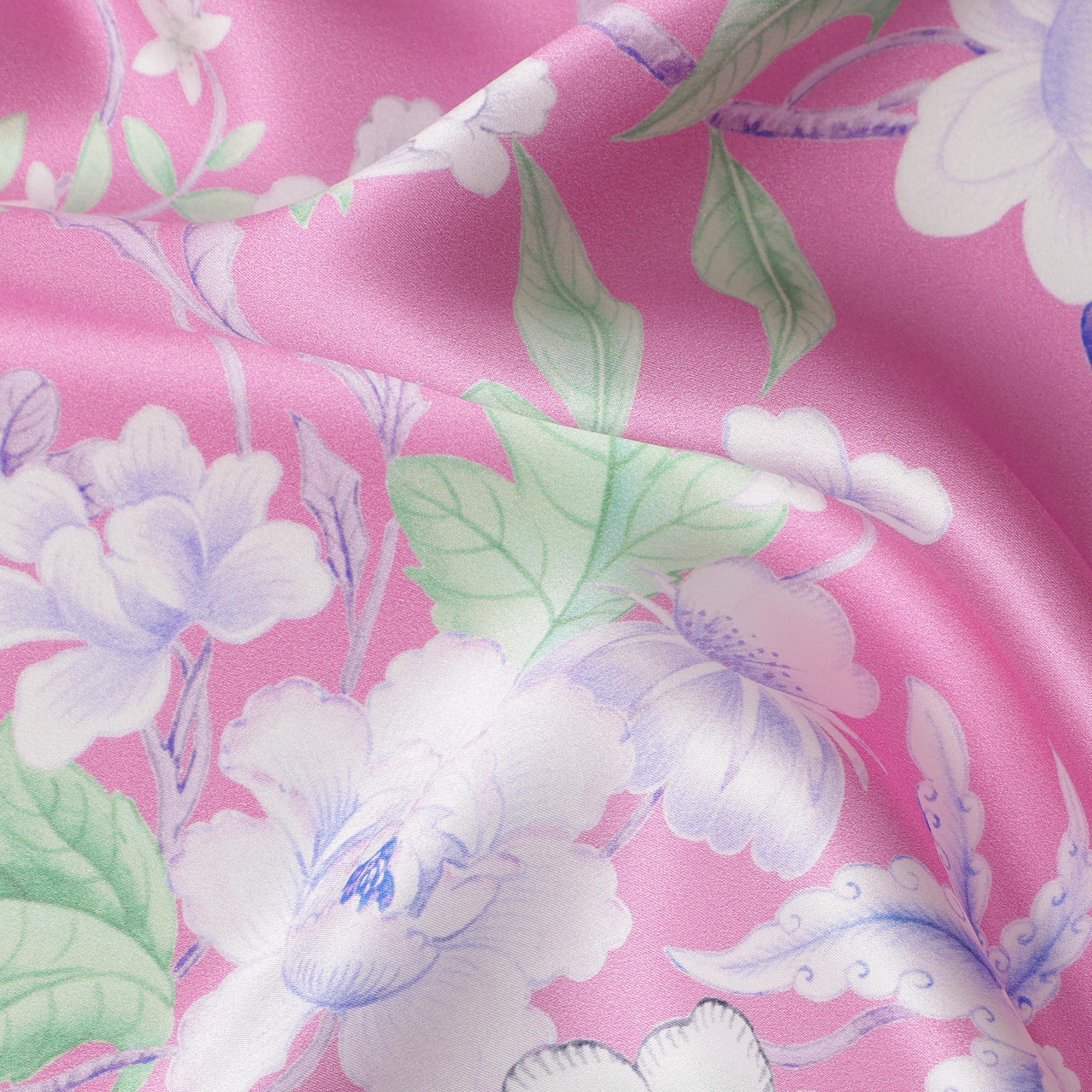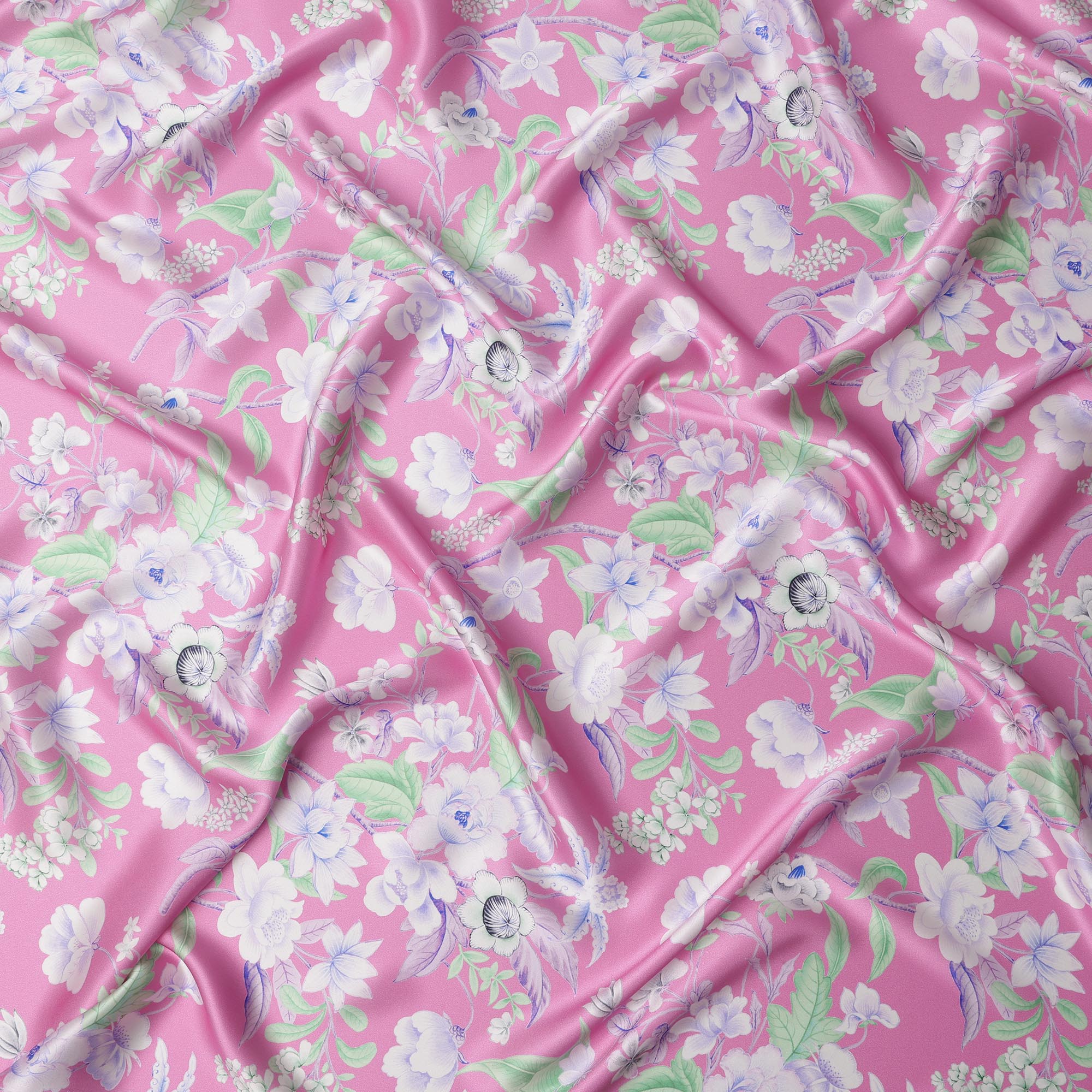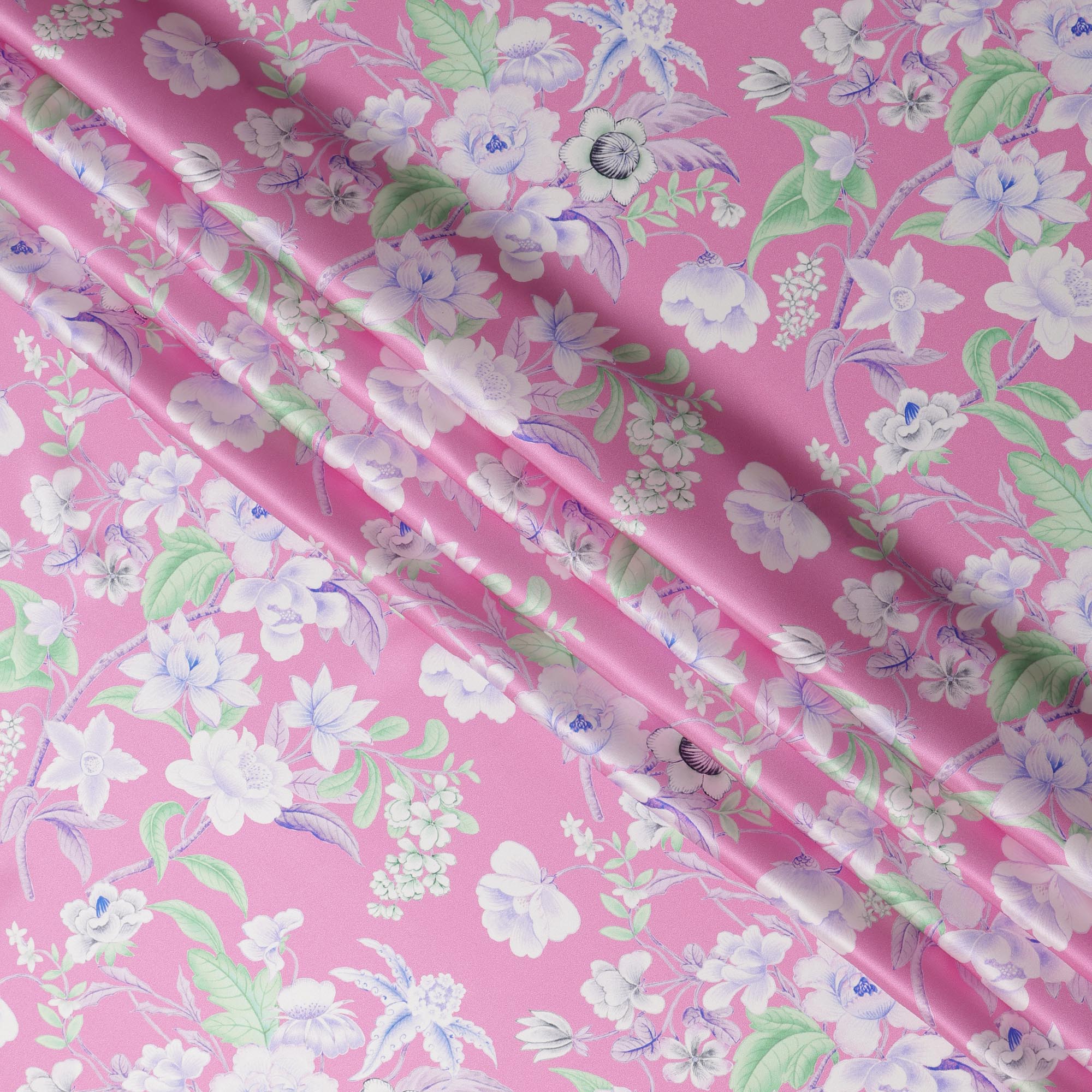 قماش حرير ساتان إيطالي فاخر بقاعدة وردية مع طبعة زهور باللون الأبيض واللافندر والأخضر، عرض 140 سم، صنع في إيطاليا - D22991