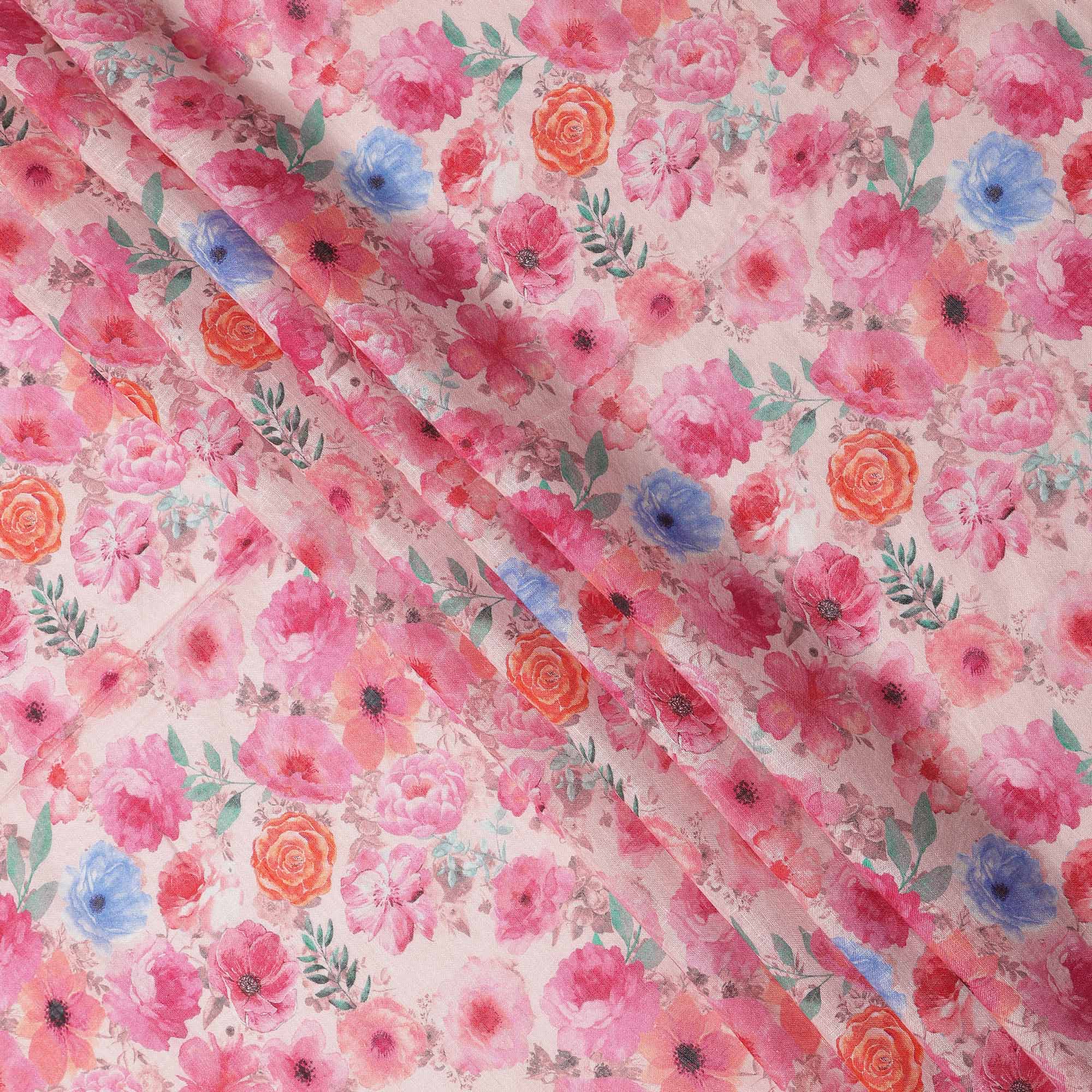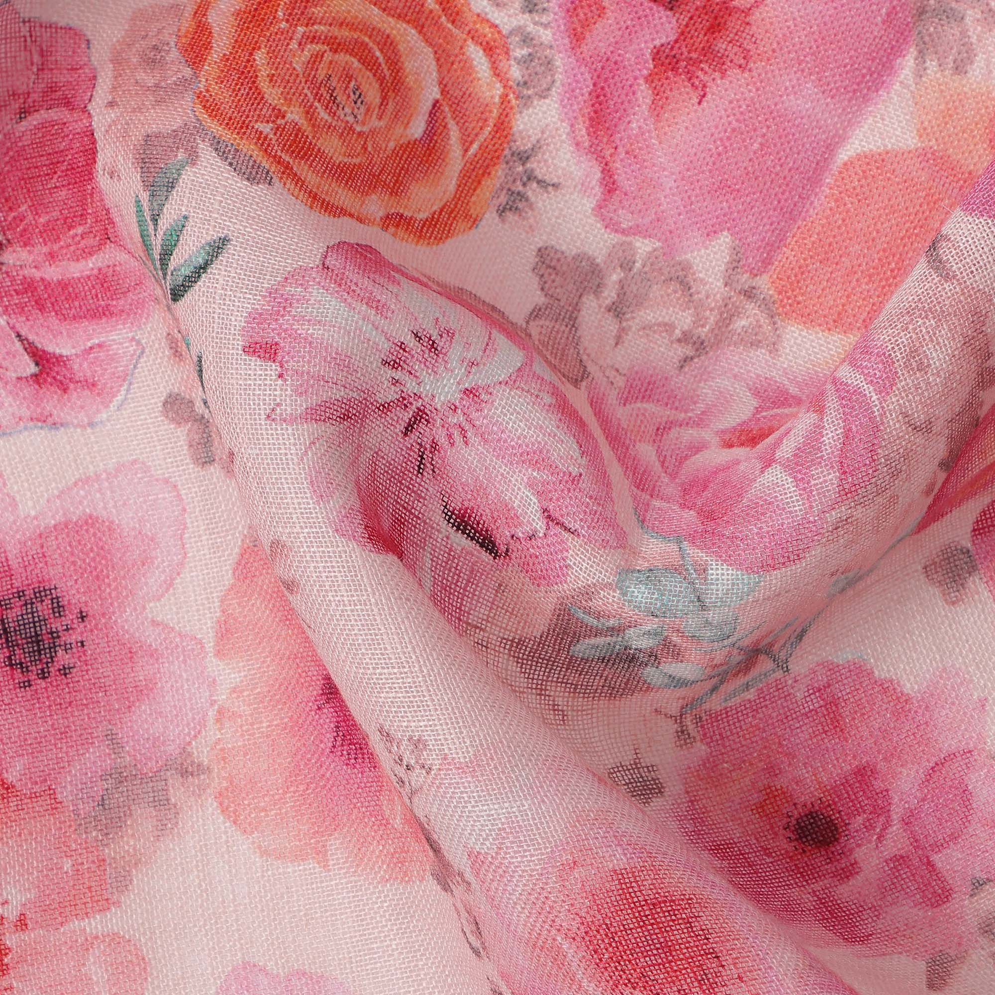 قماش كتان وردي مع طباعة زهور متعددة الألوان