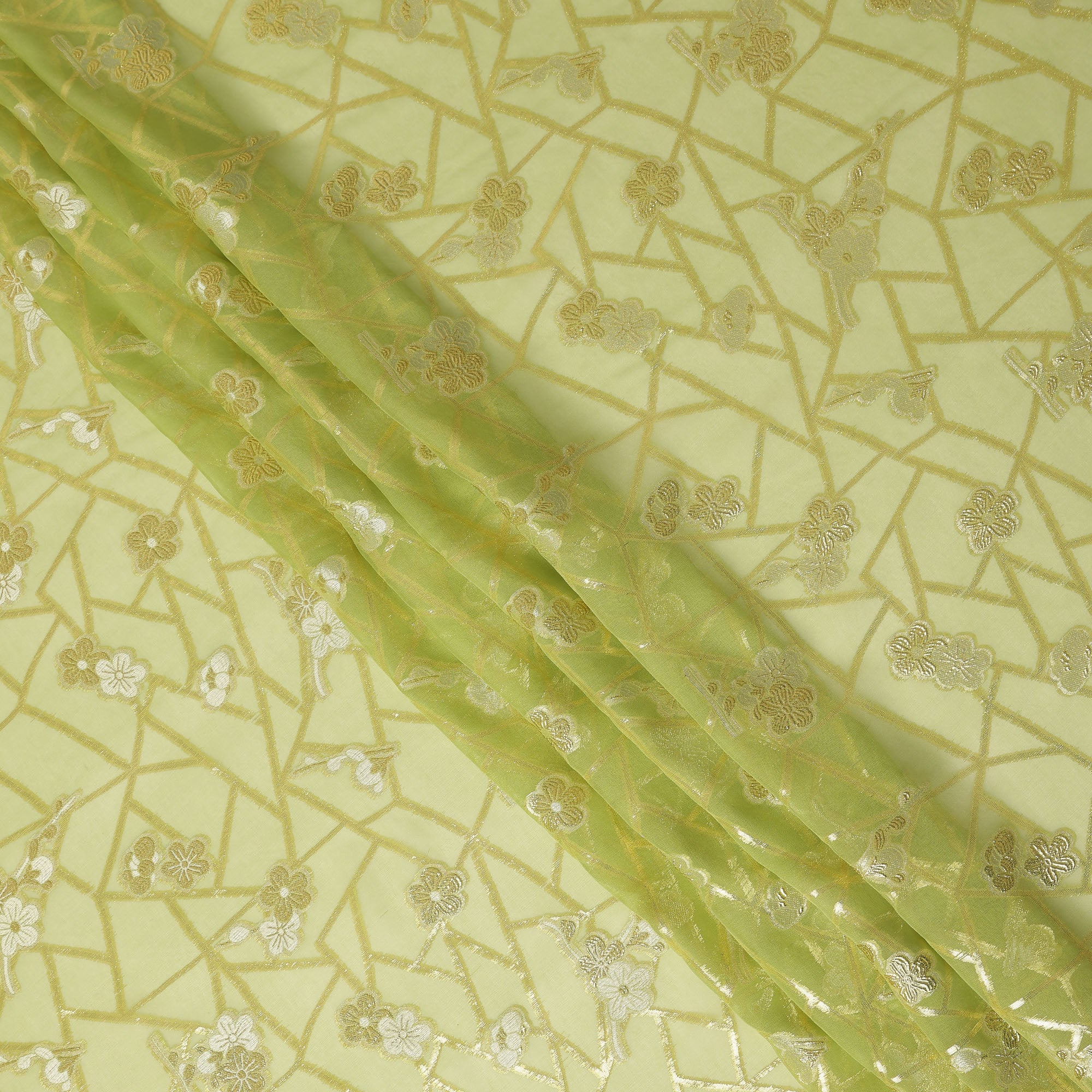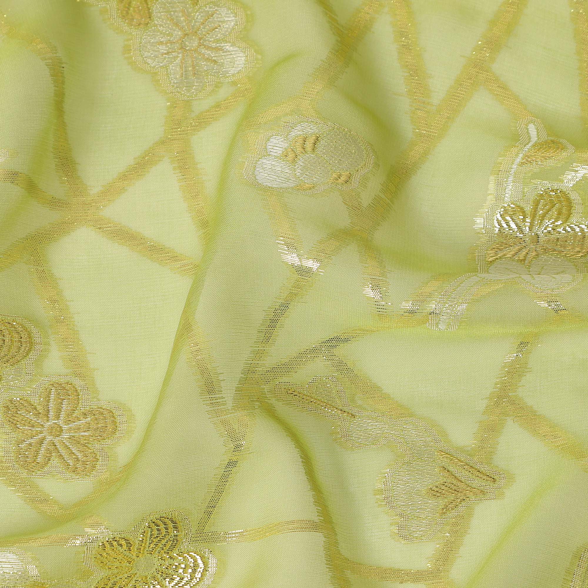 Pistachio Green Gold Floral Geometric Metallic Lurex Silk Chiffon Fabric 110 Cms South Korea Origin-D27546