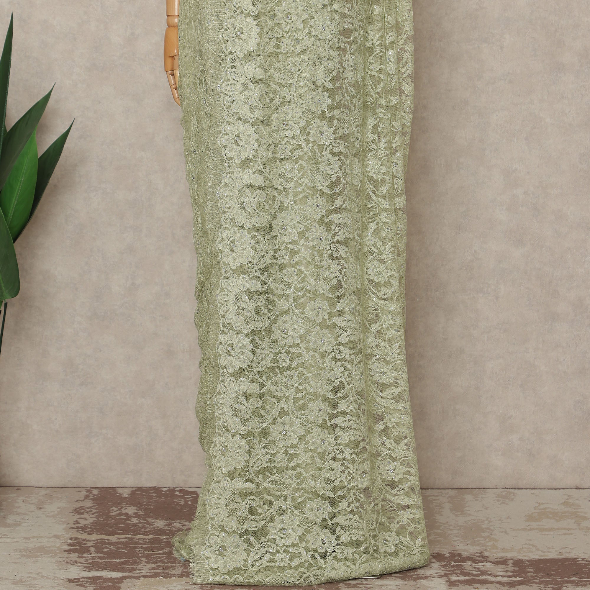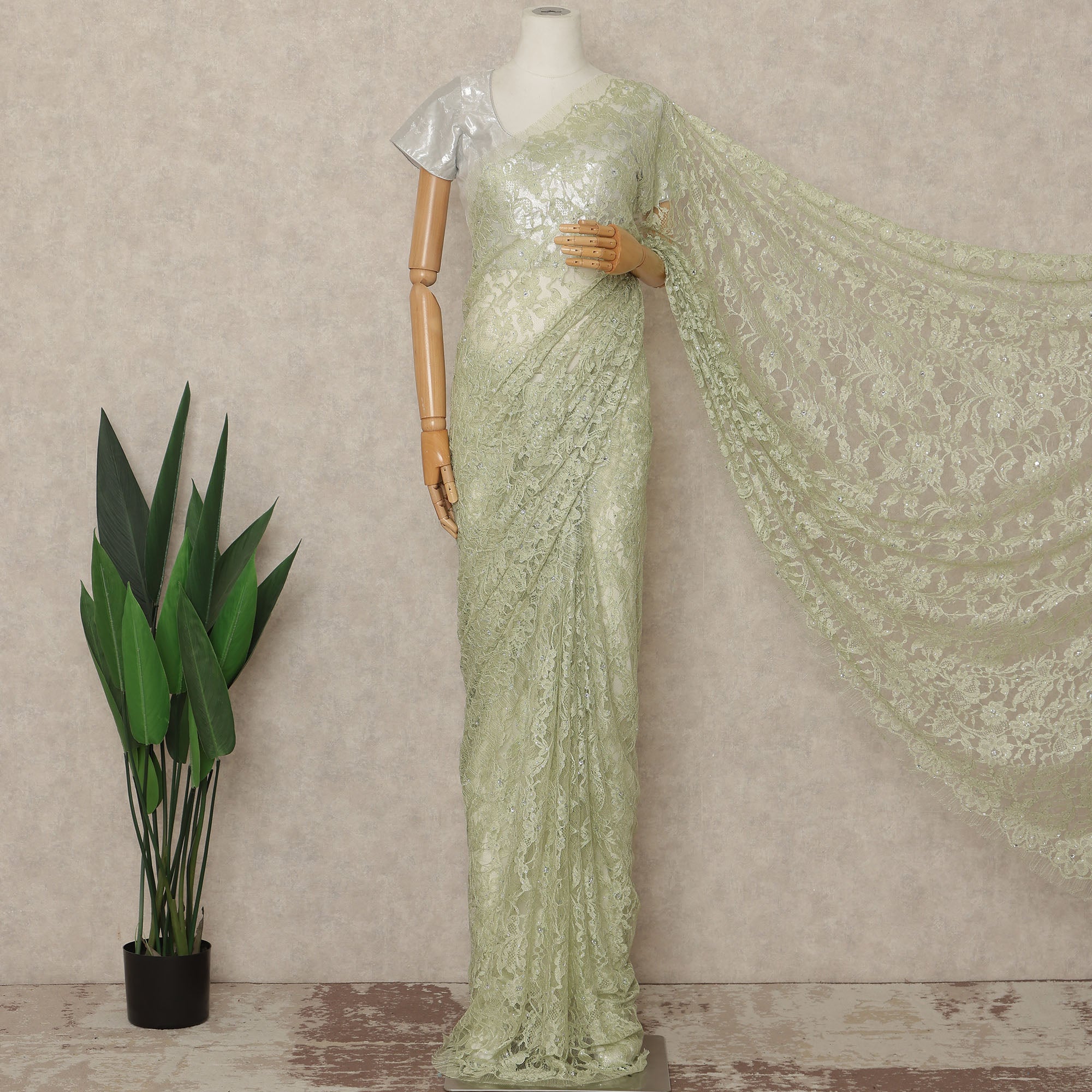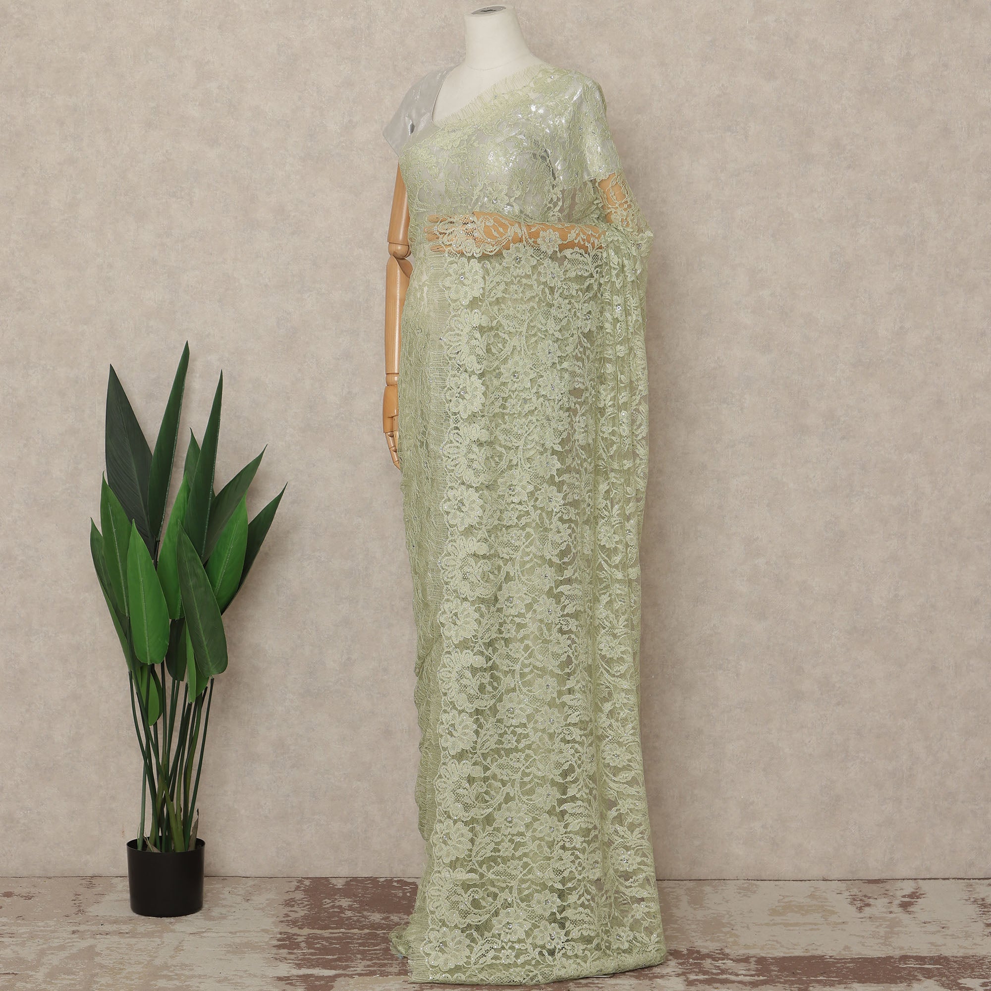 This pistachio green premium French Chantilly saree lace with stone work is designed for women, designers, and boutiques seeking soft elegance with refined detailing. Crafted in France, the intricate floral Chantilly net is enhanced with delicate stone embellishments that add a gentle sparkle without overpowering the lace’s natural beauty. Supplied as a single continuous piece of approximately 5.5 meters with a generous 110 cms width, it allows graceful draping and seamless pleating for sarees and couture creations. Lightweight, breathable, and luxurious, this lace is ideal for weddings, receptions, and formal occasions. Blouse not included.