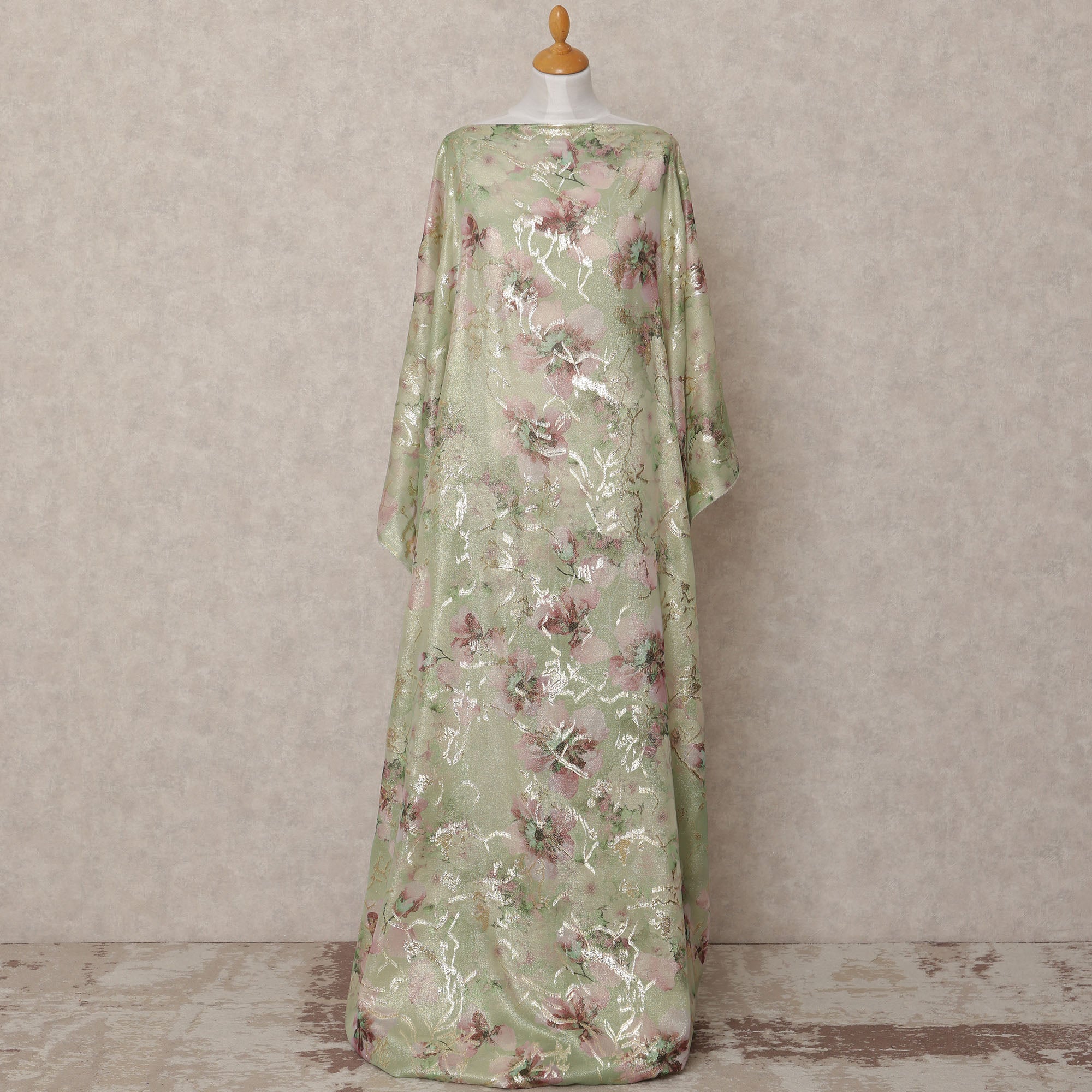 Pistachio Green Traditional Somali Silk Chiffon Dirac Fabric with Metallic Lurex Floral Design, 3.5 Mtrs Piece, Width 140 Cms, Made in South Korea-D26522