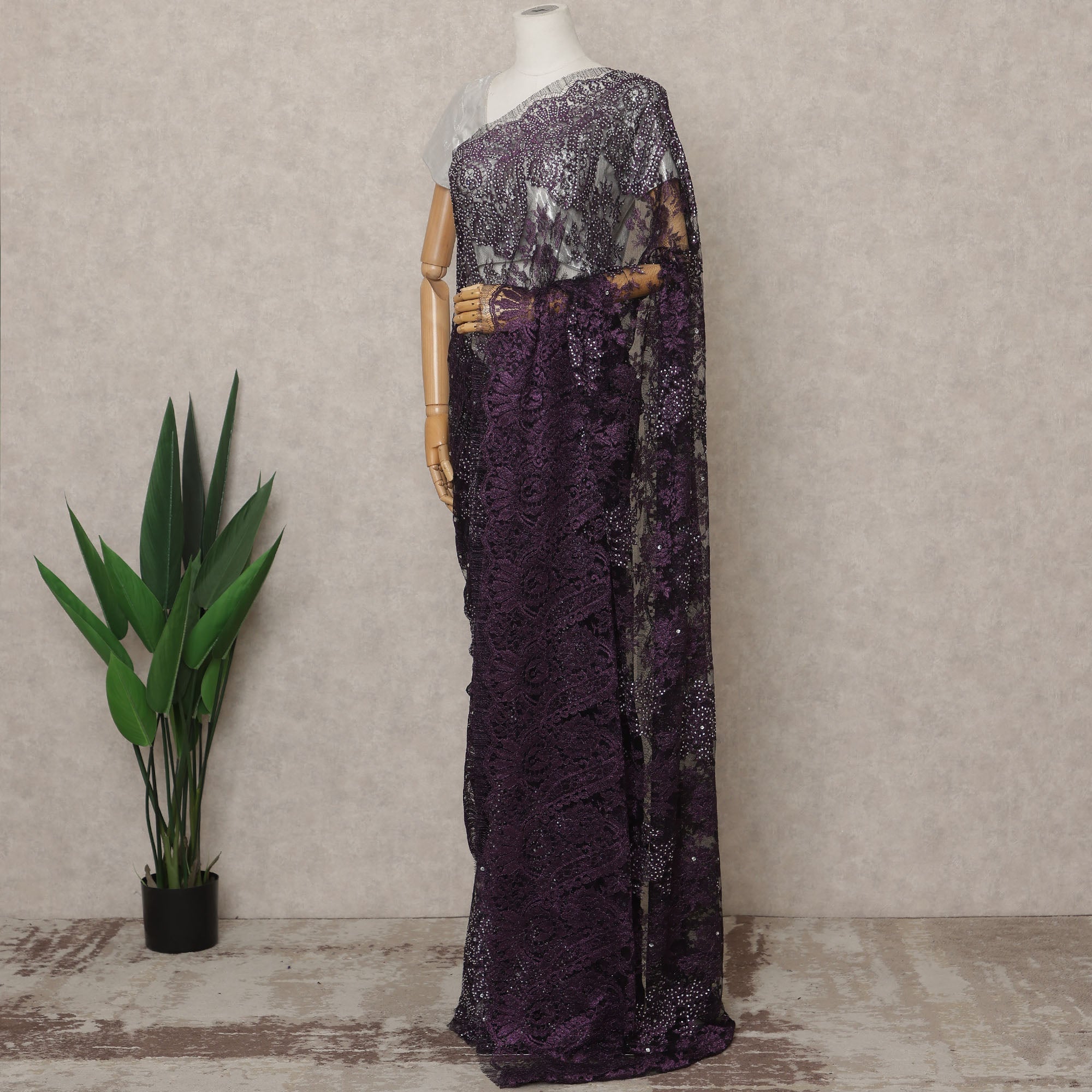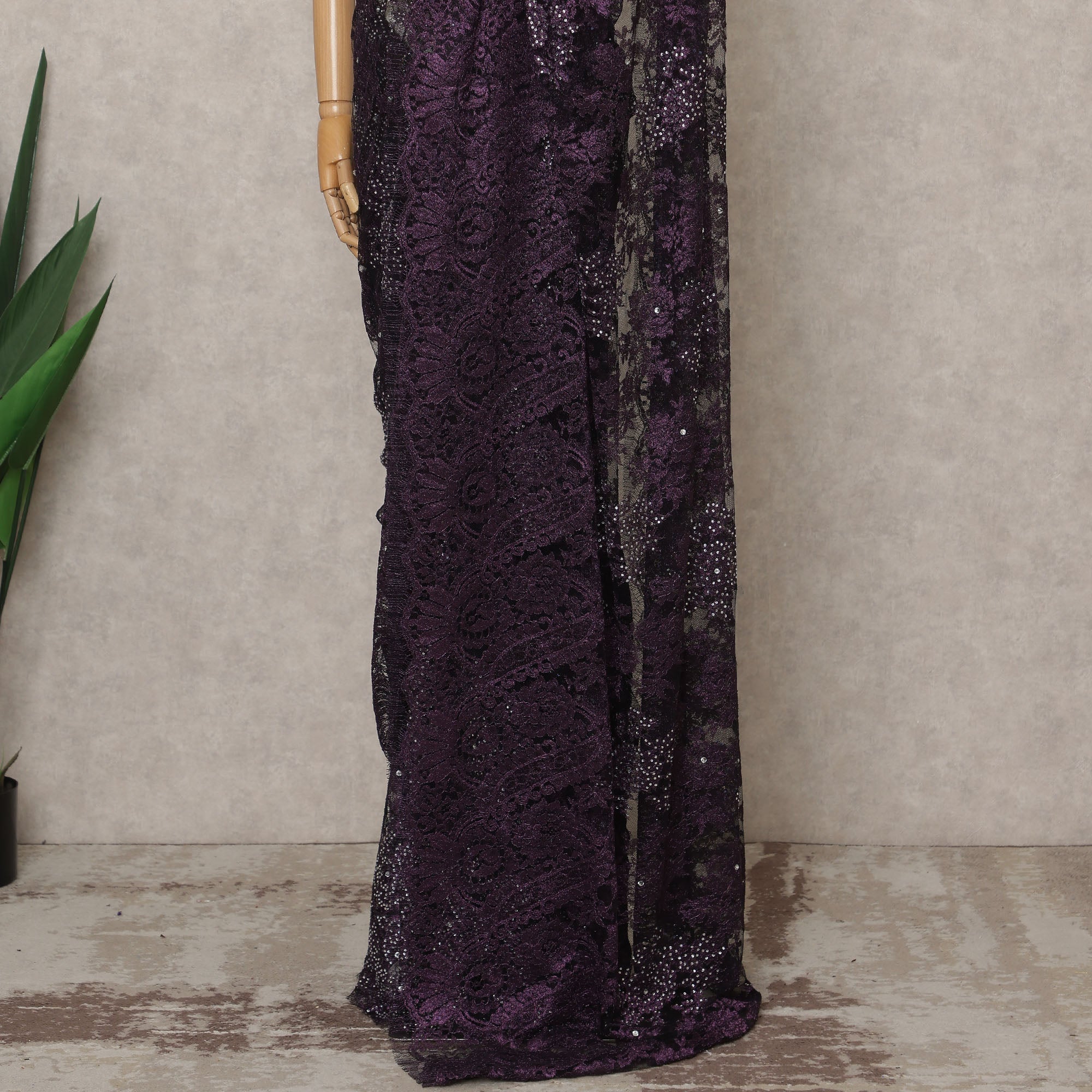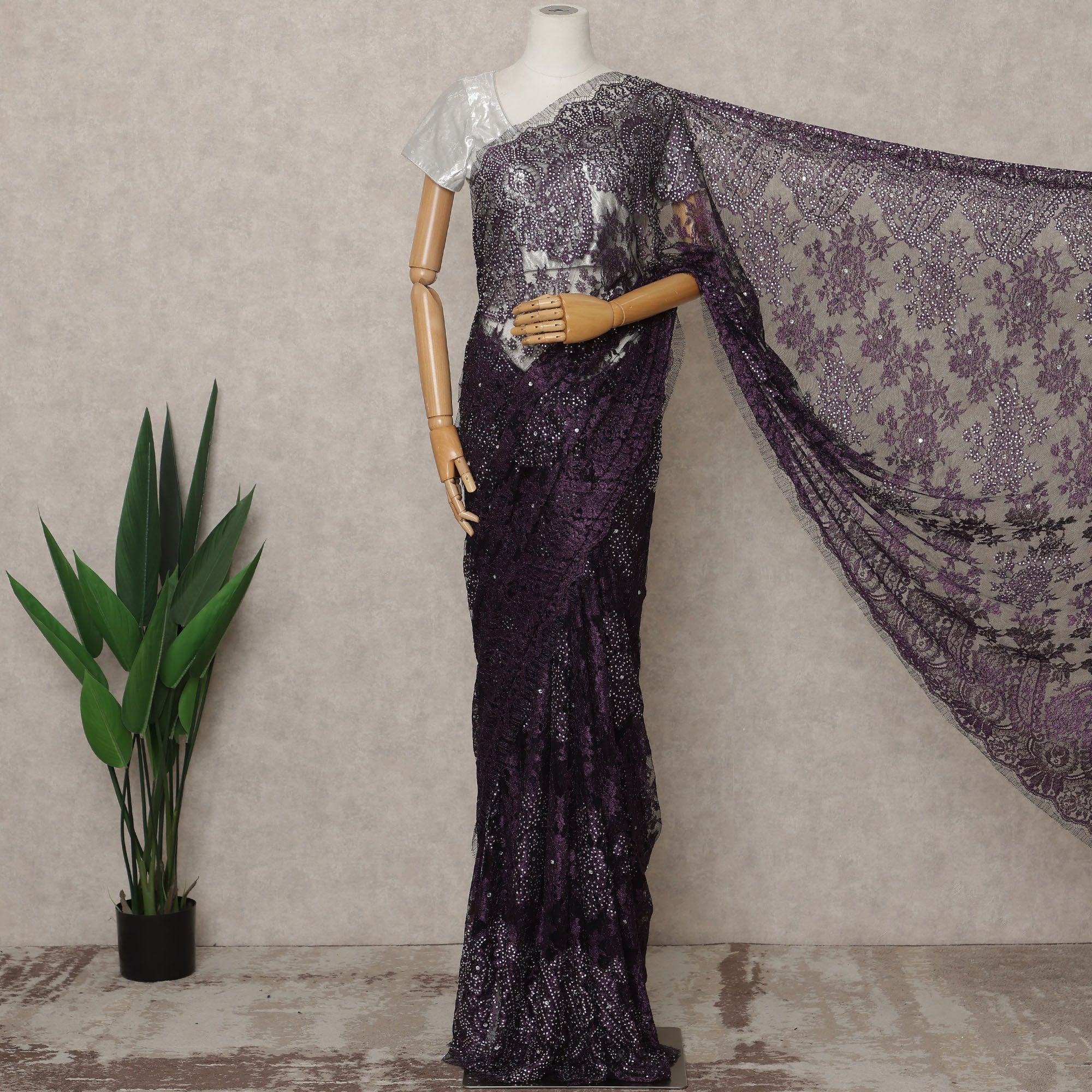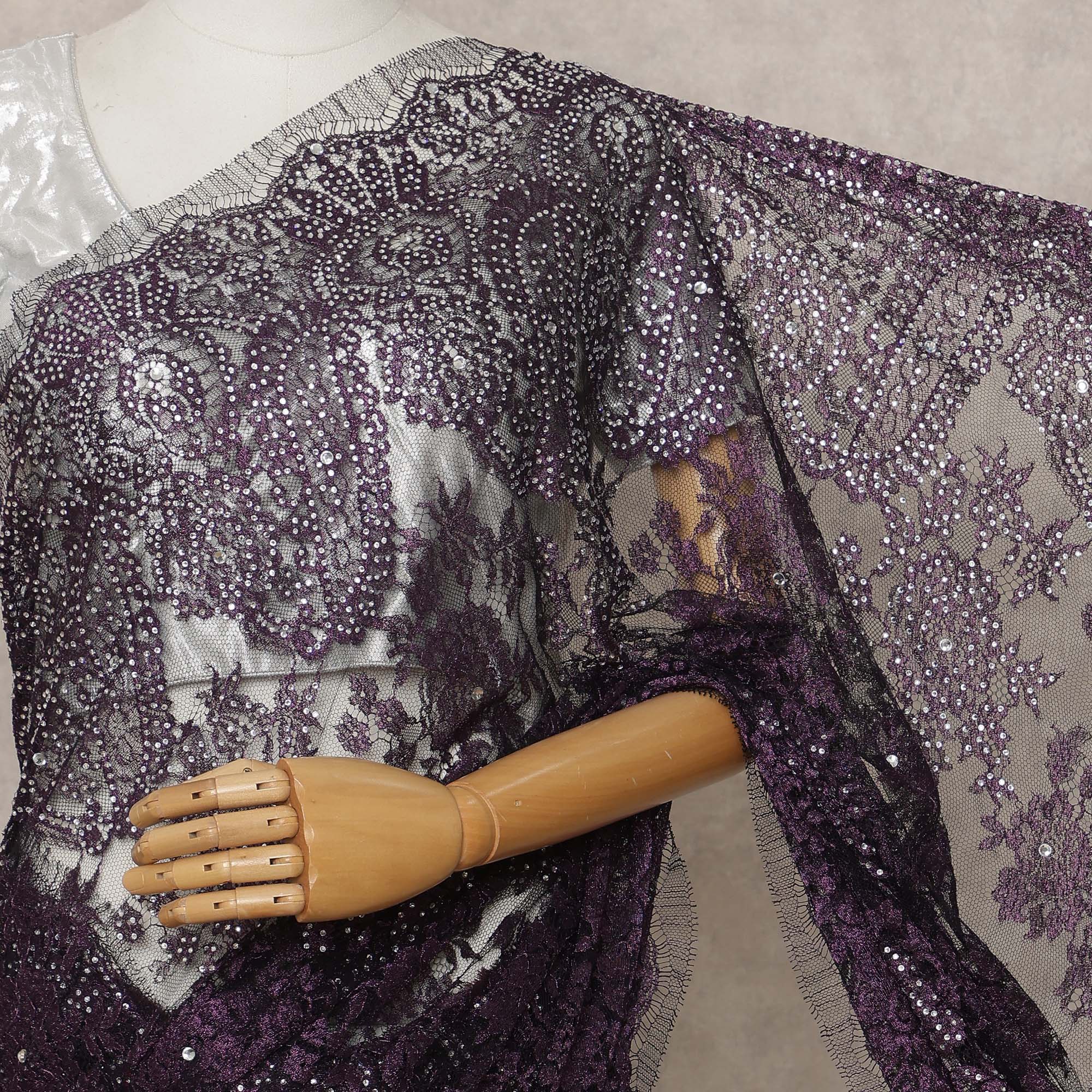 ساري فرنسي فاخر من الدانتيل الشانتيلي المعدني باللون البرقوقي مع تطريز حجري، عرض 110 سم، 5.5 متر، فرنسا - D25569