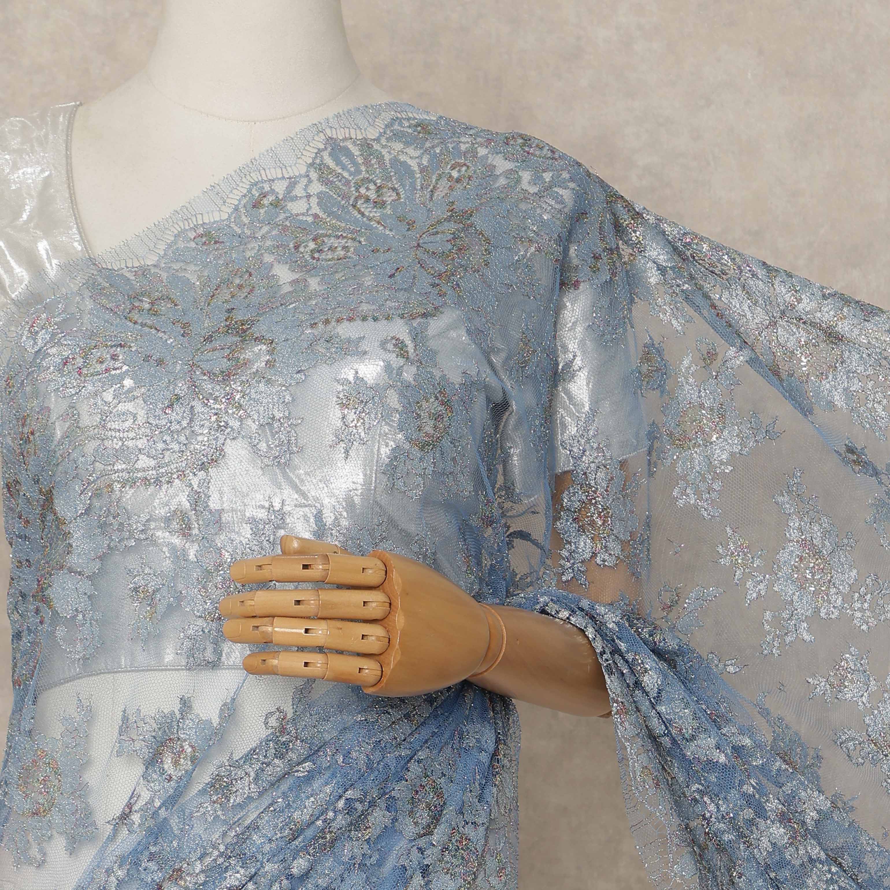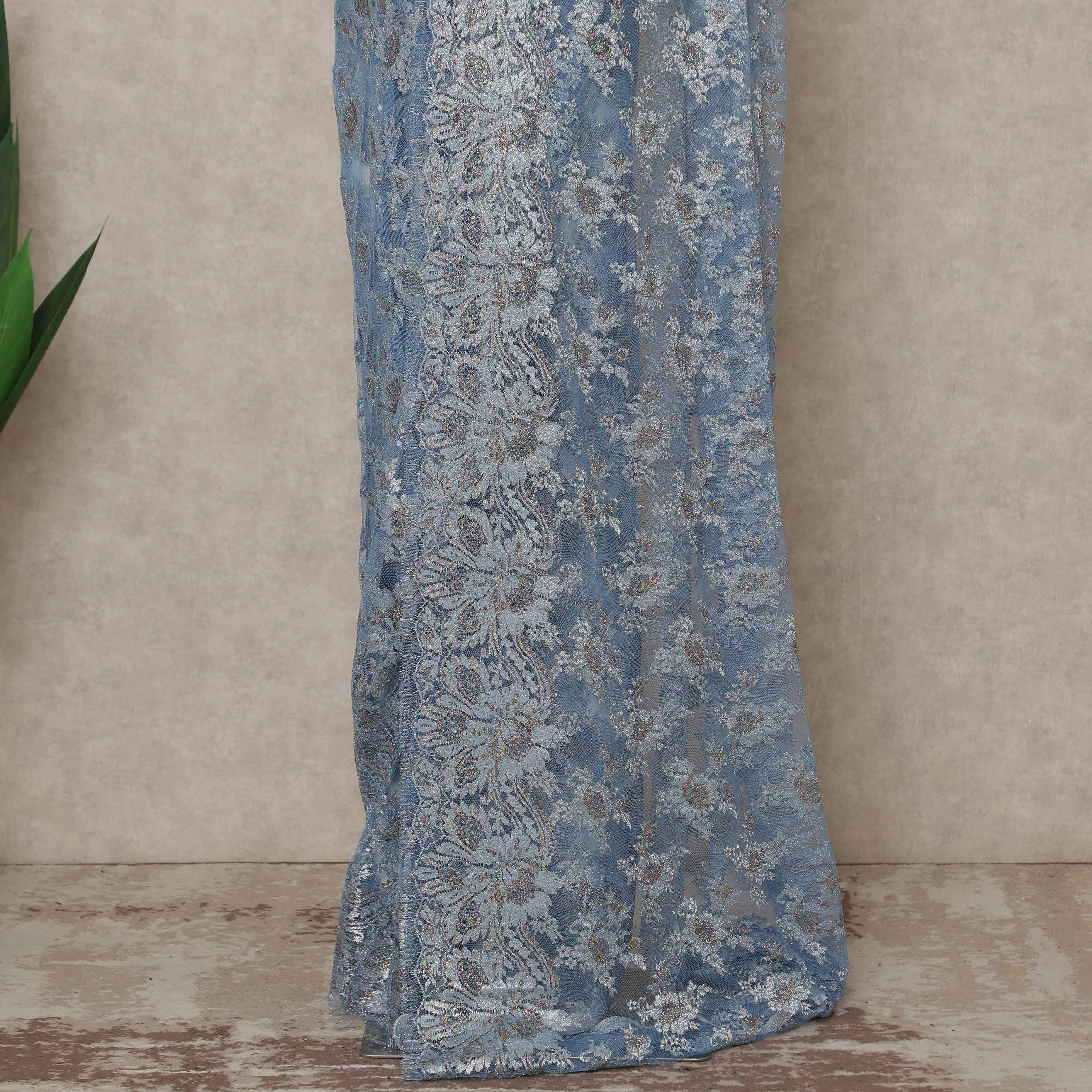 Powder Blue Premium French Metallic Chantilly Saree Lace 5.5 Mtrs Length 110 Cms Width Designer Net Fabric Made In France, Blouse Not Included-D28122