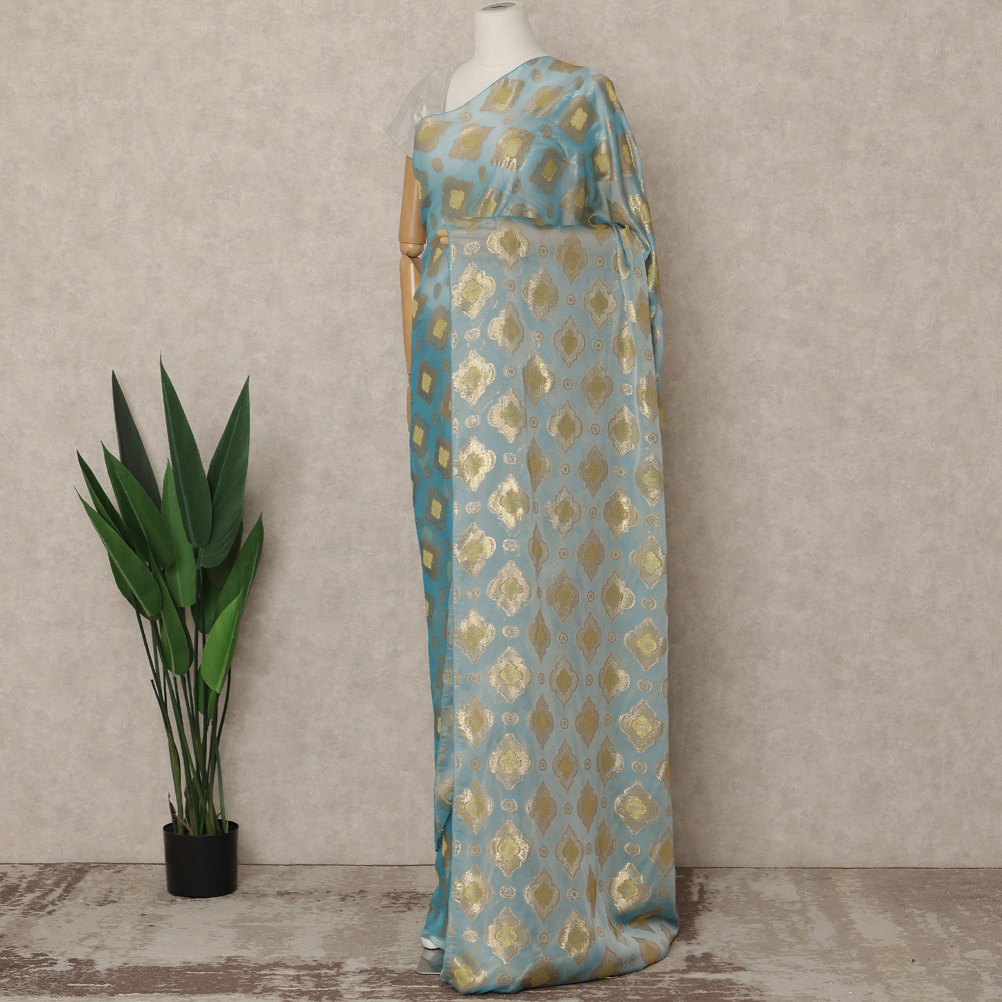 This premium French silk chiffon saree in a soft powder blue shade features elegant gold woven geometric motifs that add a refined shimmer and contemporary charm. Crafted from high-quality chiffon sourced from France, the fabric is lightweight, airy, and fluid, ensuring a graceful fall and effortless drape throughout the day. The subtle contrast of powder blue and gold makes this saree ideal for weddings, festive occasions, receptions, and elegant evening gatherings. With an approximate length of 5.5 meters and a width of 110 cms, it provides ample fabric for neat pleats and versatile draping styles while maintaining comfort and sophistication. Blouse piece is not included, allowing you to pair it with a blouse of your choice for a personalized look.