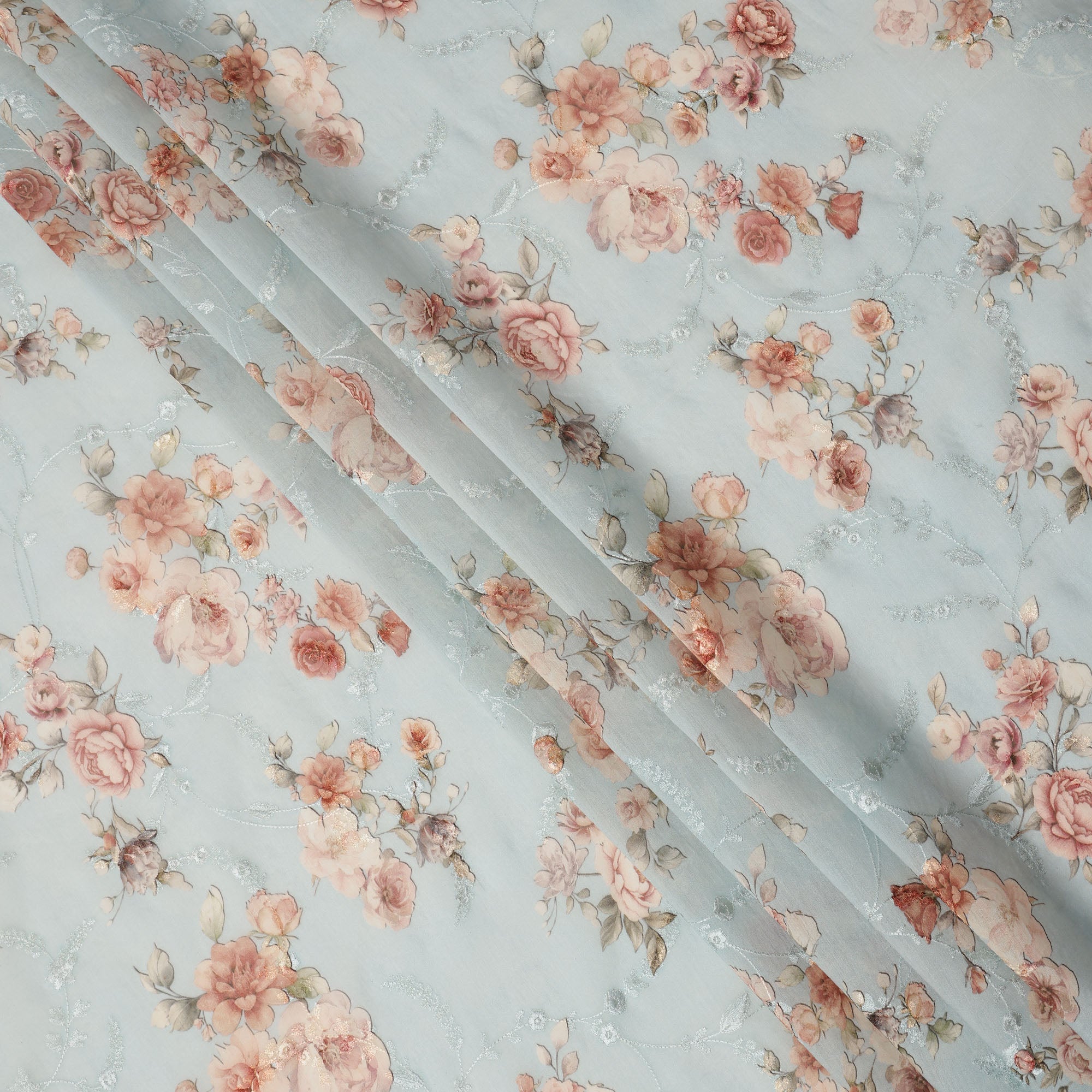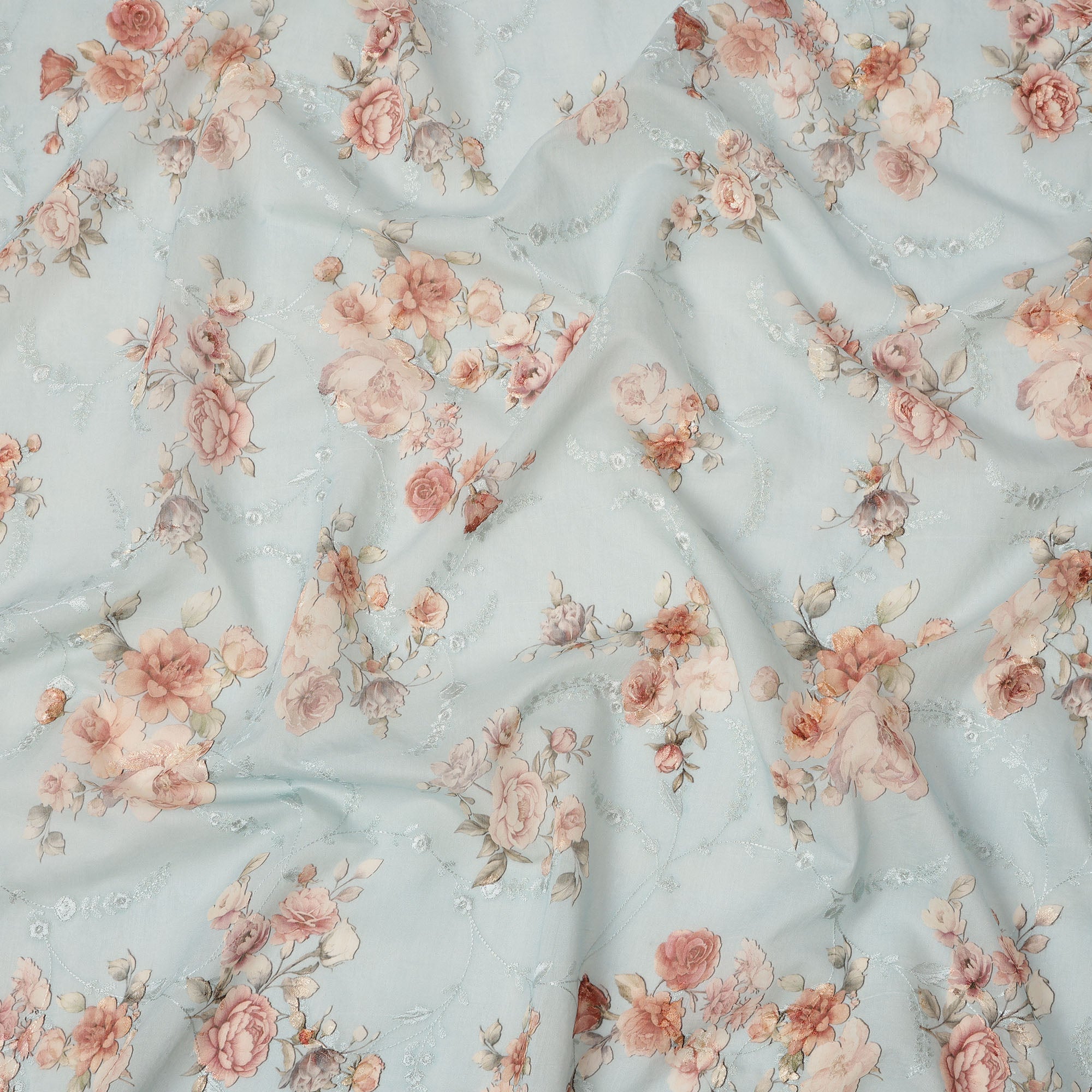 قماش فوال قطني مطبوع عليه زهور وردية زرقاء فاتحة مع لمسات من الترتر الرقيق، عرض 110 سم، صنع في الهند - D24255