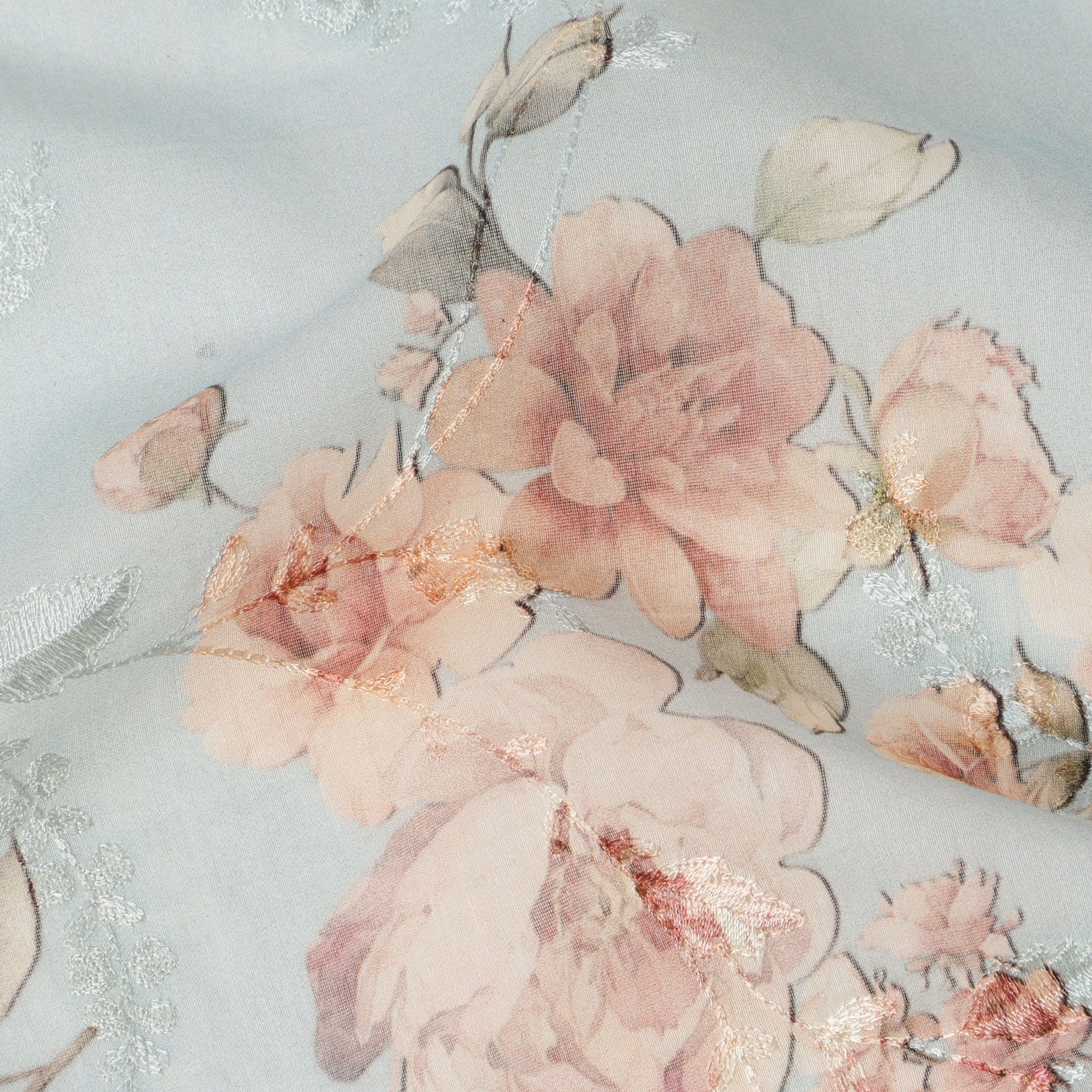 قماش فوال قطني ناعم وخفيف، بلون أزرق فاتح، يتميز بطبعة زهور رقيقة تغطيه بالكامل مع ورود بألوان الوردي الخوخي والخوخي... اقرأ أكثر اقرأ أكثر