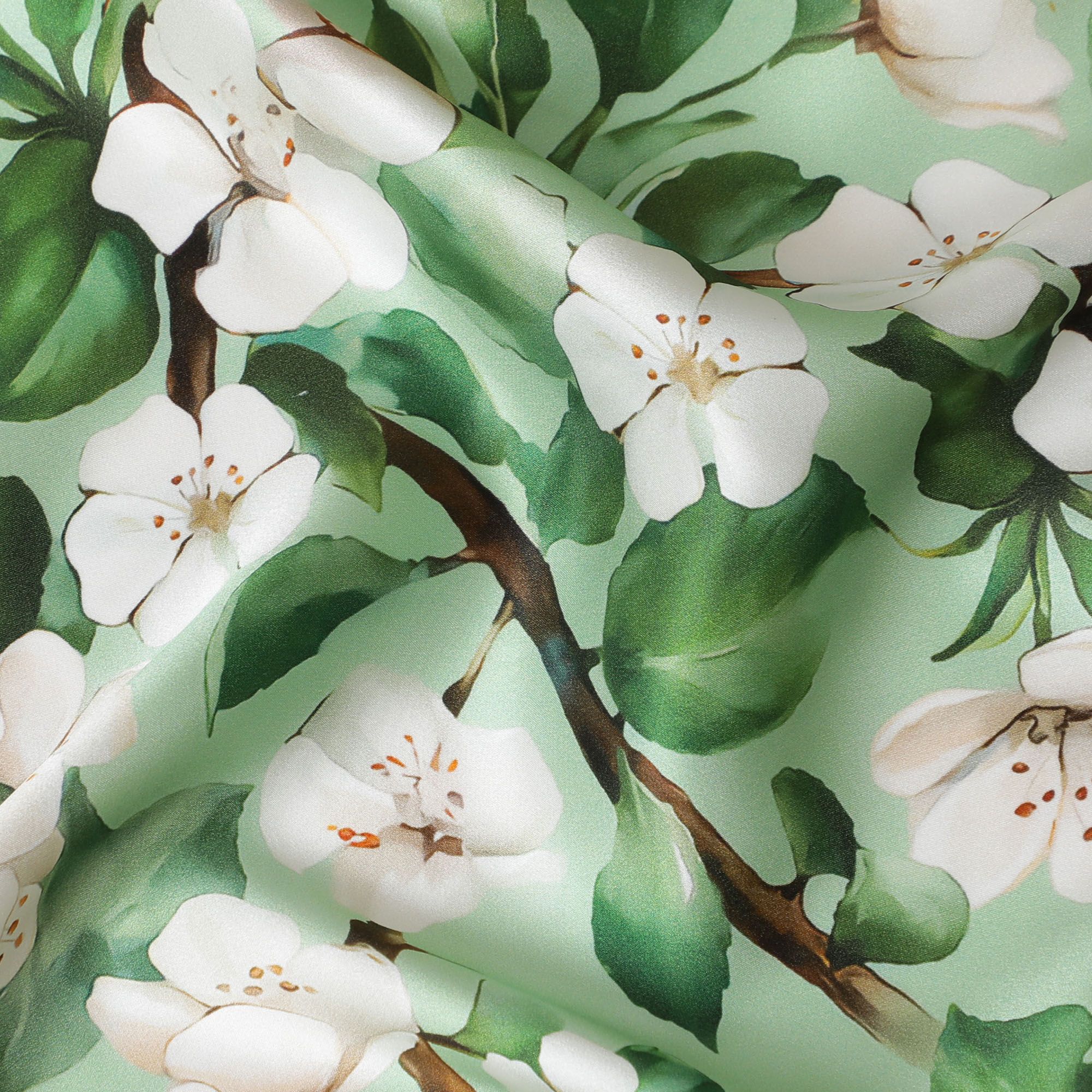 استمتع بلمسة الطبيعة والأناقة مع قماش الساتان الحريري الخالص الإيطالي الصنع، والذي يعرض قماشًا أخضر فاتحًا هادئًا مزينًا بأزهار بيضاء... اقرأ أكثر اقرأ أكثر