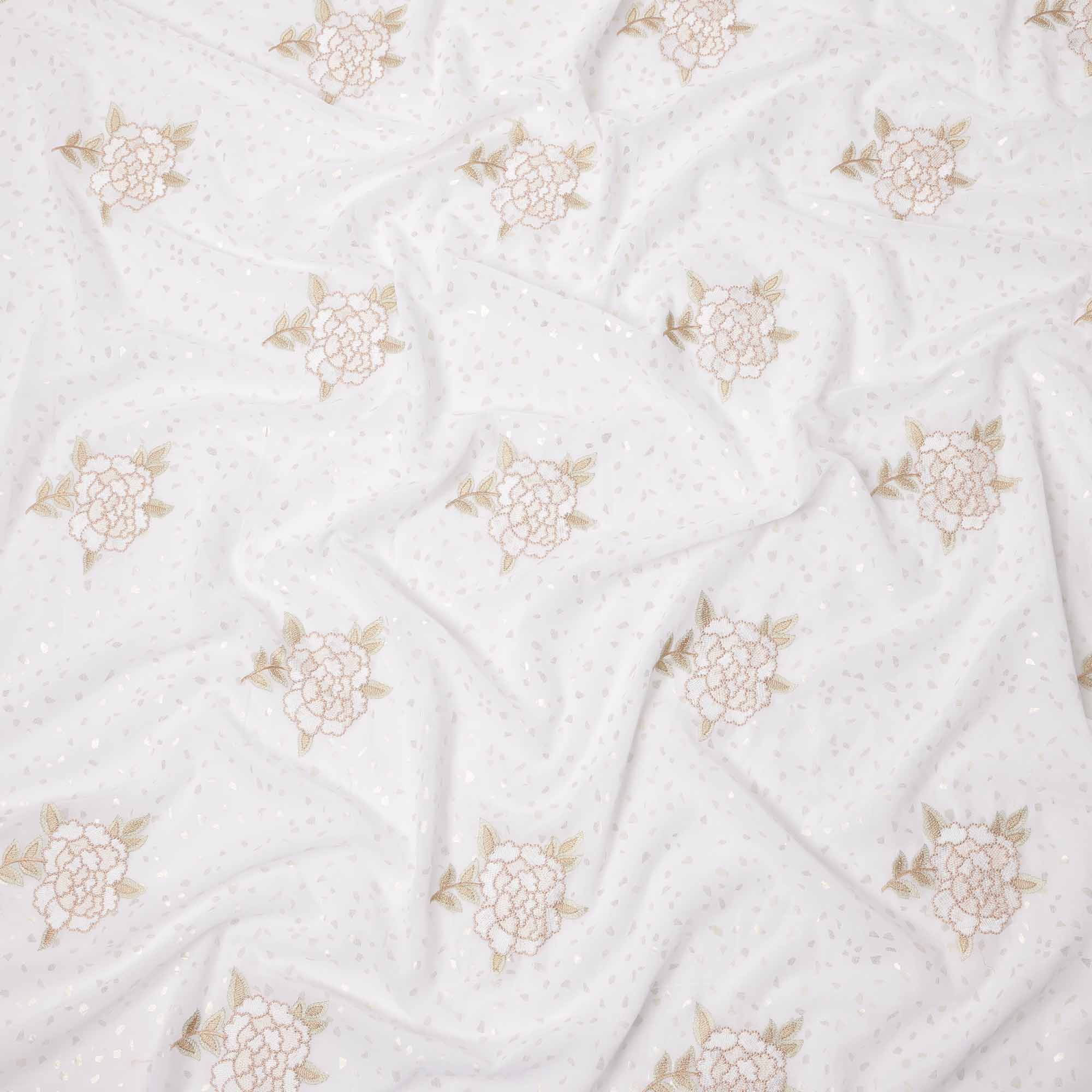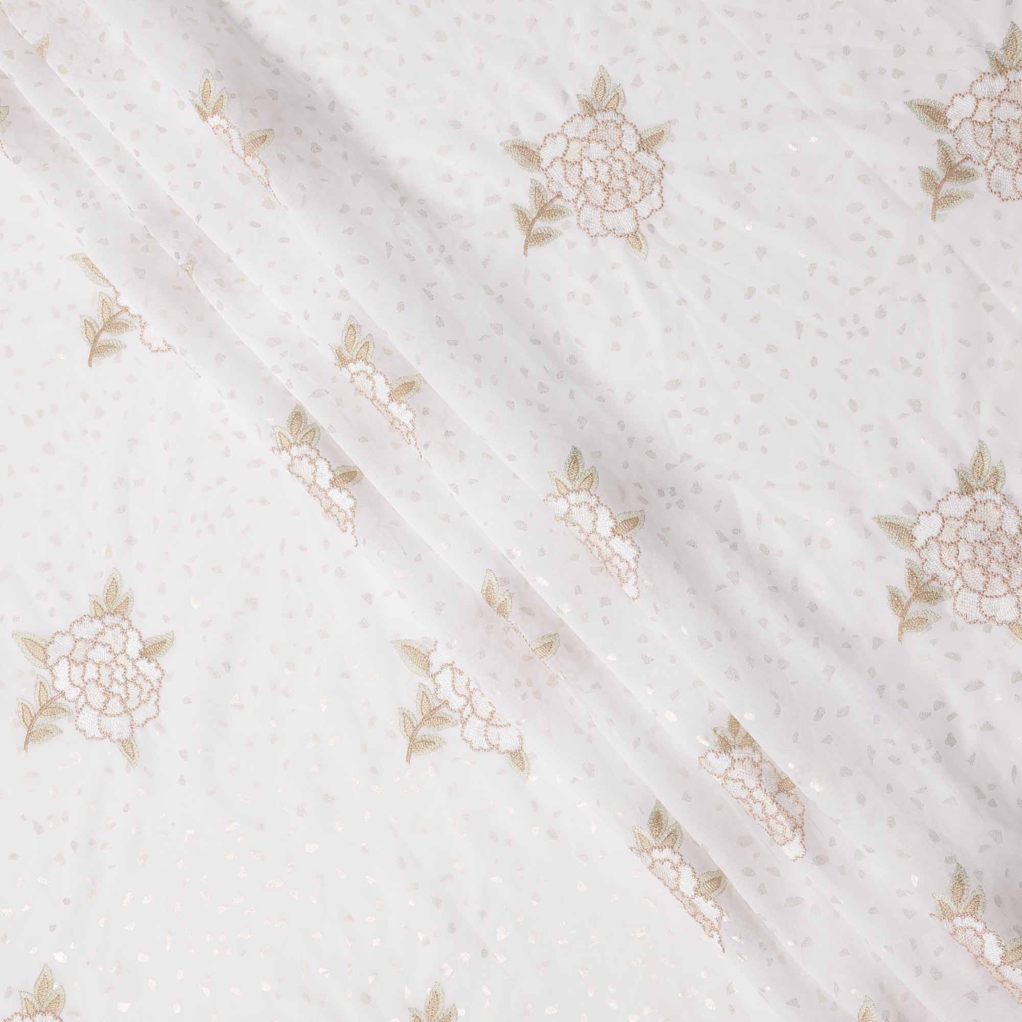 هذا القماش القطني الفوال الأبيض النقي مزين بزخارف نباتية مطرزة بدقة بخيوط ناعمة باللونين البيج والذهبي، معززة بترتر متناثر رقيق... اقرأ أكثر اقرأ أكثر
