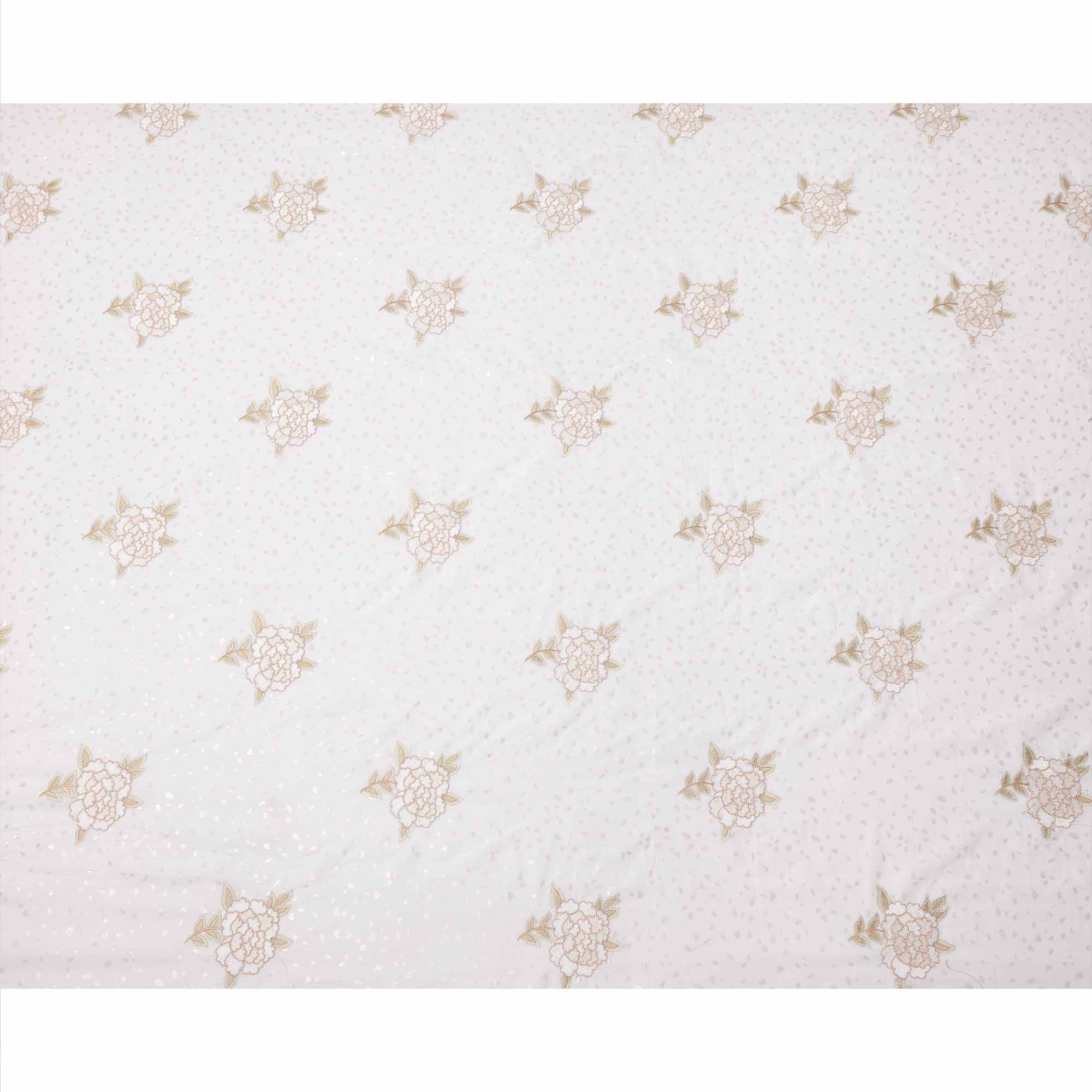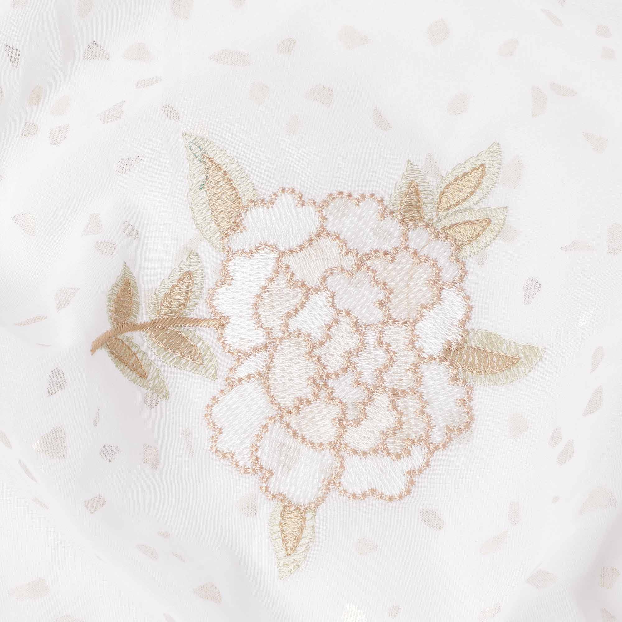 قاعدة من قماش الفوال القطني الأبيض النقي مع تطريز زهري أنيق باللونين البيج والذهبي