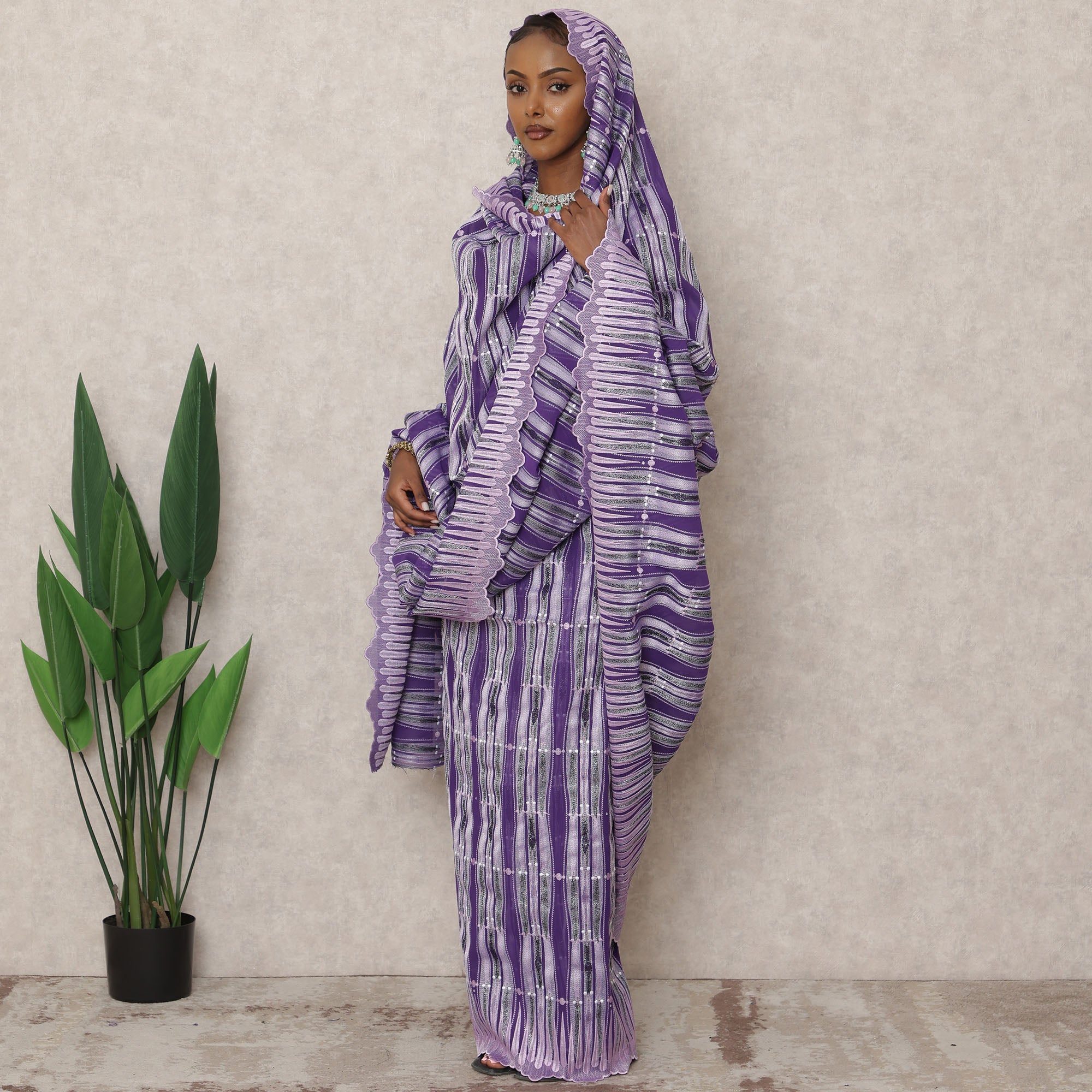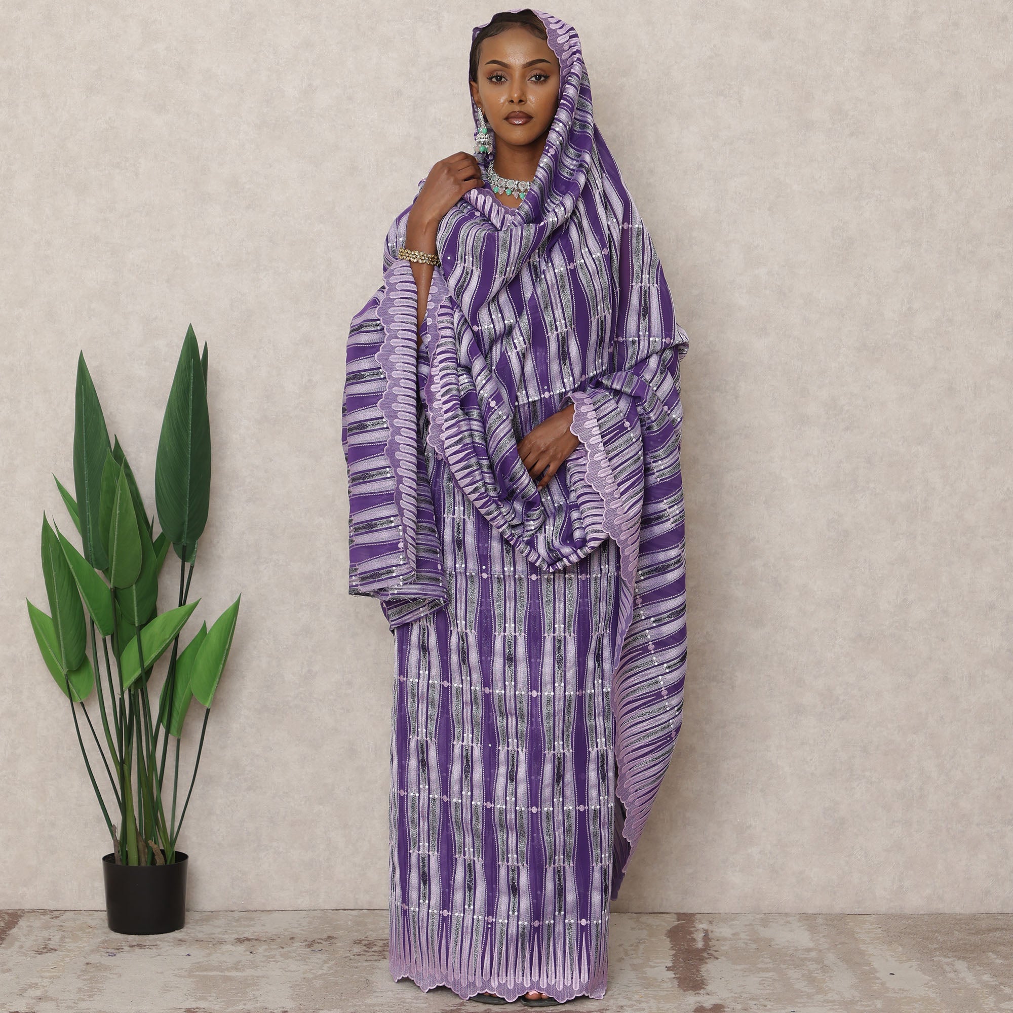 يمزج هذا الثوب السويسري الأرجواني والليلكي ببراعة بين التراث والألوان الغنية، ليضفي أناقة راقية على الزي السوداني. مصنوع من قماش فوال قطني خالص فاخر، يتميز بخطوط عمودية متناسقة بشكل جميل، معززة بتطريز متقن وزخارف حجرية رقيقة تتألق مع الحركة. تضفي الحواف المزخرفة باللون الليلكي نعومة على التصميم المهيكل، مما يجعل هذه القطعة، التي يبلغ طولها 4.5 متر، مثالية للاحتفالات الثقافية والمناسبات الرسمية. بفضل نسيجه المسامي ولمسته السويسرية الفاخرة، يضمن الراحة دون المساس بالفخامة. هذا الثوب هو تعبير خالد عن الجمال العرقي والرقي متعدد الاستخدامات - مثالي للشراء عبر الإنترنت لحفلات الزفاف والاحتفالات والتجمعات الخاصة.