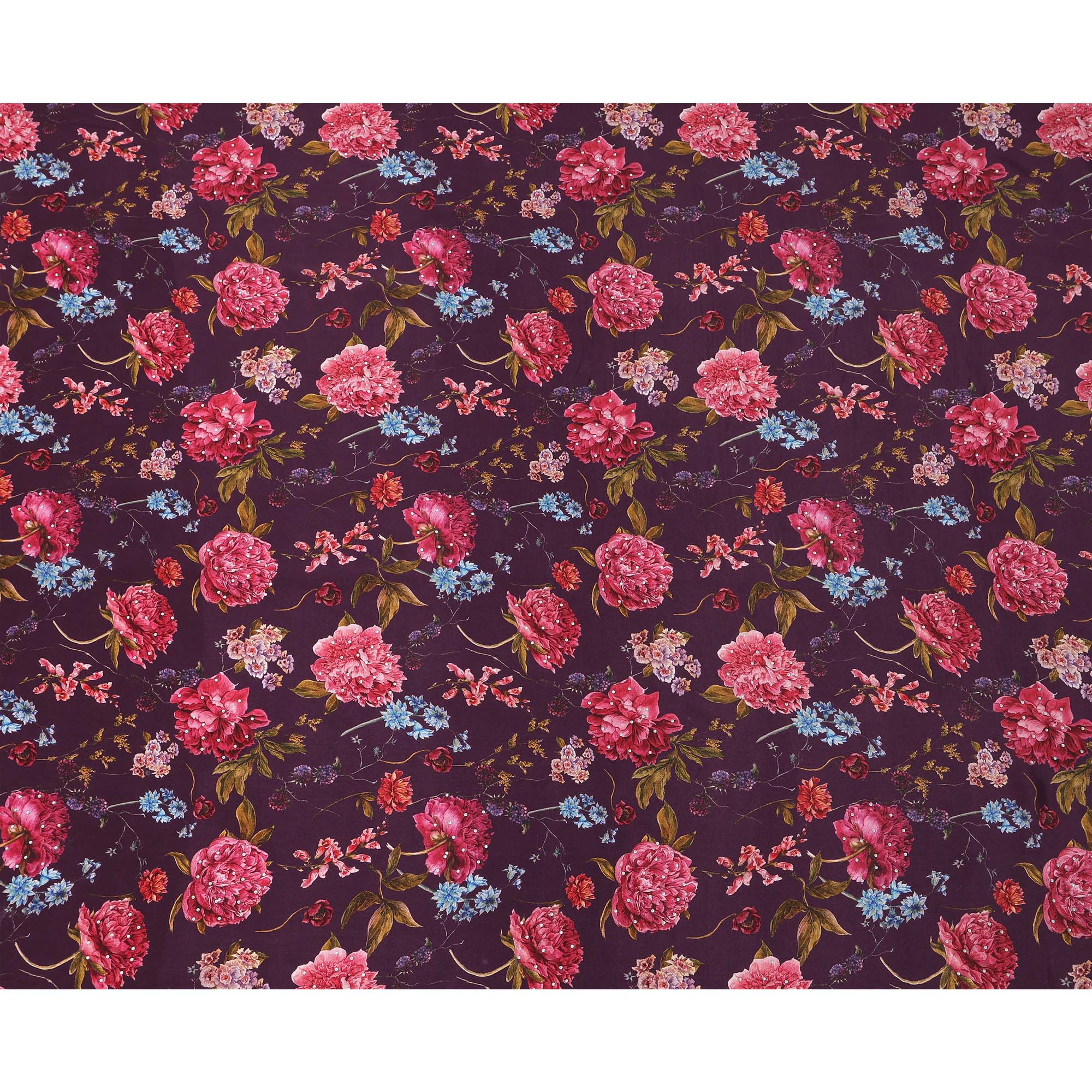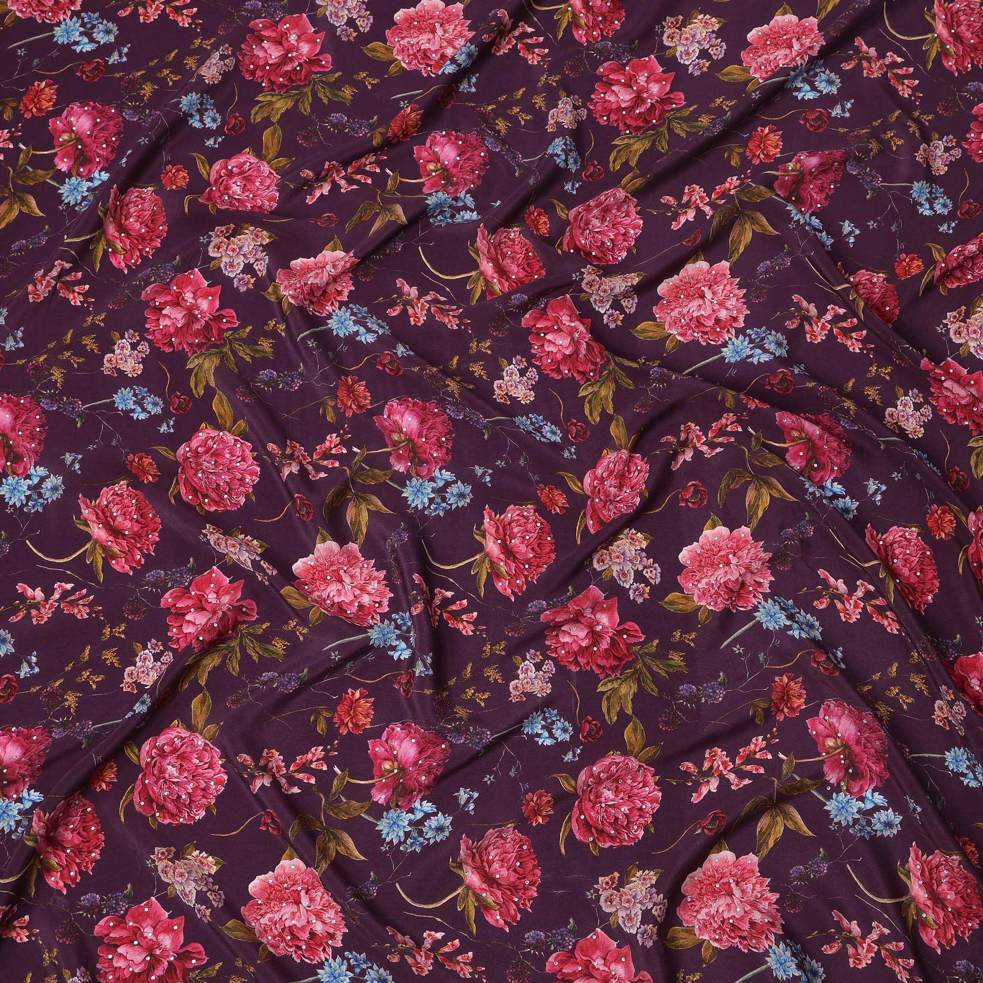• Purple Red Floral Pattern Pure Silk Crepe Fabric with Stone Work, Width 110 Cms, Made in India-D26074