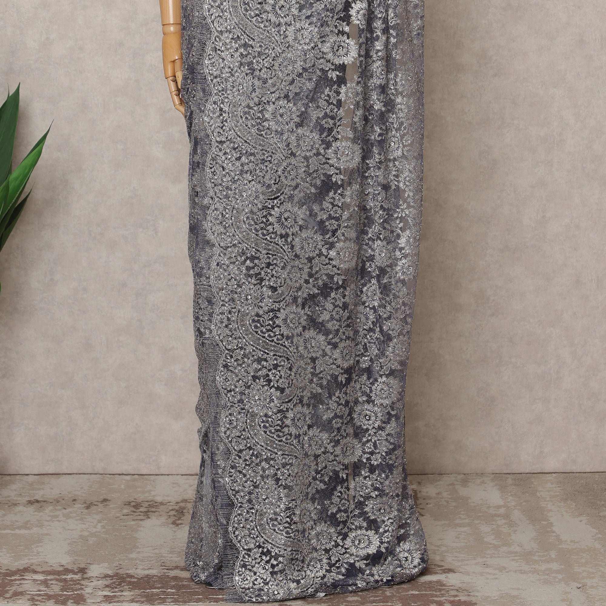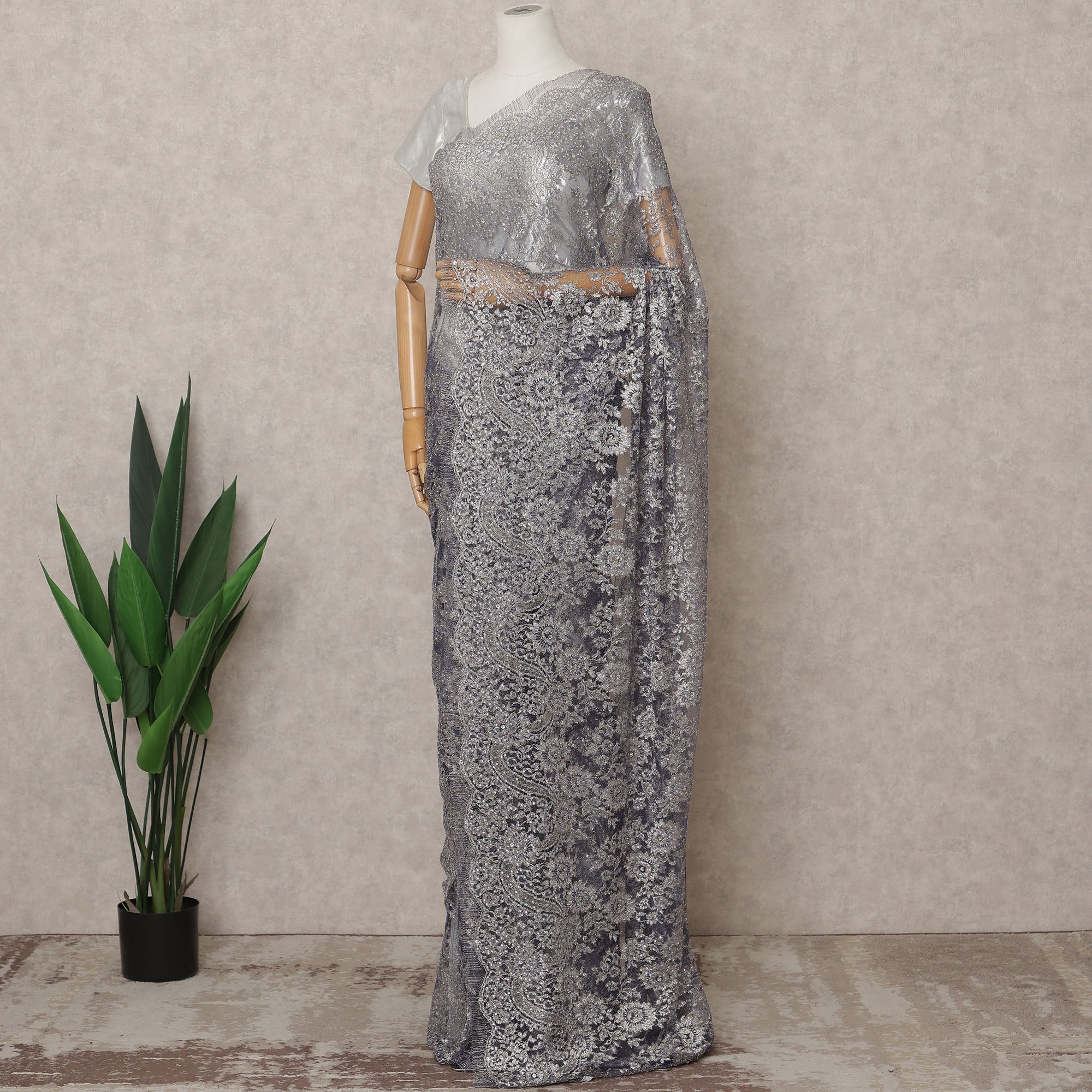 The Purple Silver Premium French Metallic Chantilly Lace Saree Fabric with Stone Work epitomizes luxury and elegance, blending intricate craftsmanship with modern sophistication. Imported from France, this exquisite lace fabric features finely detailed floral motifs embellished with delicate hand-applied stone work that enhances its metallic shimmer, creating a mesmerizing effect under light. The Purple Silver tone exudes a regal charm, while the authentic Chantilly lace weaving technique ensures a soft, sheer texture that drapes gracefully. Measuring 5.5 meters in length and 110 cms in width, it offers ample fabric for designing a complete saree or high-end couture ensemble. Lightweight yet richly textured, this fabric is perfect for bridal, festive, and designer creations that demand finesse and grandeur. Its blend of metallic threads and sparkling embellishments makes it a showstopper for any special occasion. Blouse piece not included. To maintain its intricate detailing and lustrous appeal, dry clean only and store in a cool, dry place. Shop online now to own this masterpiece of French lace artistry.