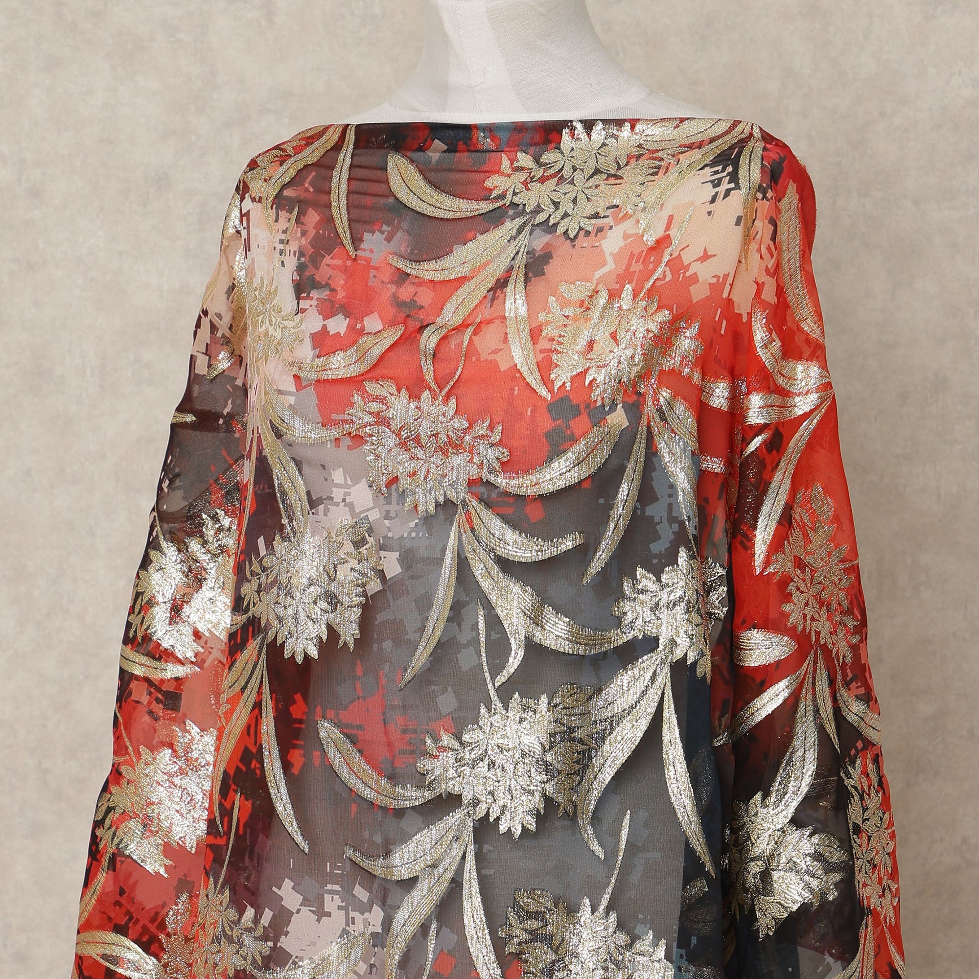 Red Black Multicolor Traditional Somali Silk Chiffon Dirac Fabric with Metallic Lurex, 3.5 Mtrs Length, 140 Cms Width, Made in South Korea-D26407