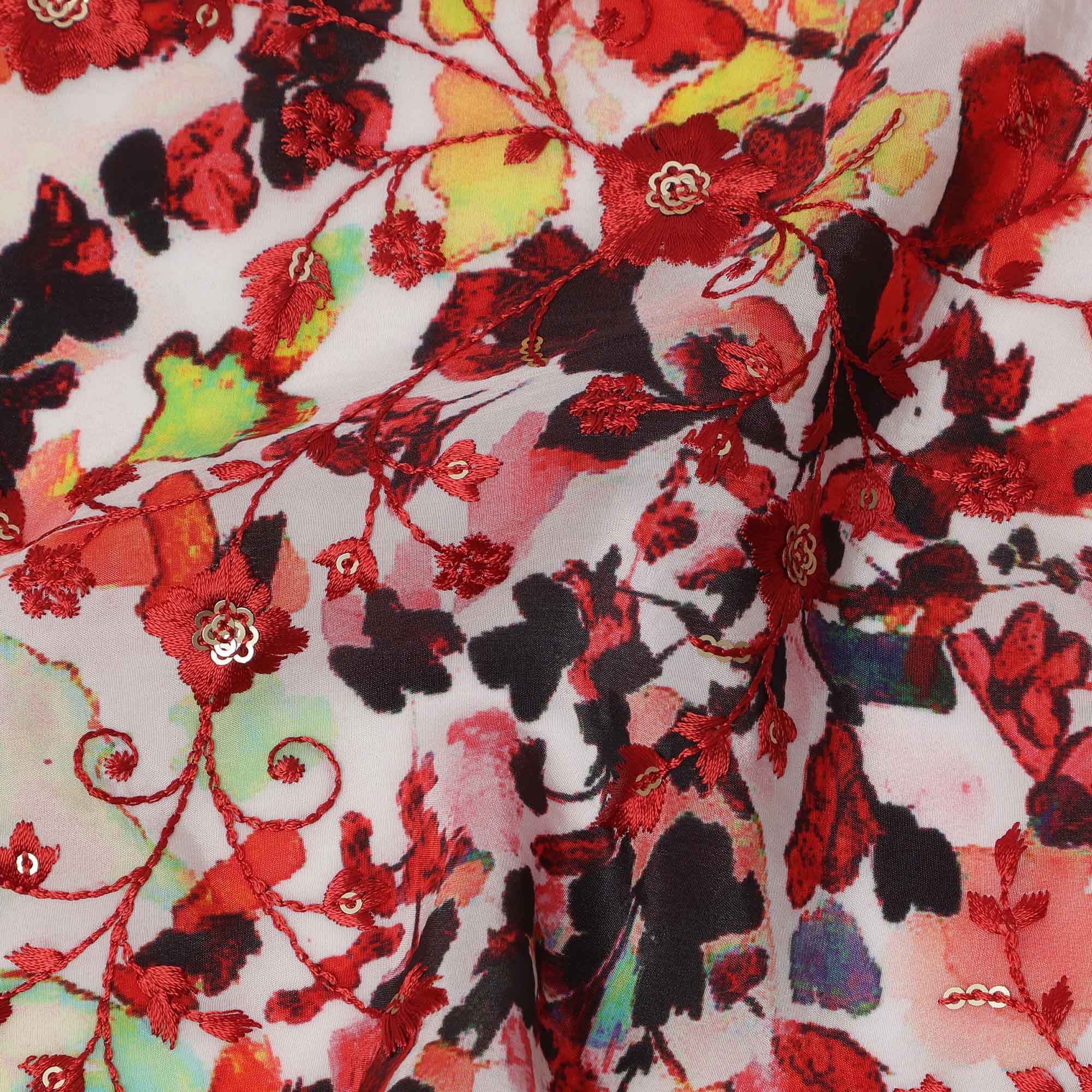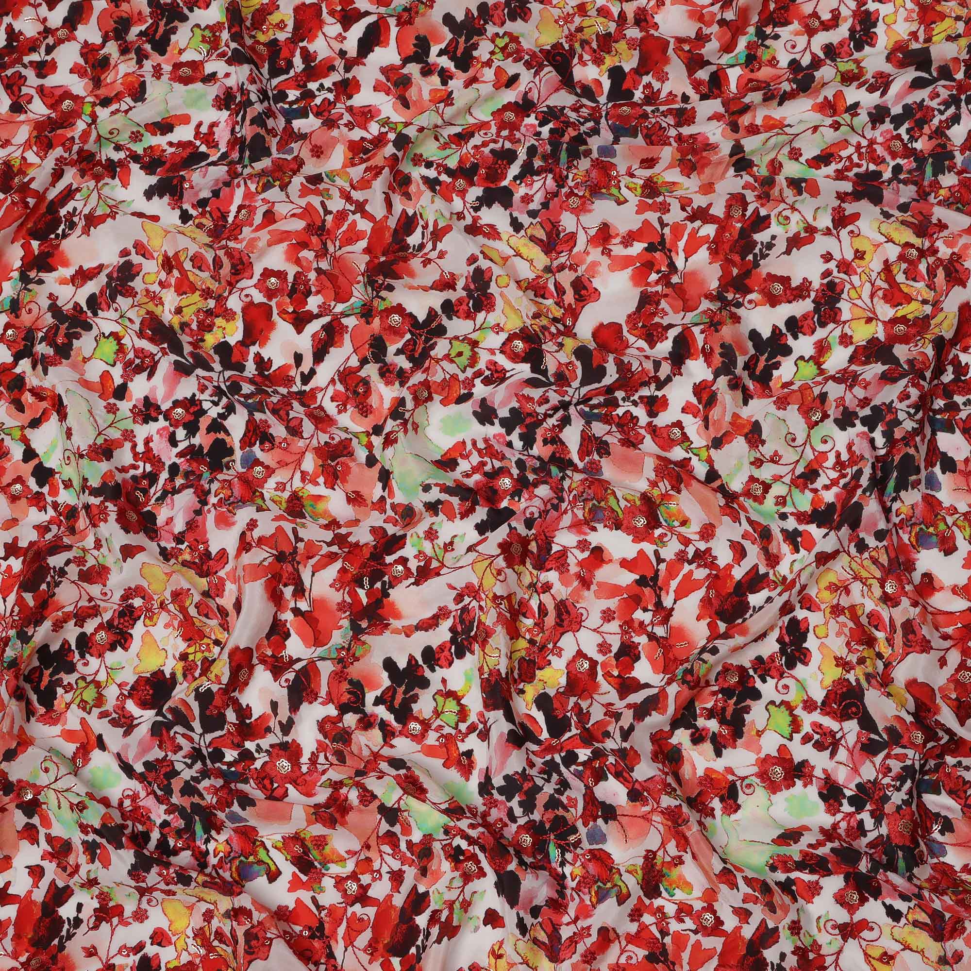هذه الطبعة الزهرية المجردة ذات اللون الأحمر على قماش كريب فيسكوز أبيض القاعدة، تنبض بحيوية فنية، تجمع بين الأحمر الناري والأحمر الداكن ولمسات رقيقة من الأسود والأخضر. يُقدم التصميم النباتي المطبوع رقميًا بتدفق يشبه الألوان المائية، مستحضرًا إحساسًا بالزهور المرسومة يدويًا بطاقة معبرة. مصنوع من كريب فيسكوز فاخر، يتميز القماش بملمس خفيف الوزن ولمسة نهائية تسمح بمرور الهواء، مما يسمح بسهولة الارتداء وراحة الارتداء طوال اليوم. يبلغ عرضه 110 سم، وهو مثالي للملابس الفضفاضة مثل التنانير وبلوزات الساري والسترات الهندية الغربية أو الملابس العصرية المدمجة. يحافظ السطح على لمعان ناعم مع توفير قوة كافية لخياطة متعددة الاستخدامات. تسوق عبر الإنترنت واحصل على قماش يحتفي بالحرفية الهندية وجماليات النسيج الحديثة.