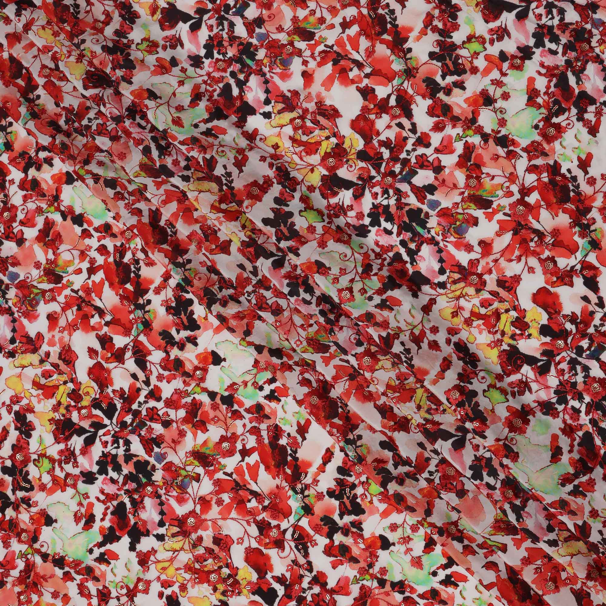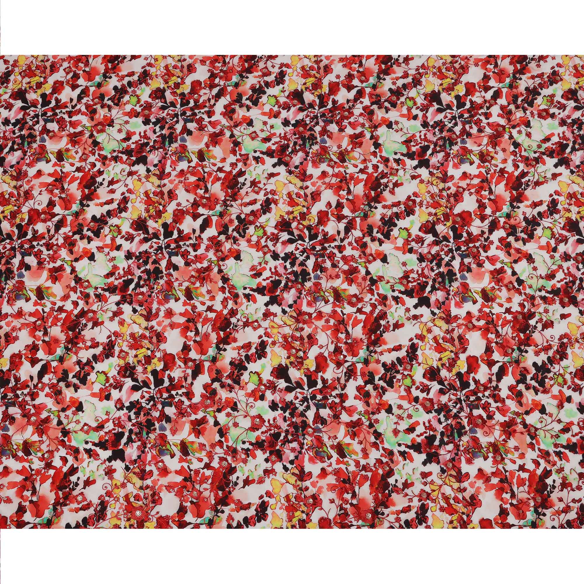 طباعة زهور تجريدية باللون الأحمر على قماش كريب فيسكوز أبيض، عرض 110 سم، صنع في الهند - D23611