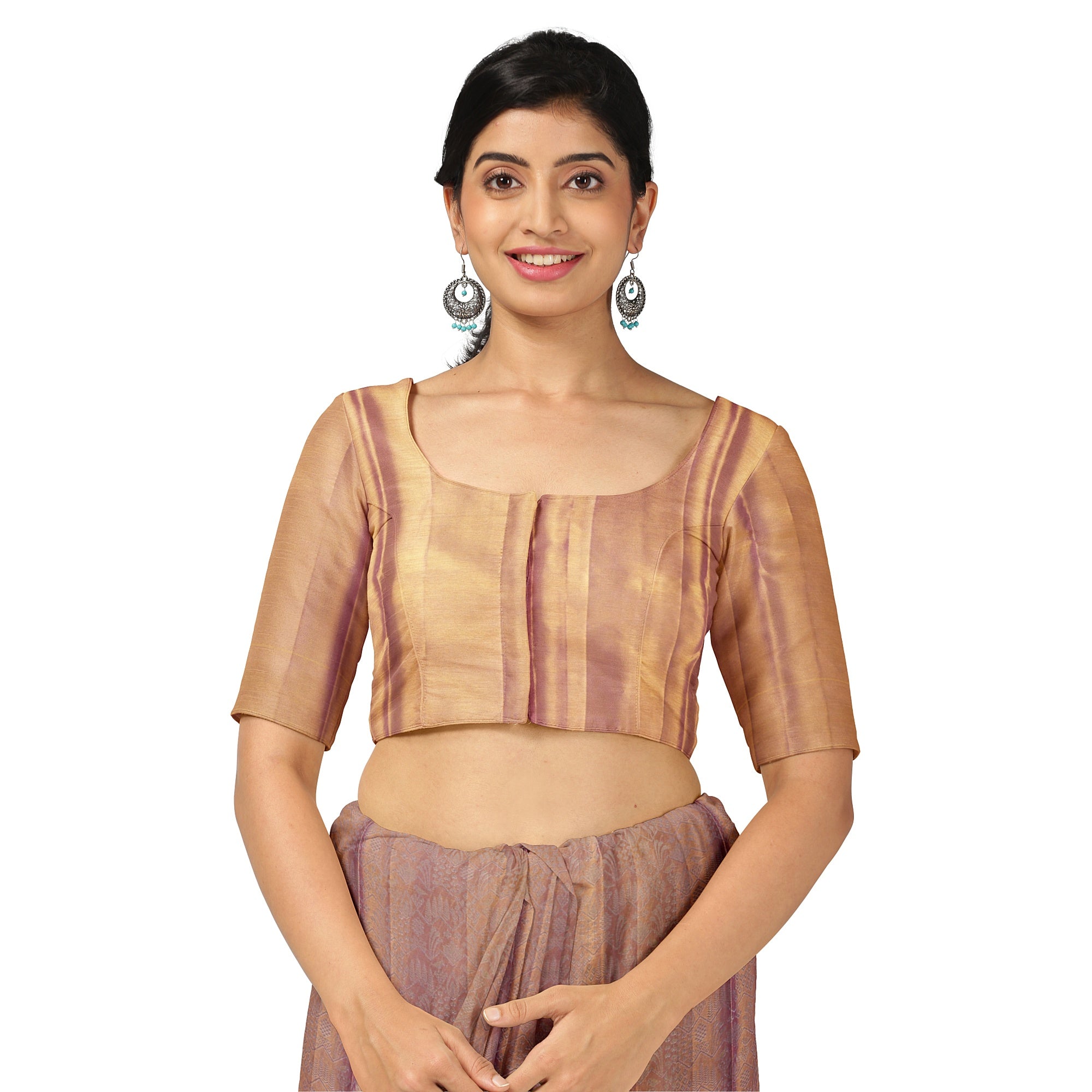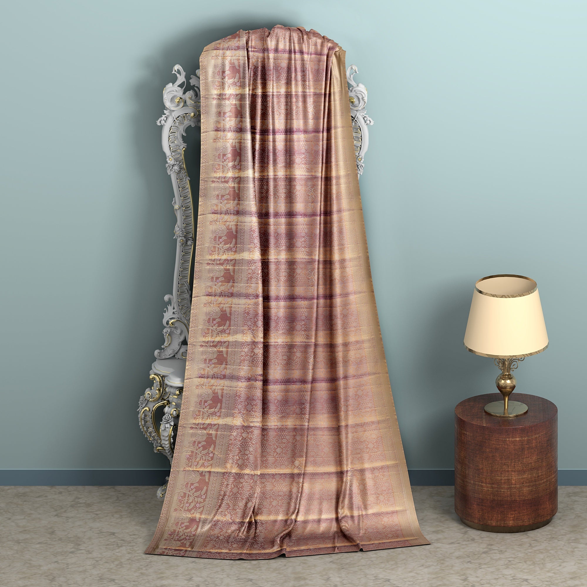 جسم حريري من الذهب الوردي مع نسيج زاري منقوش بلون اللافندر لإضفاء إشراقة خفيفة