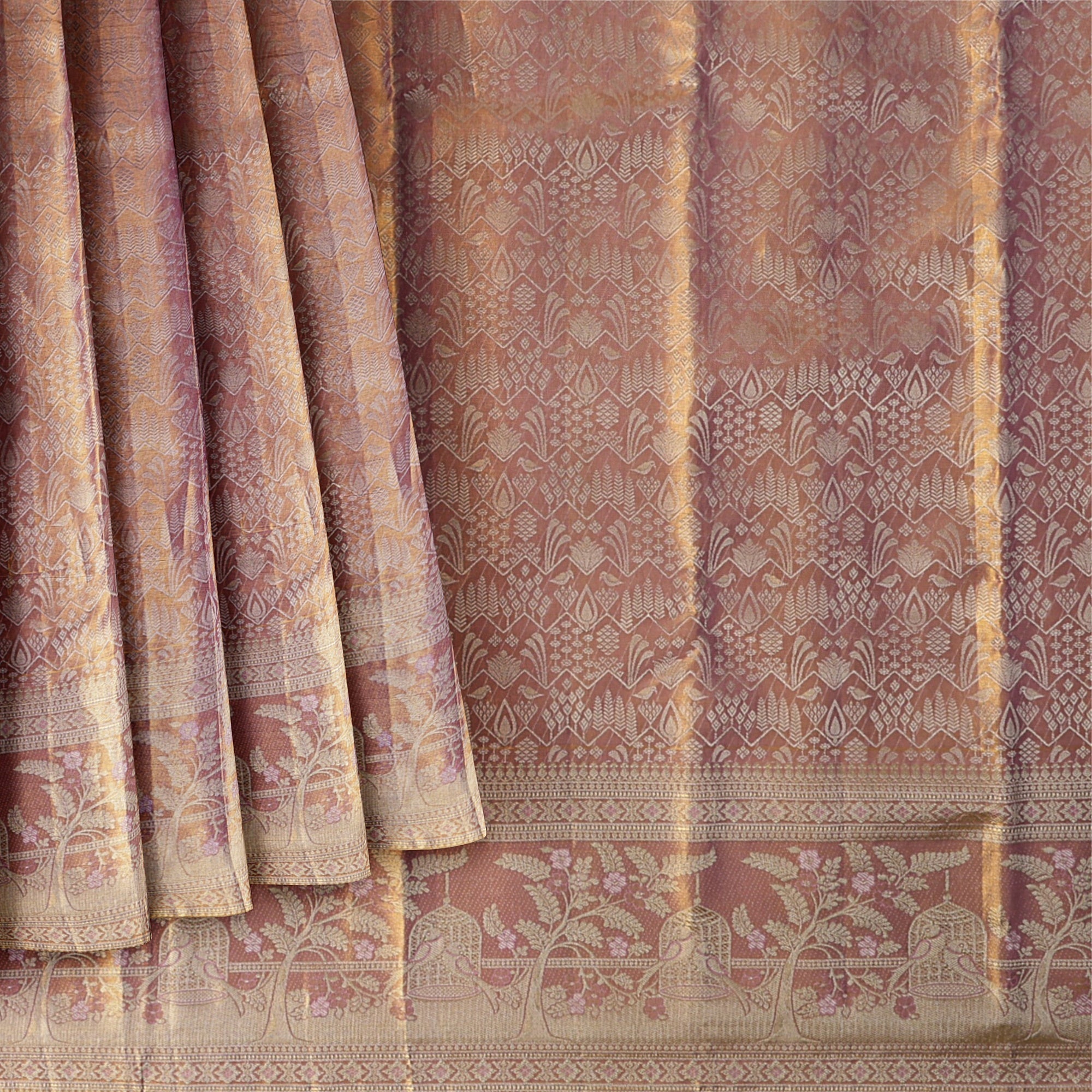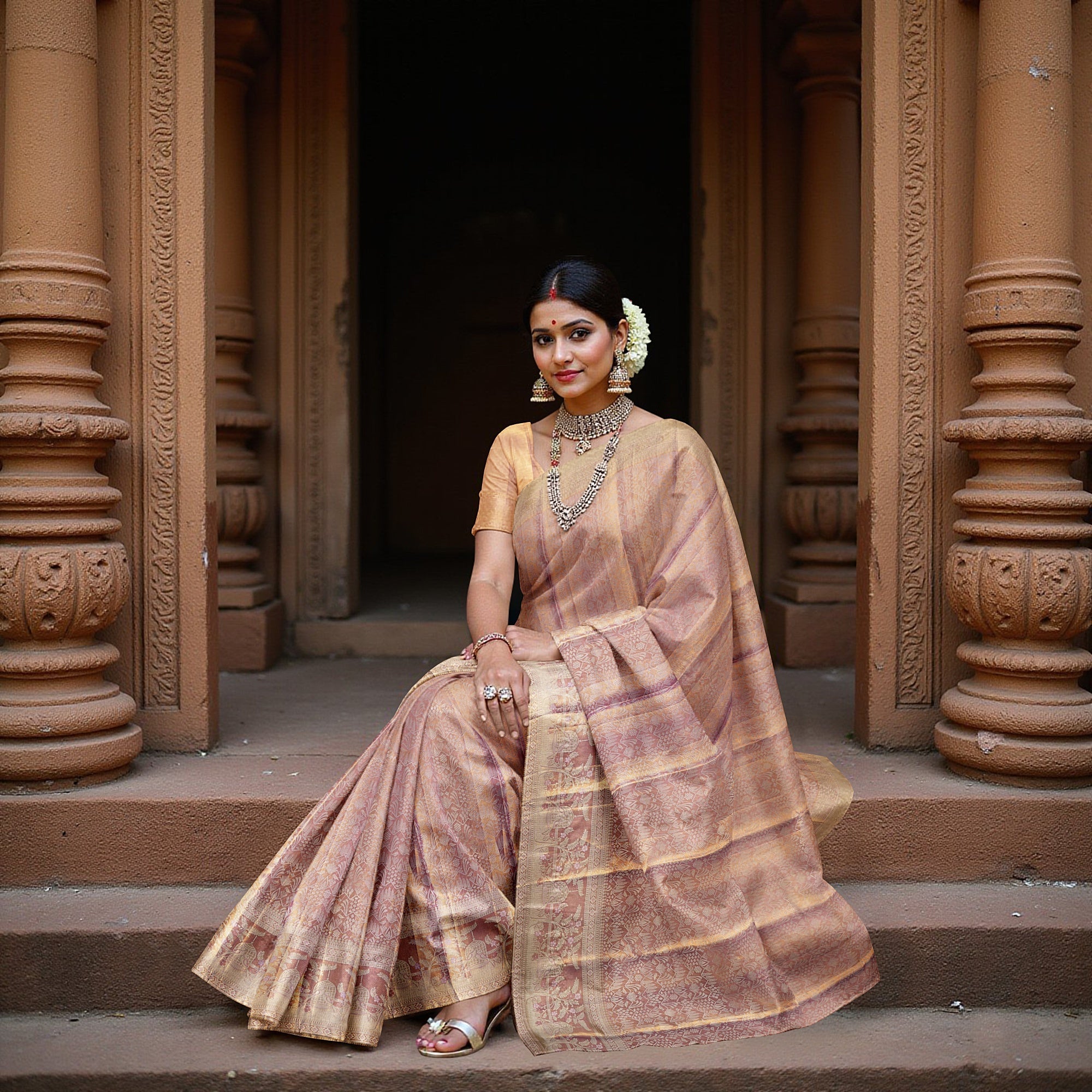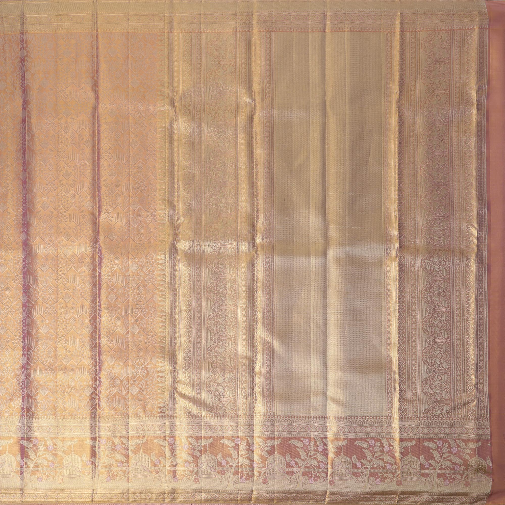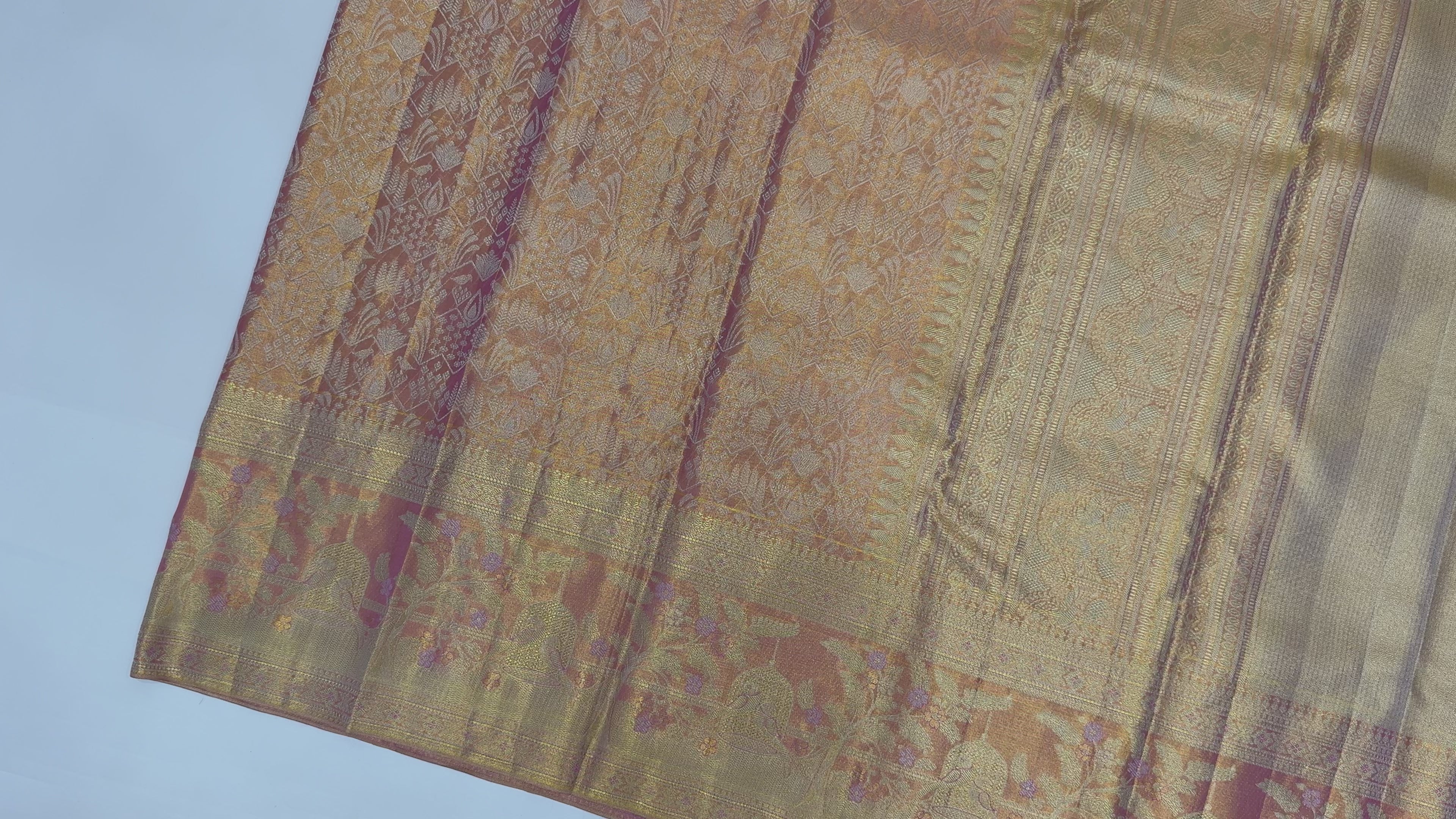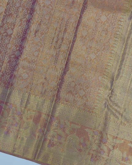 ساري زفاف كانجيفارام، المصنوع من الحرير الخالص بلوني الذهب الوردي واللافندر، مستوحى من فخامة جداريات المعابد القديمة ولفائف الطقوس. منسوج... اقرأ أكثر اقرأ أكثر