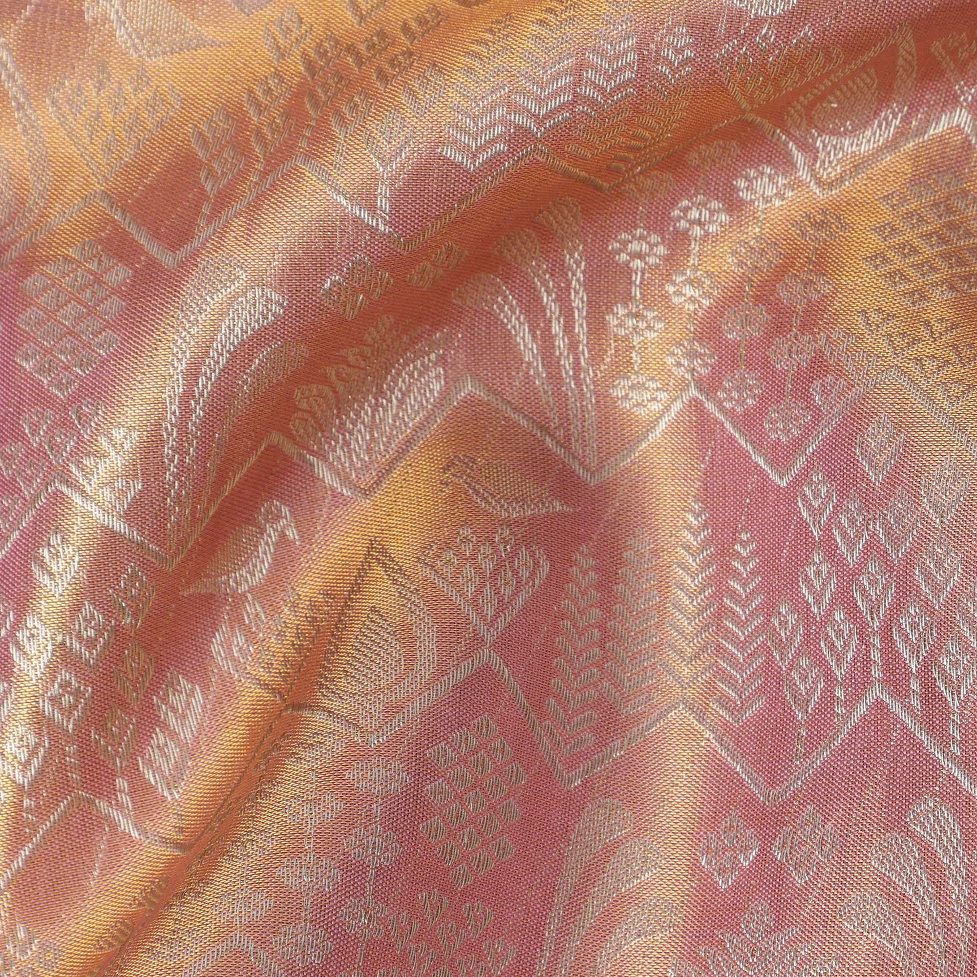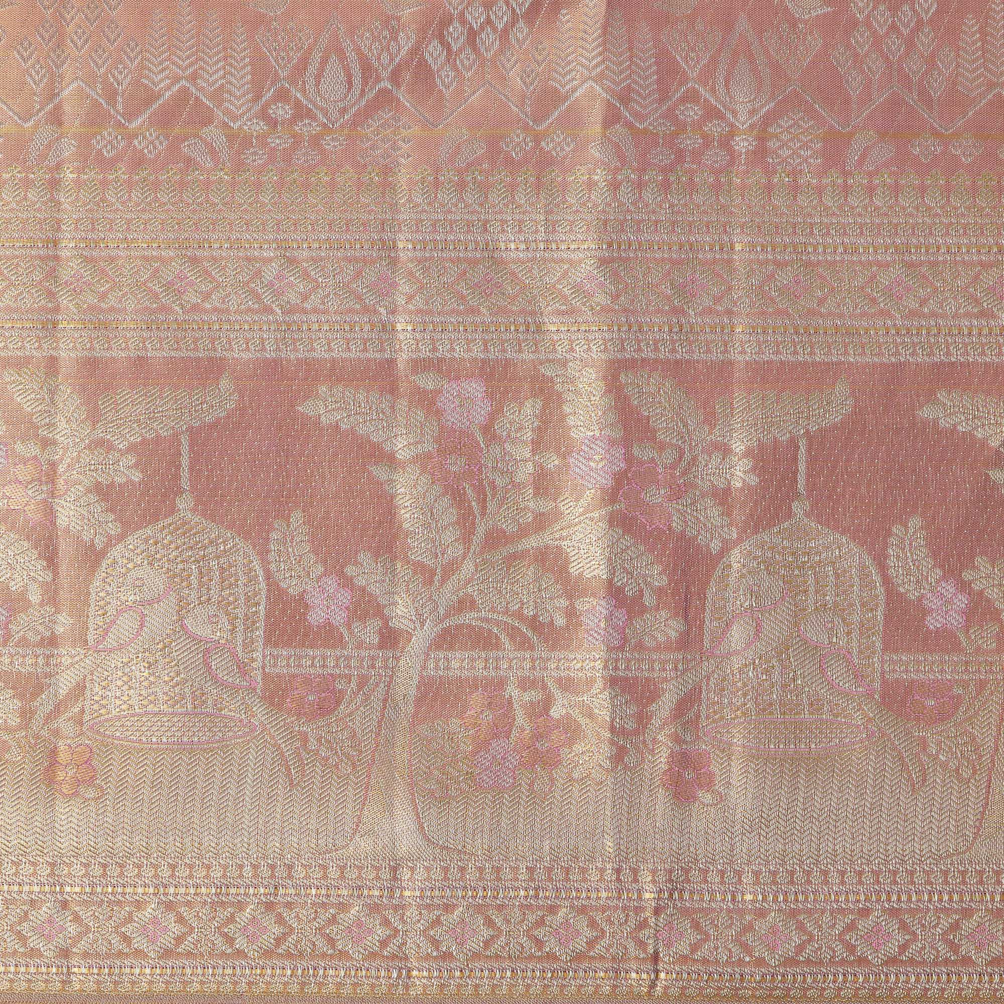 ساري زفاف كانجيفارام من الحرير الخالص، من قماش زاري منقوش باللونين الذهبي الوردي والأرجواني، مع حافة زهرية على شكل فيل مع نقش تقليدي، عرض 110 سم، صنع في الهند - D22770