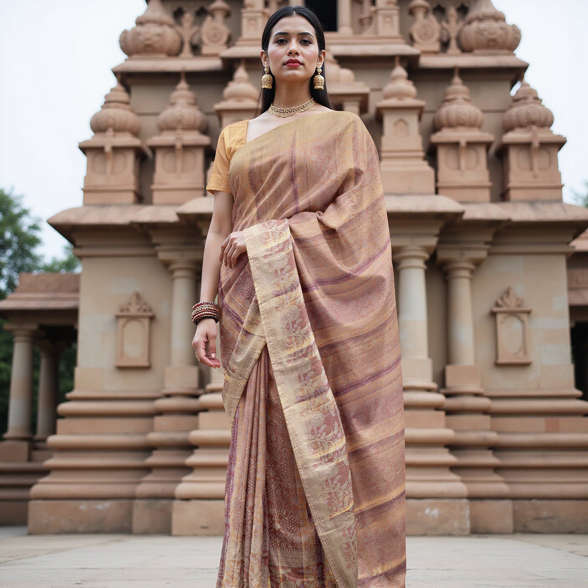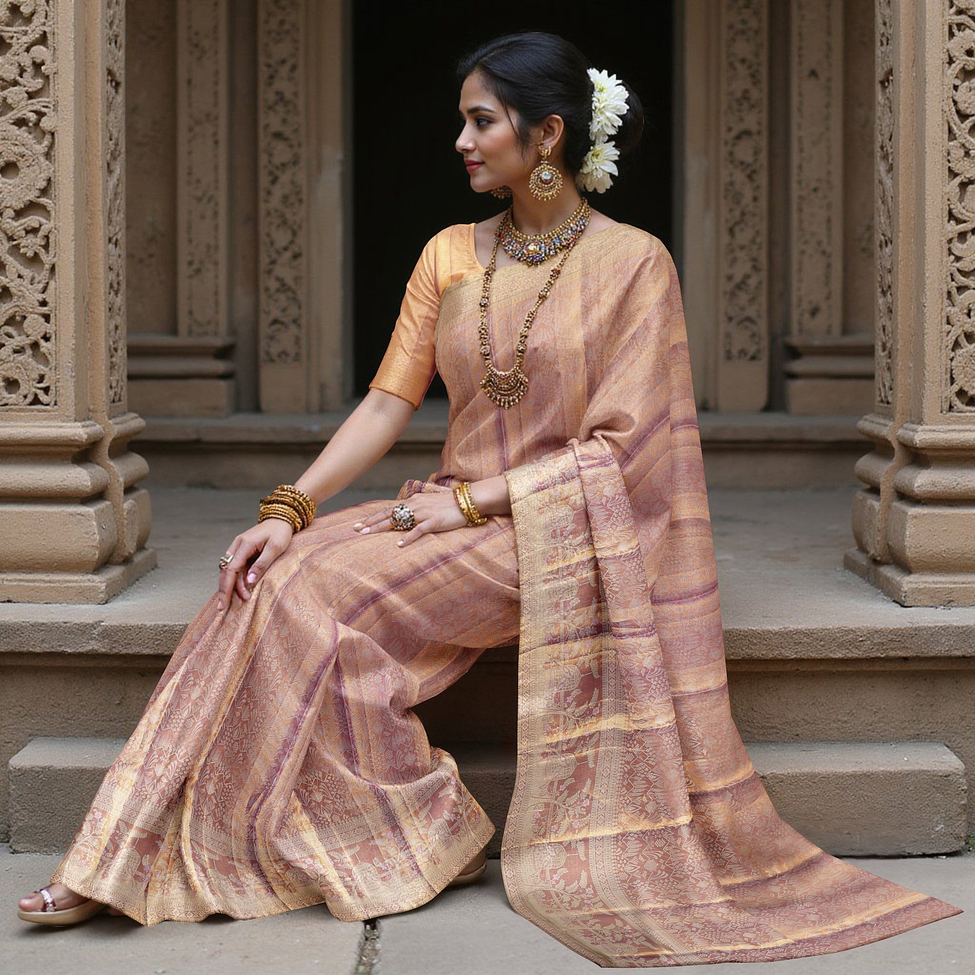 ساري زفاف كانجيفارام، المصنوع من الحرير الخالص بلوني الذهب الوردي واللافندر، مستوحى من فخامة جداريات المعابد القديمة ولفائف الطقوس. منسوج بنقشة زاري لامعة بألوان باستيل ناعمة، بينما تُحاكي حوافه المزخرفة بنقشة الفيل والزهور المواكب المقدسة المستوحاة من الفنون الهندية. يُبرز البالو المصمم بدقة زخارف تقليدية تُشيد بالنسيج الخالد لجنوب الهند. منسوج من أقمشة ريجال، ويستغرق 48 ساعة من العمل الحرفي الدؤوب لتحقيق تفاصيله المذهلة وملمسه الحريري. يتميز هذا الساري بانسيابية ملكية، وهو مثالي للعرائس اللواتي يبحثن عن الأناقة الممزوجة بالتقاليد. يأتي مع بلوزة متناسقة. تسوقي عبر الإنترنت للاحتفال بيومكِ المميز بساري منسوج بلمسة من التراث والحب.