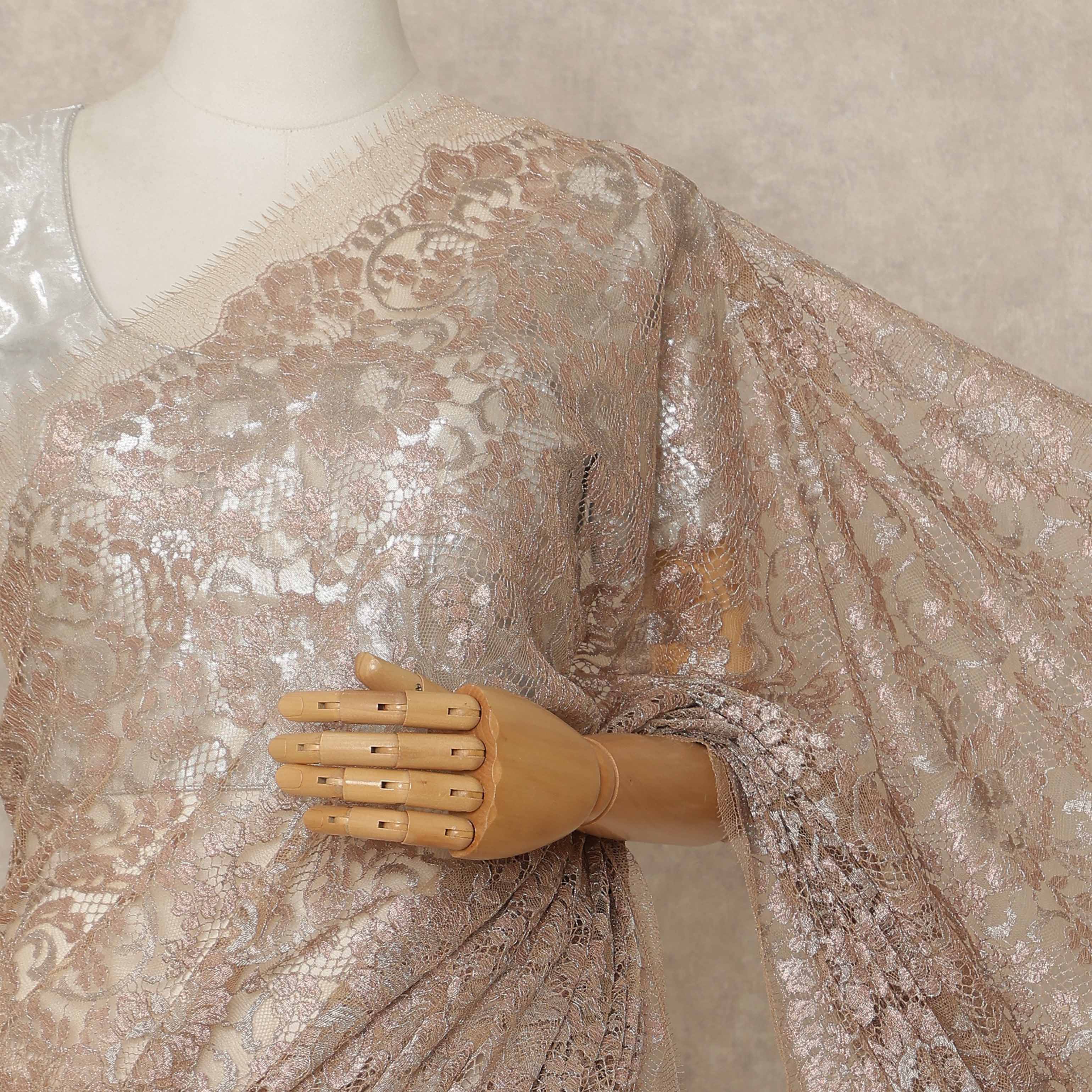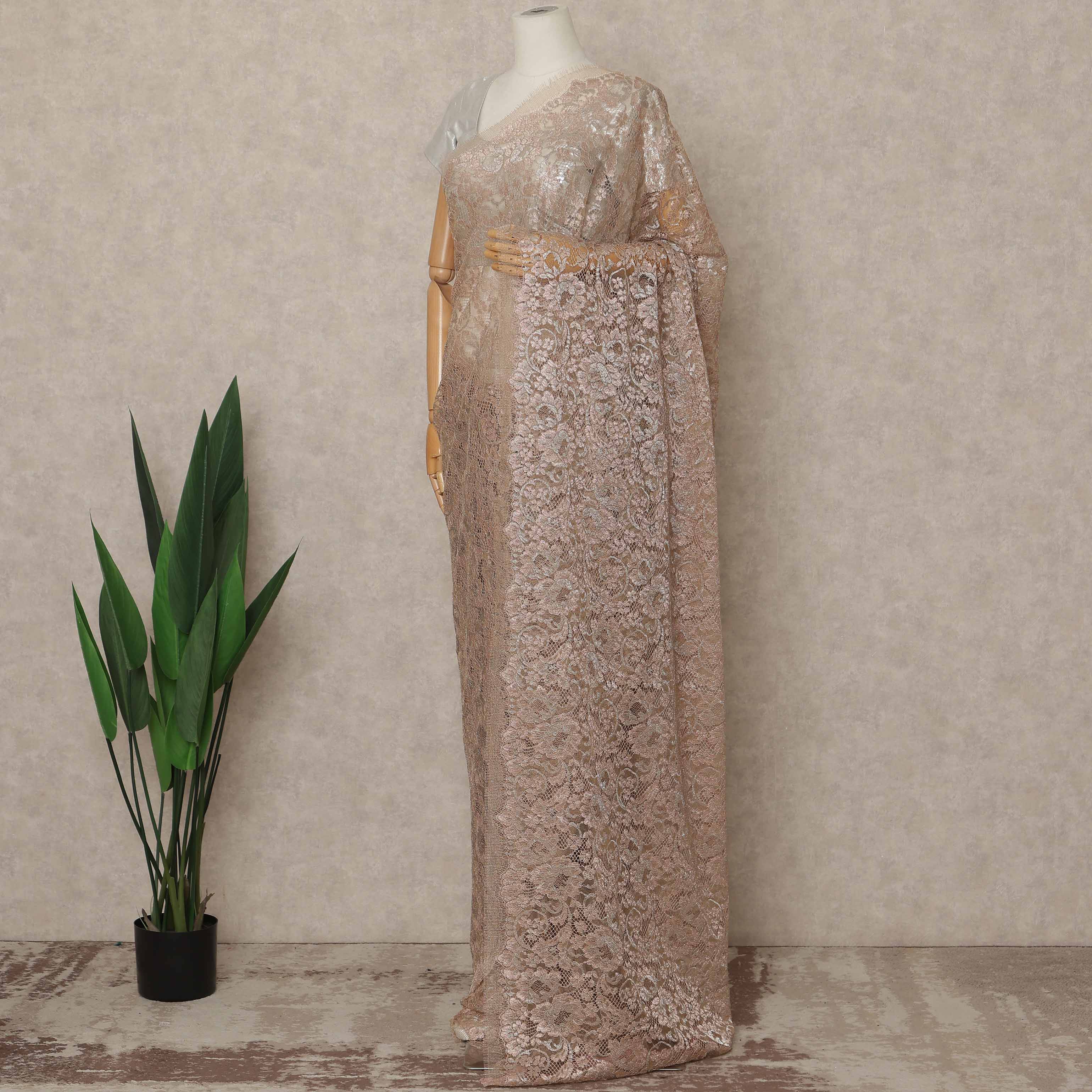 Rose Gold Premium French Metallic Chantilly Saree Lace 5.5 Mtrs Length 110 Cms Width Designer Net Fabric Made In France, Blouse Not Included-D28129