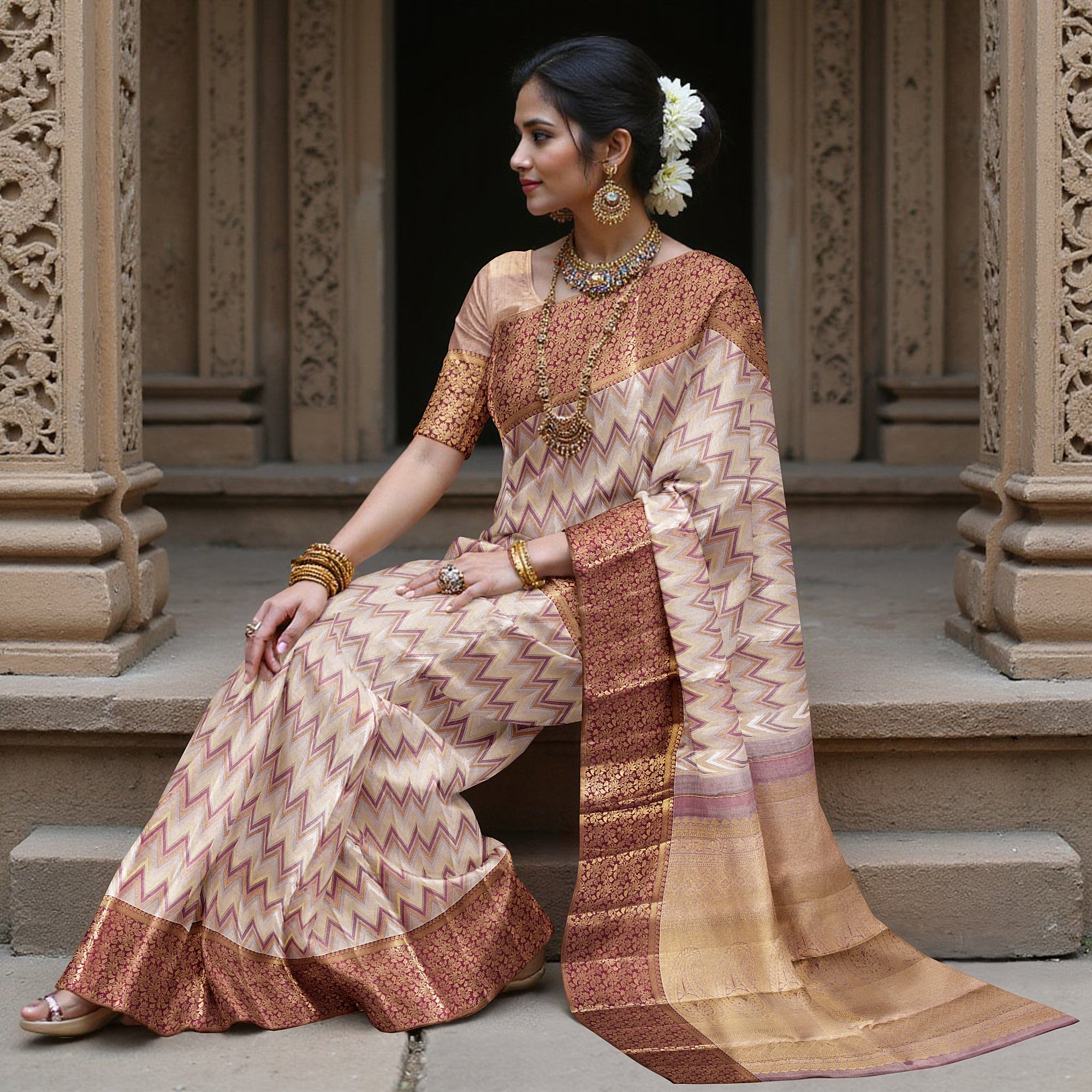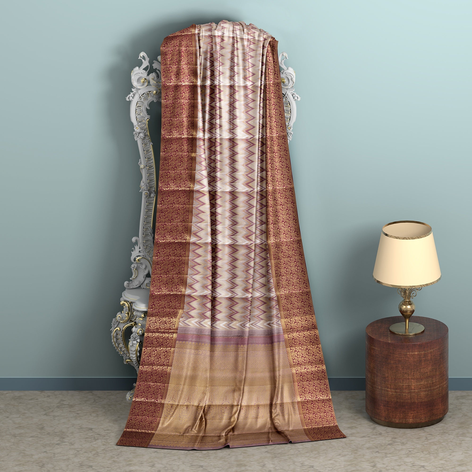 ساري كانجيفارام الحريري الخالص باللون الوردي الوردي والعنبري هو مزيج ساحر من الهندسة والفخامة، أبدعته أيادي حرفيي جنوب الهند التقليديين.... اقرأ أكثر اقرأ أكثر