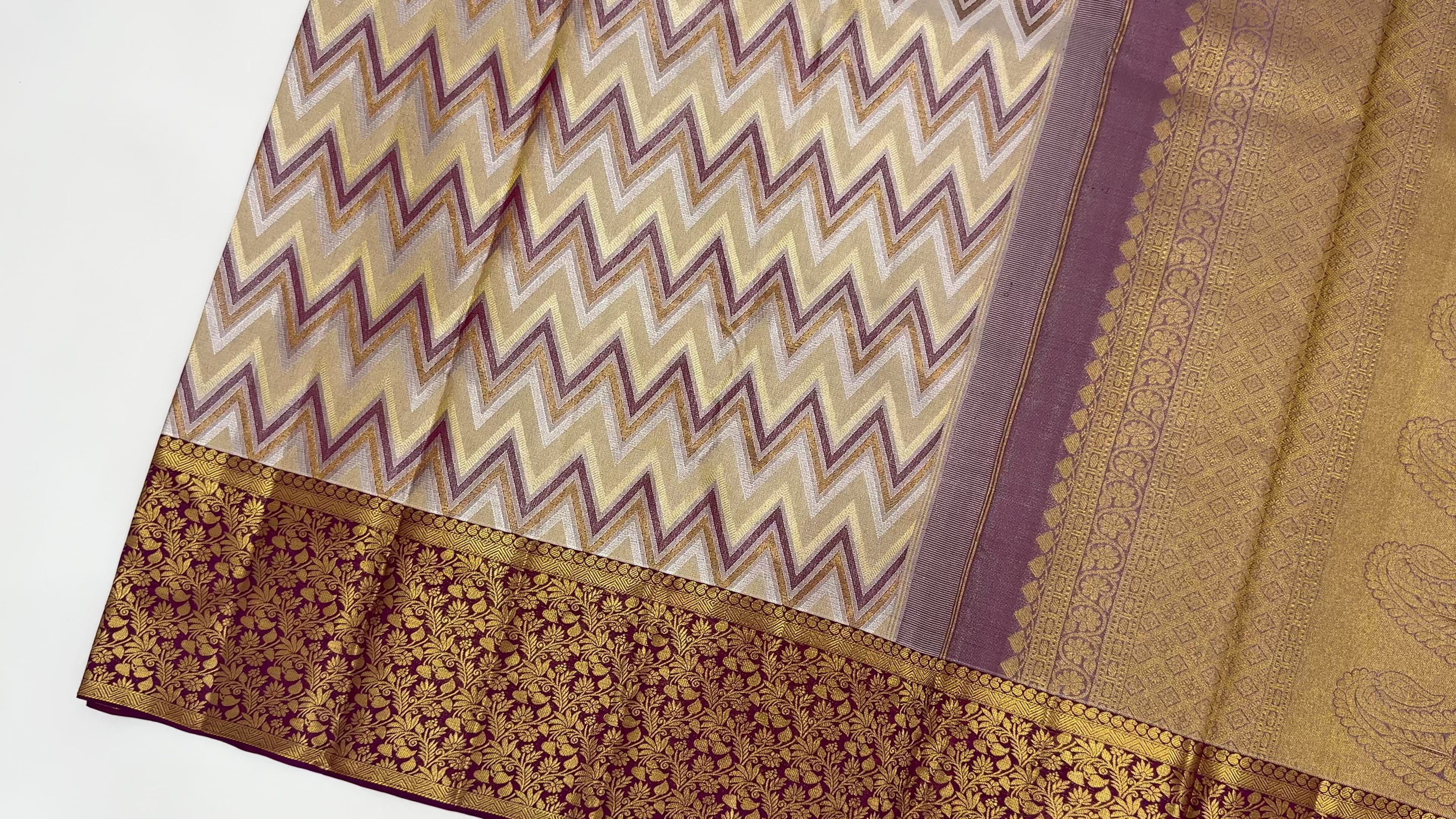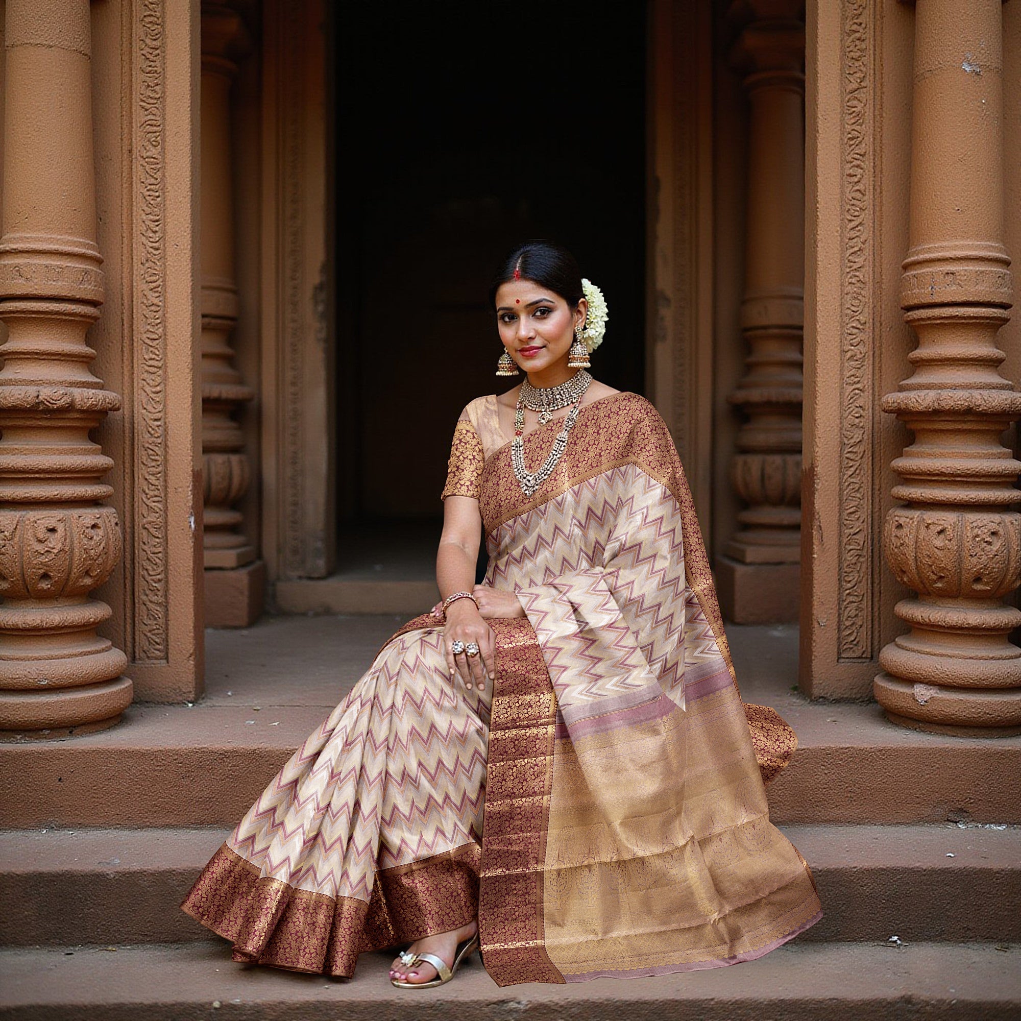 ساري كانجيفارام الحريري الخالص باللون الوردي الوردي والعنبري هو مزيج ساحر من الهندسة والفخامة، أبدعته أيادي حرفيي جنوب الهند التقليديين. تُظهر اللوحة المركزية باللون الوردي الوردي تصميمًا متعرجًا جريئًا بألوان باستيل هادئة، تعكس التناسق الإيقاعي الموجود في جداريات المعابد والهندسة المعمارية المقدسة. ويكمل هذا الجسم الديناميكي حافة عنابي داكنة مزينة بنقوش زاري زهرية معقدة تزيد من فخامة هذا الساري. منسوج بدقة على مدار 48 ساعة باستخدام حرير ريجال فابريكس، يروي كل خيط في هذا الساري قصة صبر وإخلاص وحرفية خالدة. مثالي للمناسبات الاحتفالية وحفلات الزفاف والاحتفالات الثقافية، يجمع هذا الساري بين الذوق المعاصر والثراء الكلاسيكي. تسوق عبر الإنترنت لاحتضان إرث من أناقة الحرير المنسوج يدويًا. يُنظف جافًا فقط للحفاظ على ملمسه وتناغم ألوانه وفن نسجه.