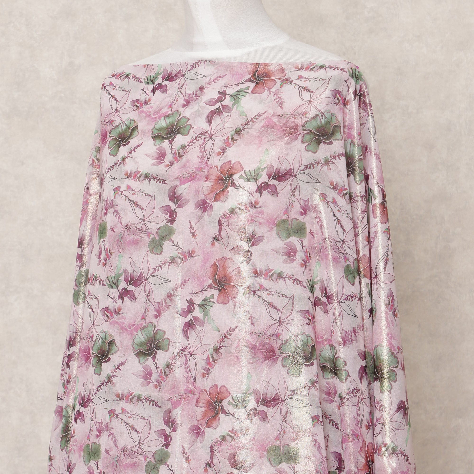 قاعدة باللون الوردي مع طبعات زهرية أنيقة باللونين البنفسجي والأخضر