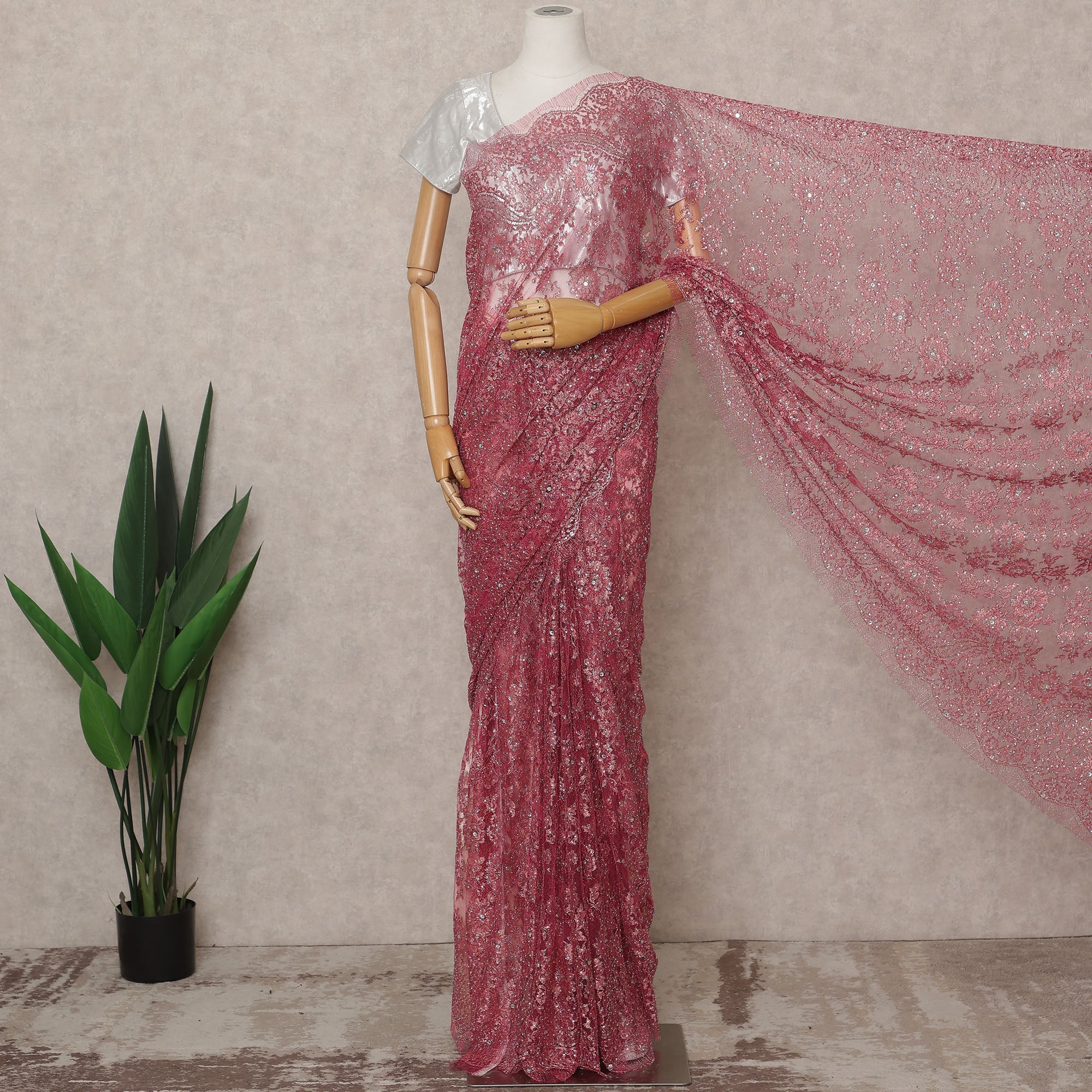 ساري فرنسي فاخر من الدانتيل الشانتيلي باللون الوردي الرقيق مع لمعان معدني