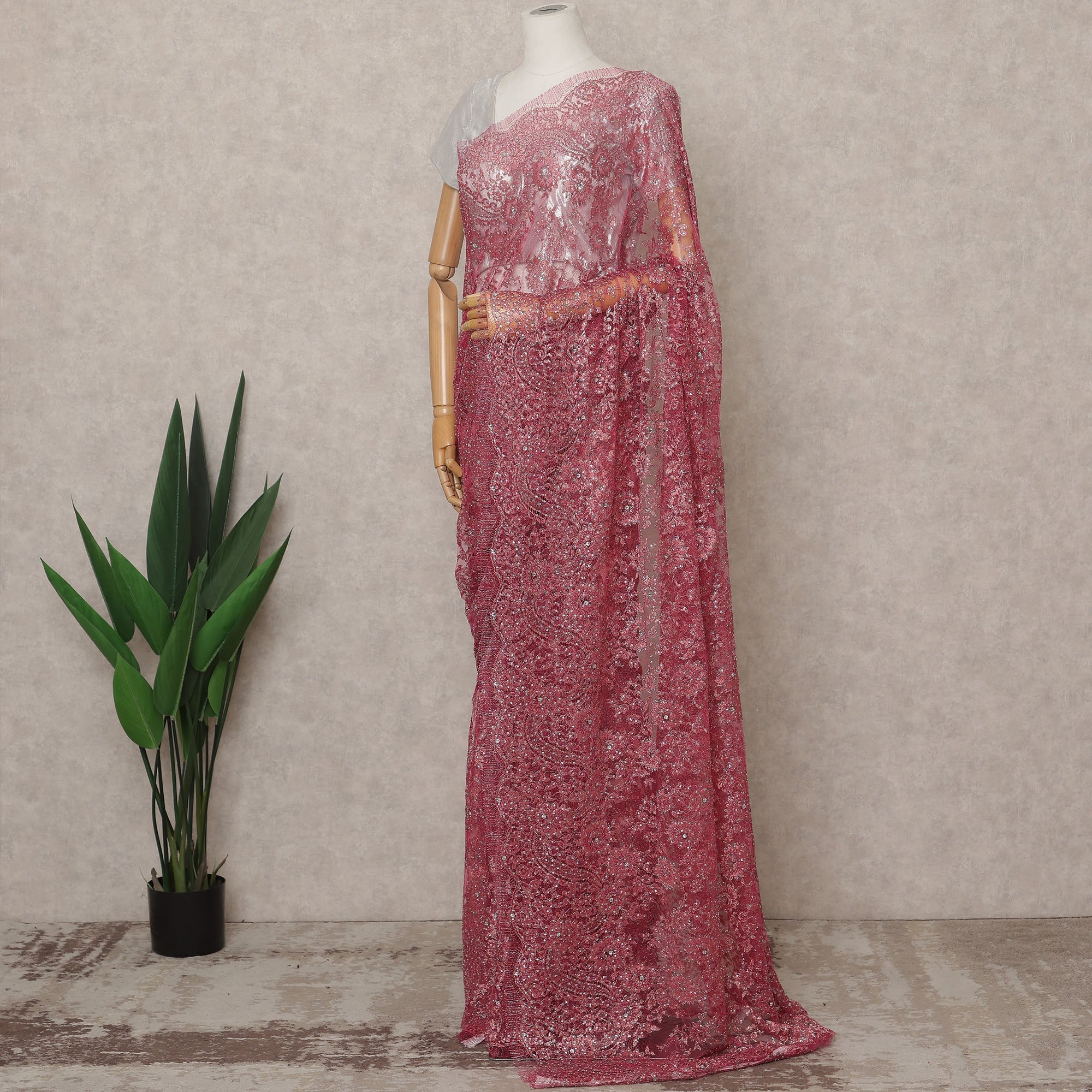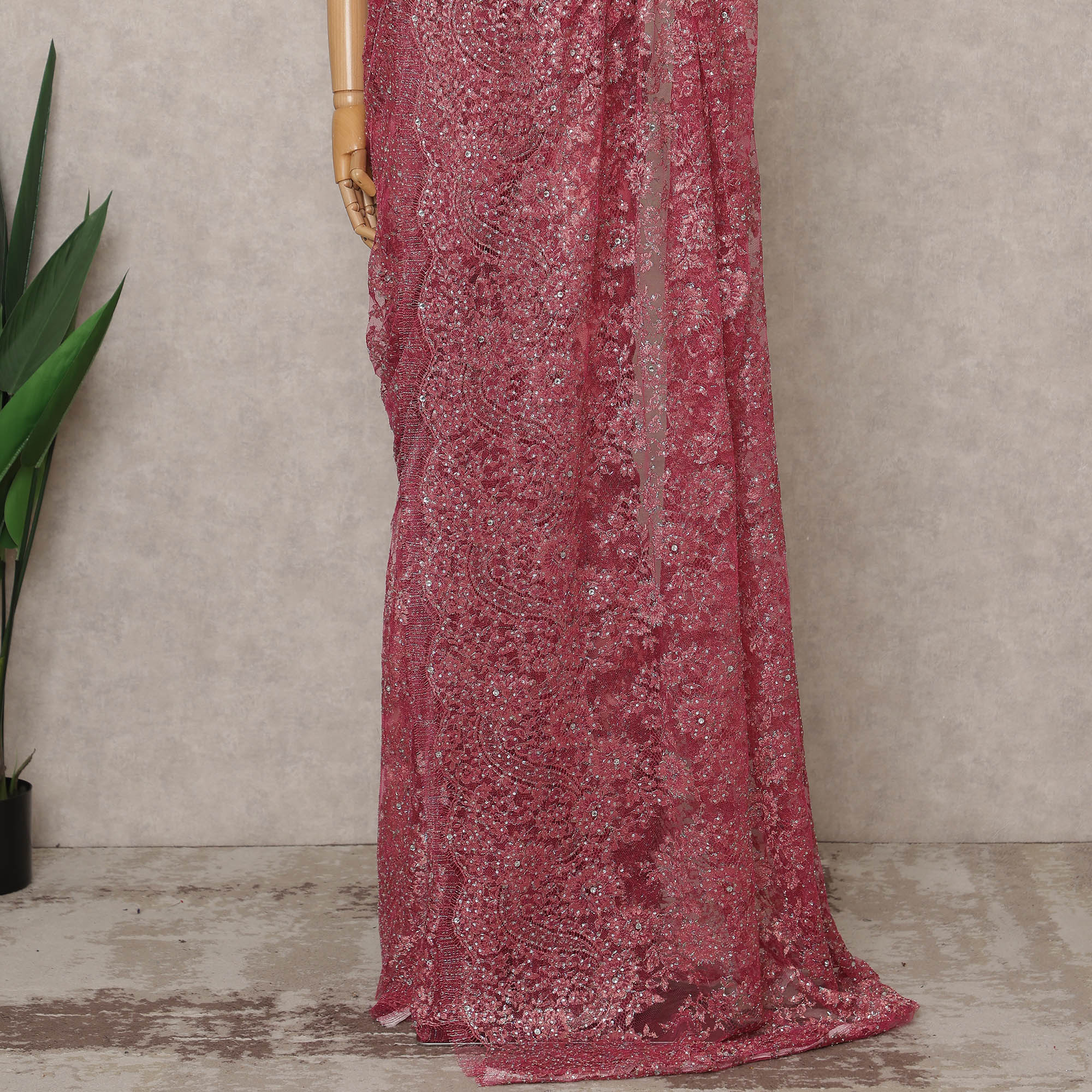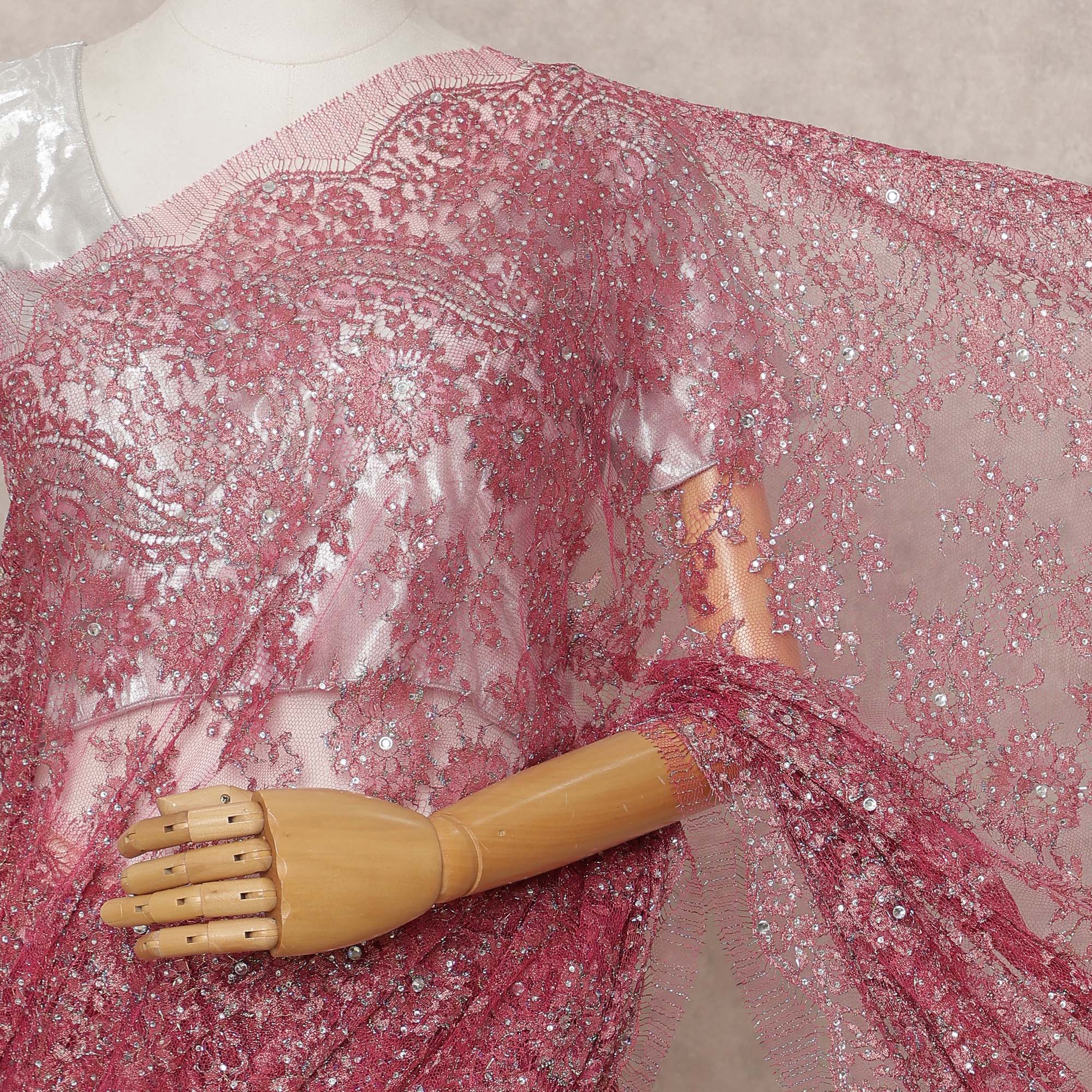 ساري فرنسي فاخر باللون الوردي من الدانتيل الشانتيلي المعدني مع تطريز حجري، عرض 110 سم، 5.5 متر، فرنسا - D25571