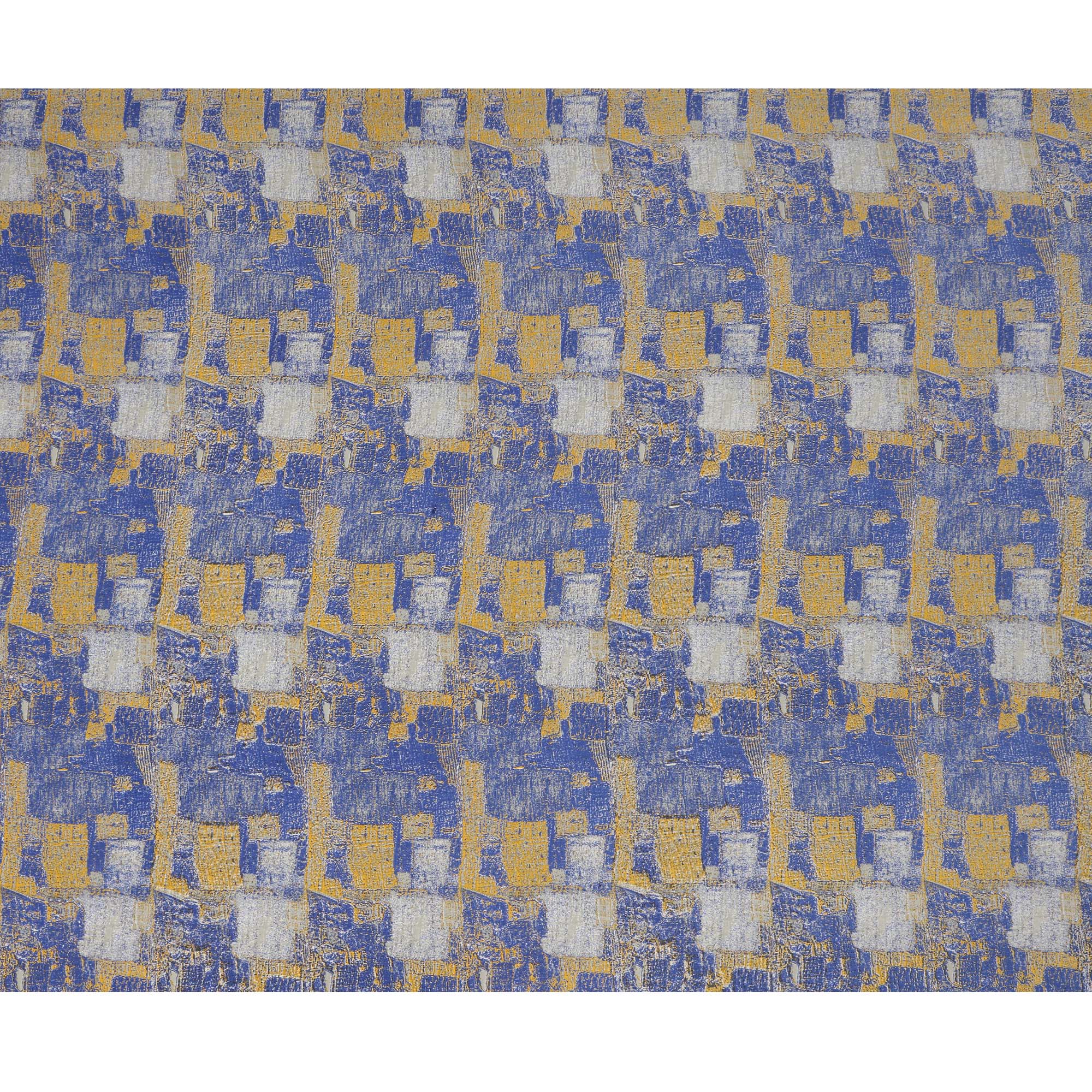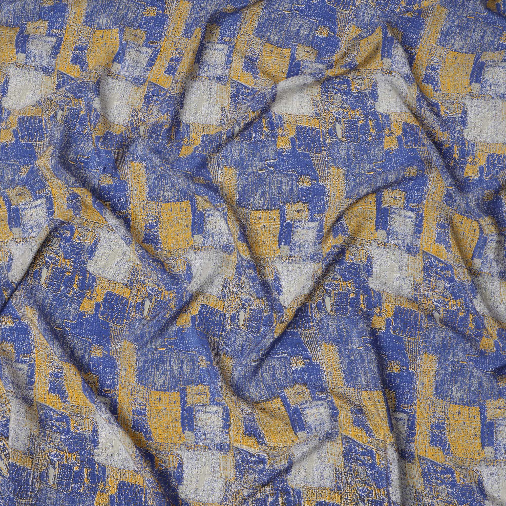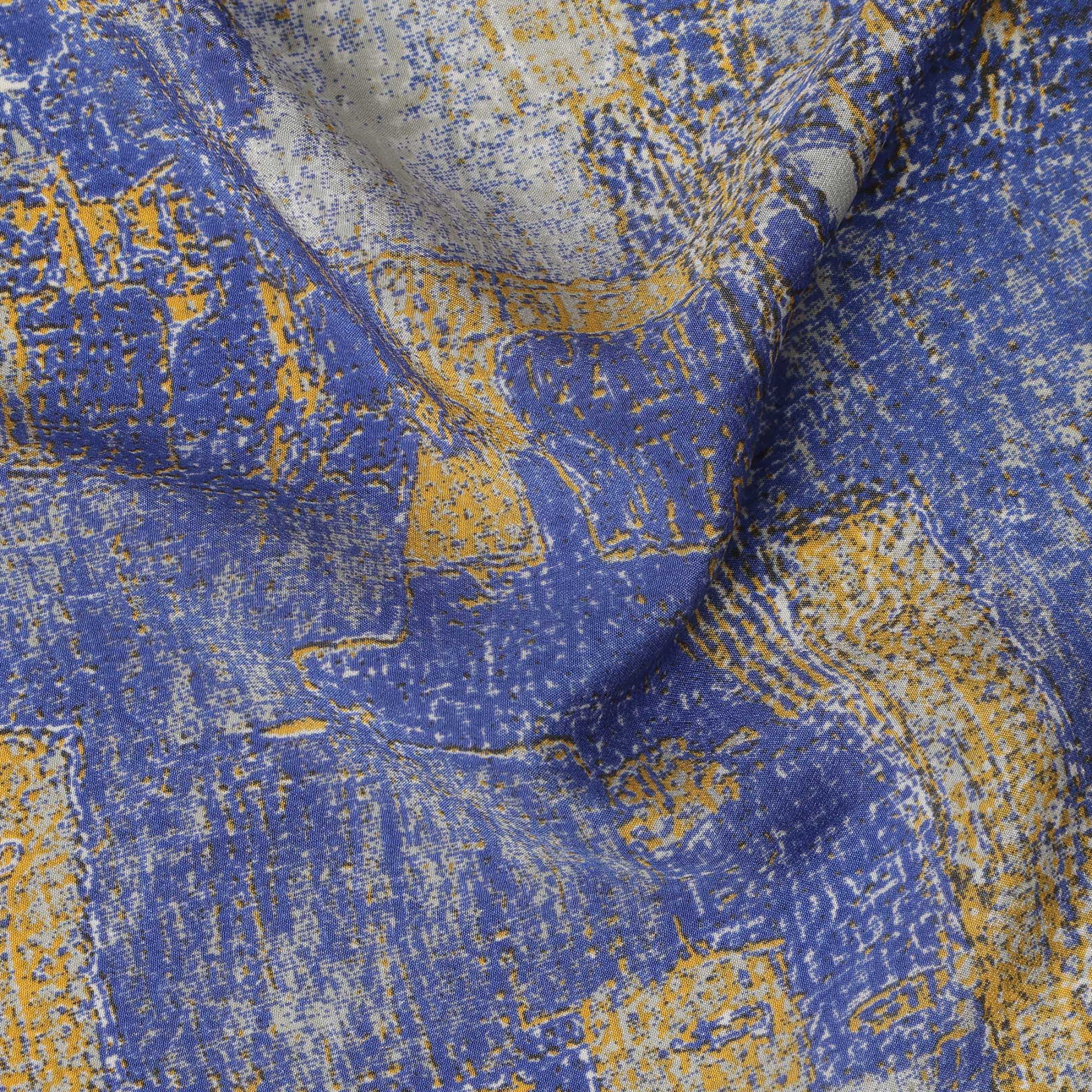 كريب حرير نقي مع طباعة تجريدية فنية باللون الأزرق الملكي والخردلي والأبيض العاجي