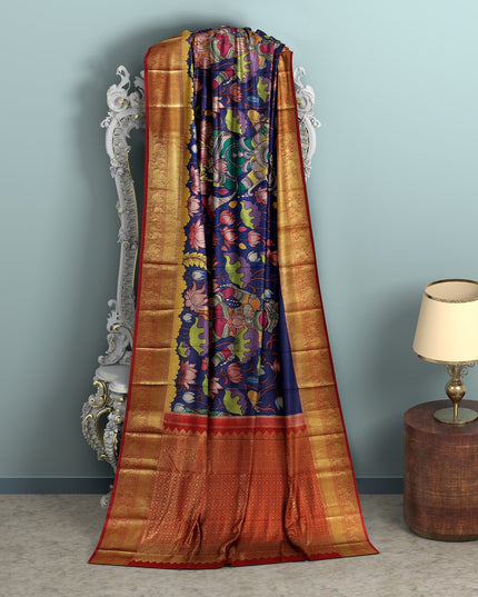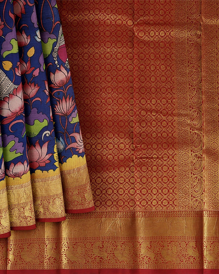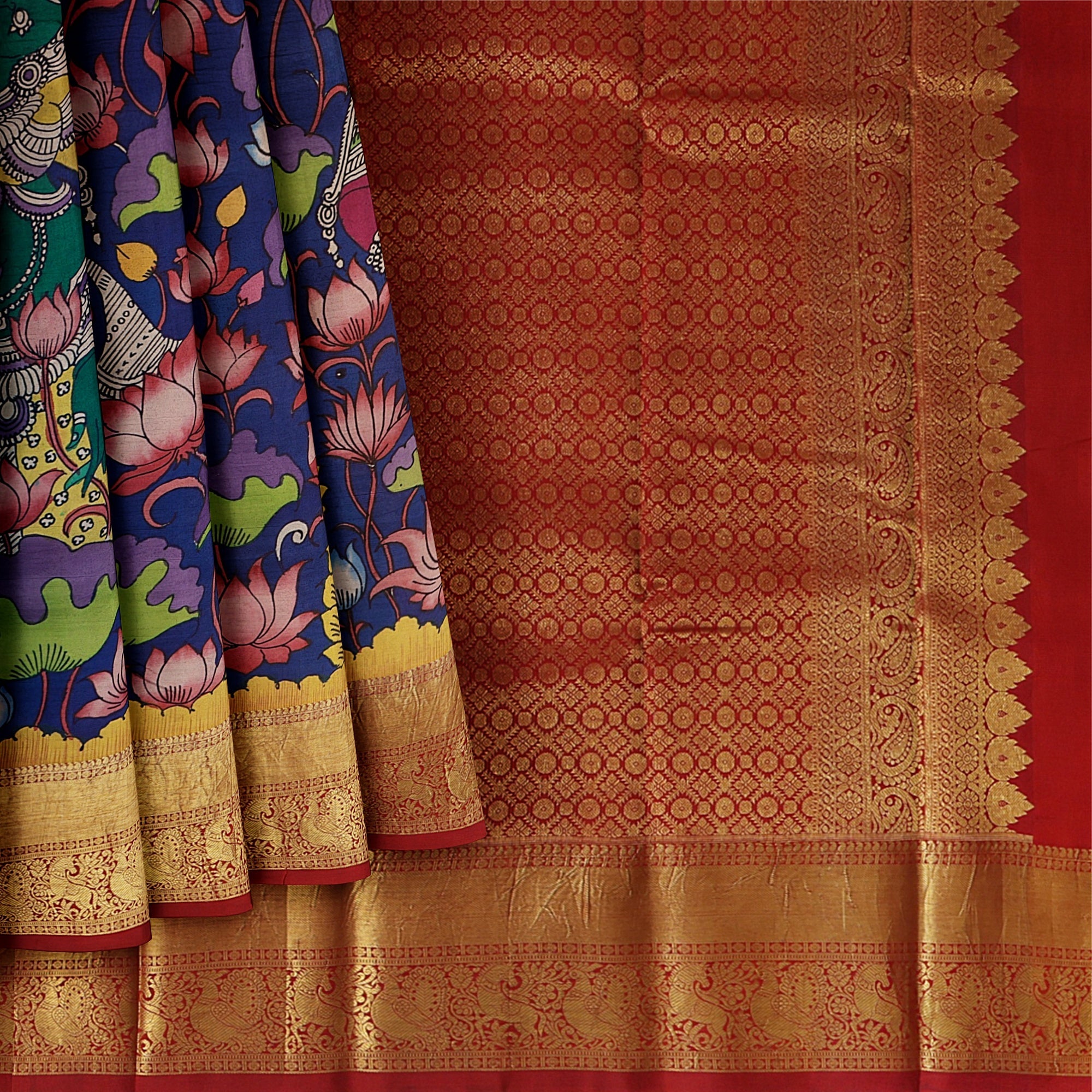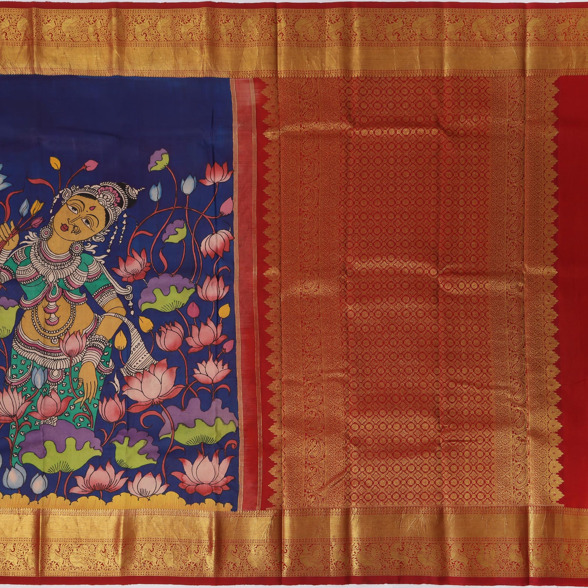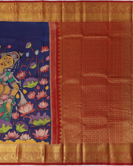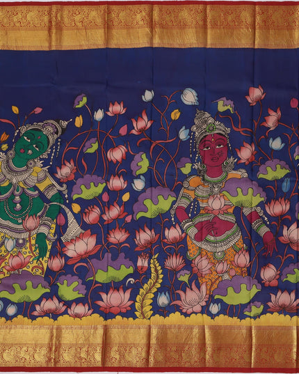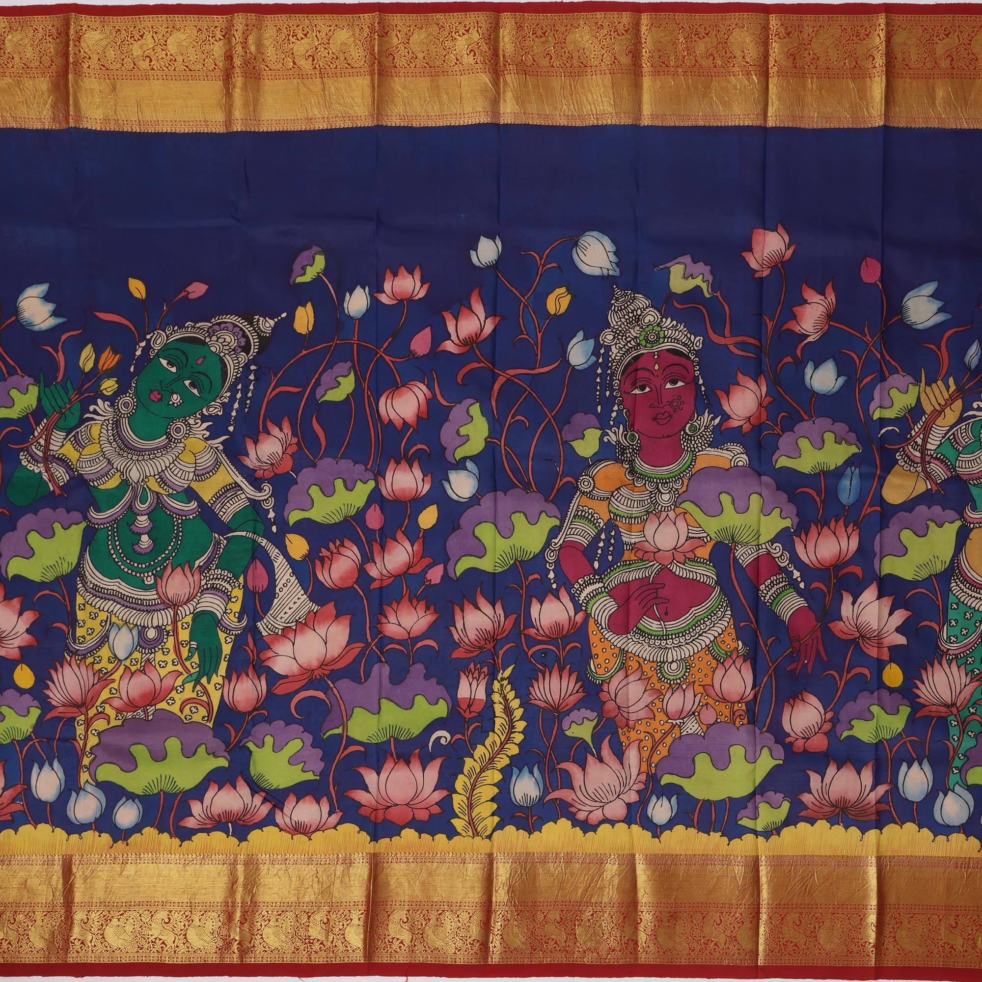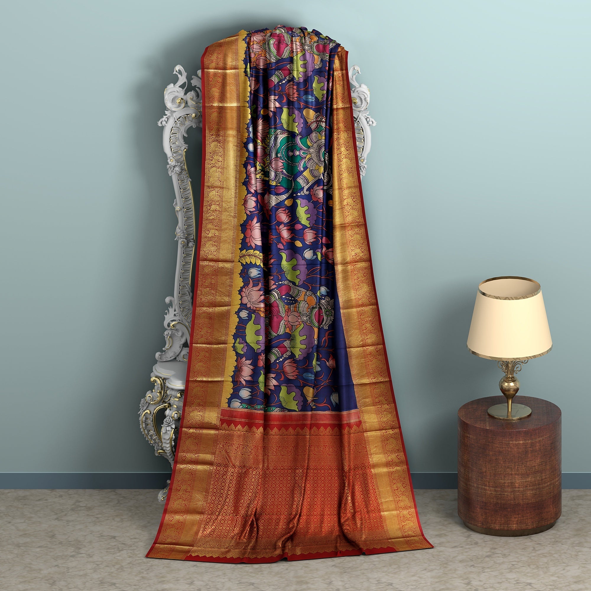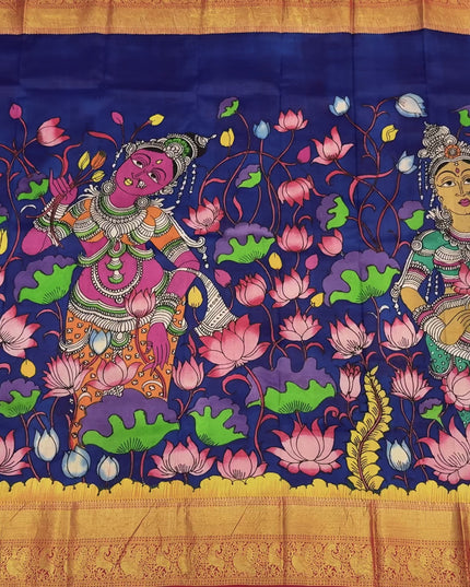 ساري كالامكاري حريري كانشي أزرق ملكي مع روائع أسطورية مرسومة يدويًا، عرض 110 سم، أصله: سري كالاهاستي، الهند، طوله 5.5 متر مع بلوزة - D22868