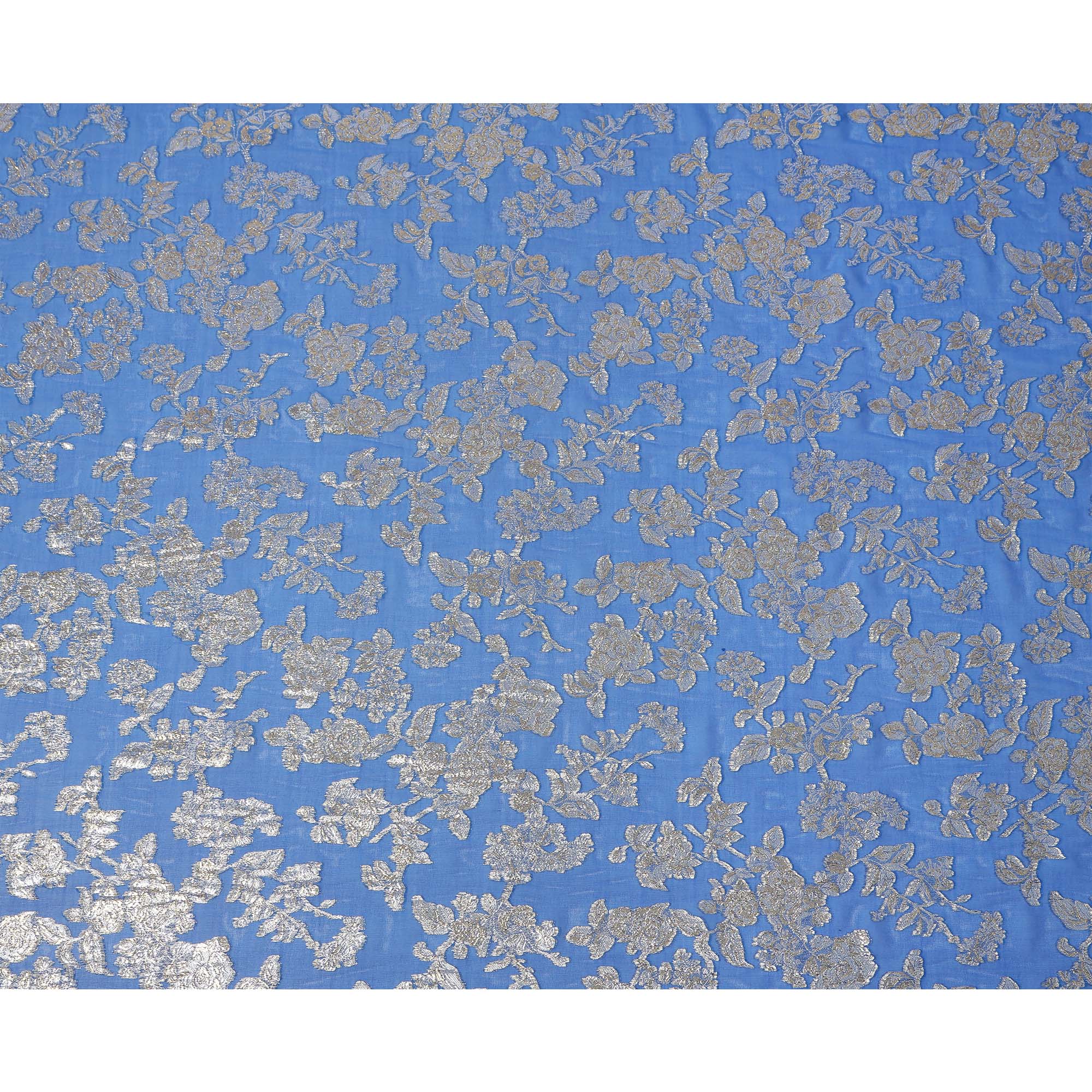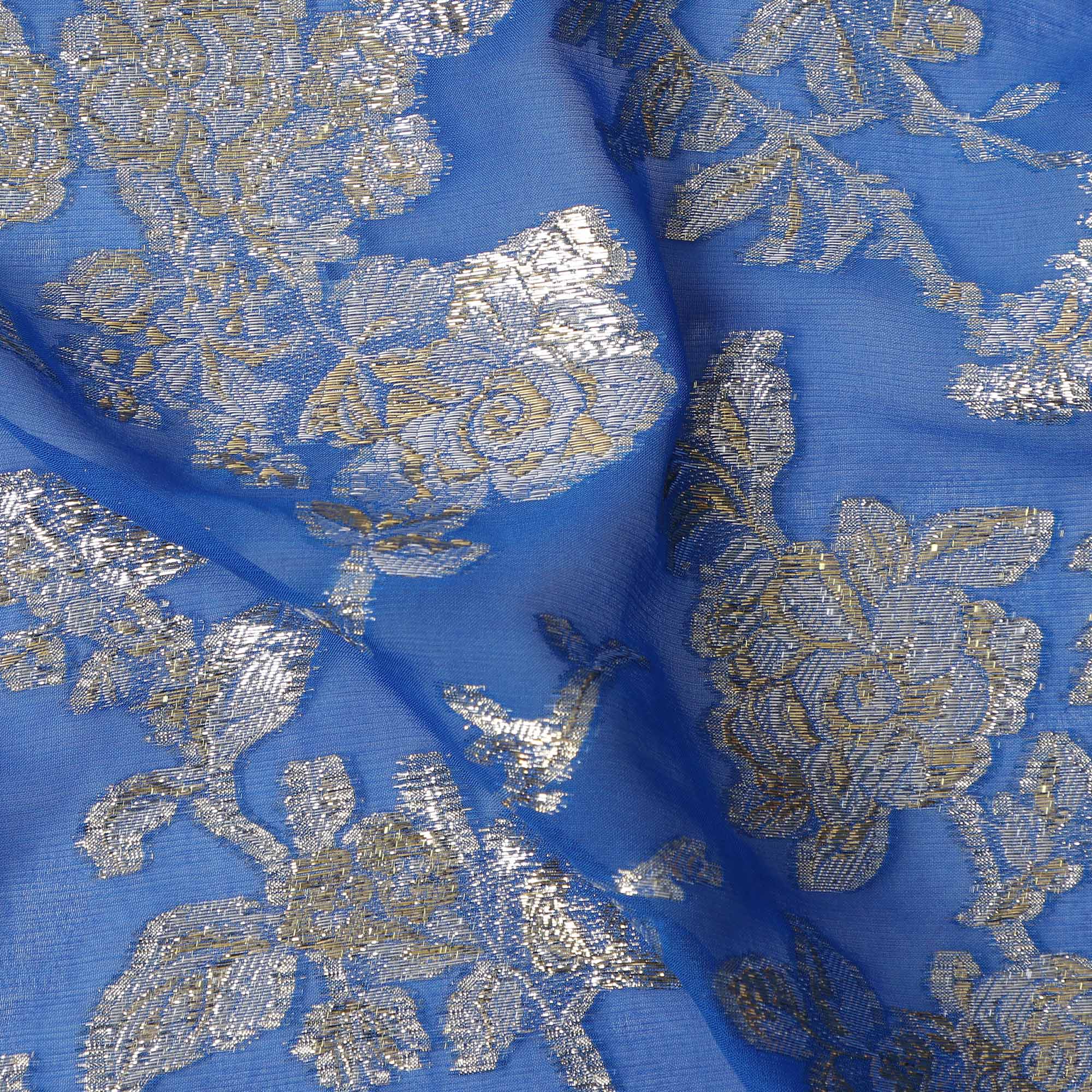 Vibrant royal blue base with metallic gold floral lurex design for a regal appeal