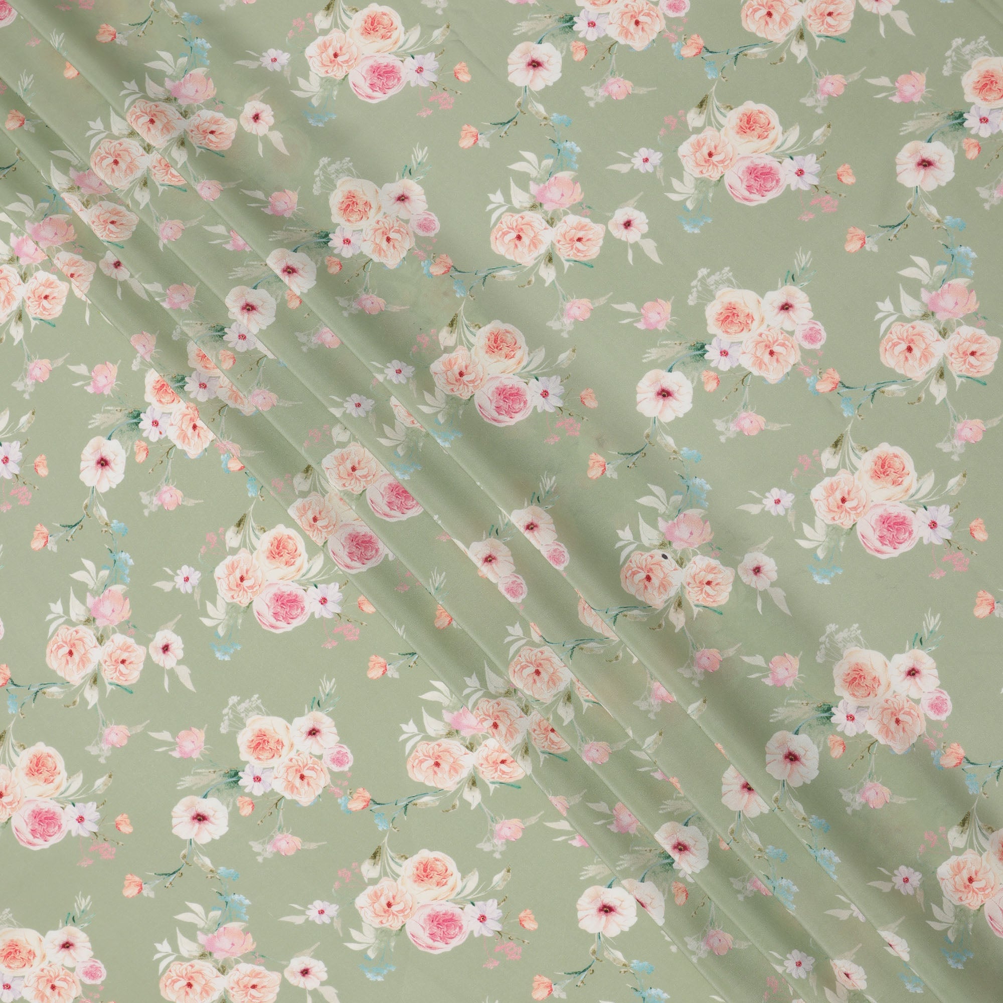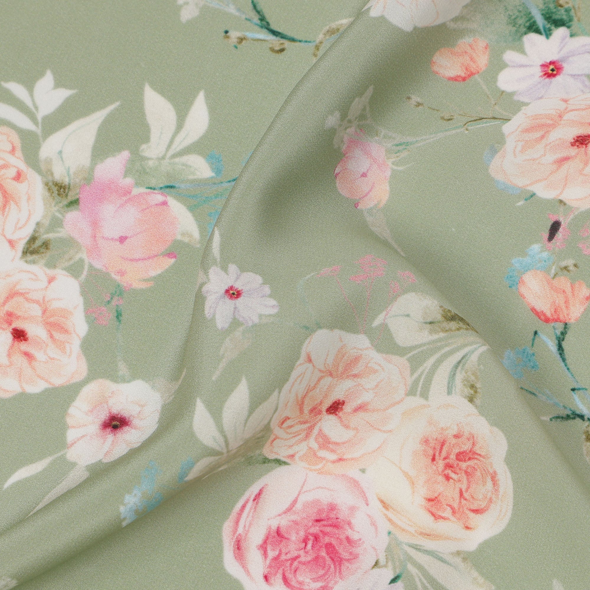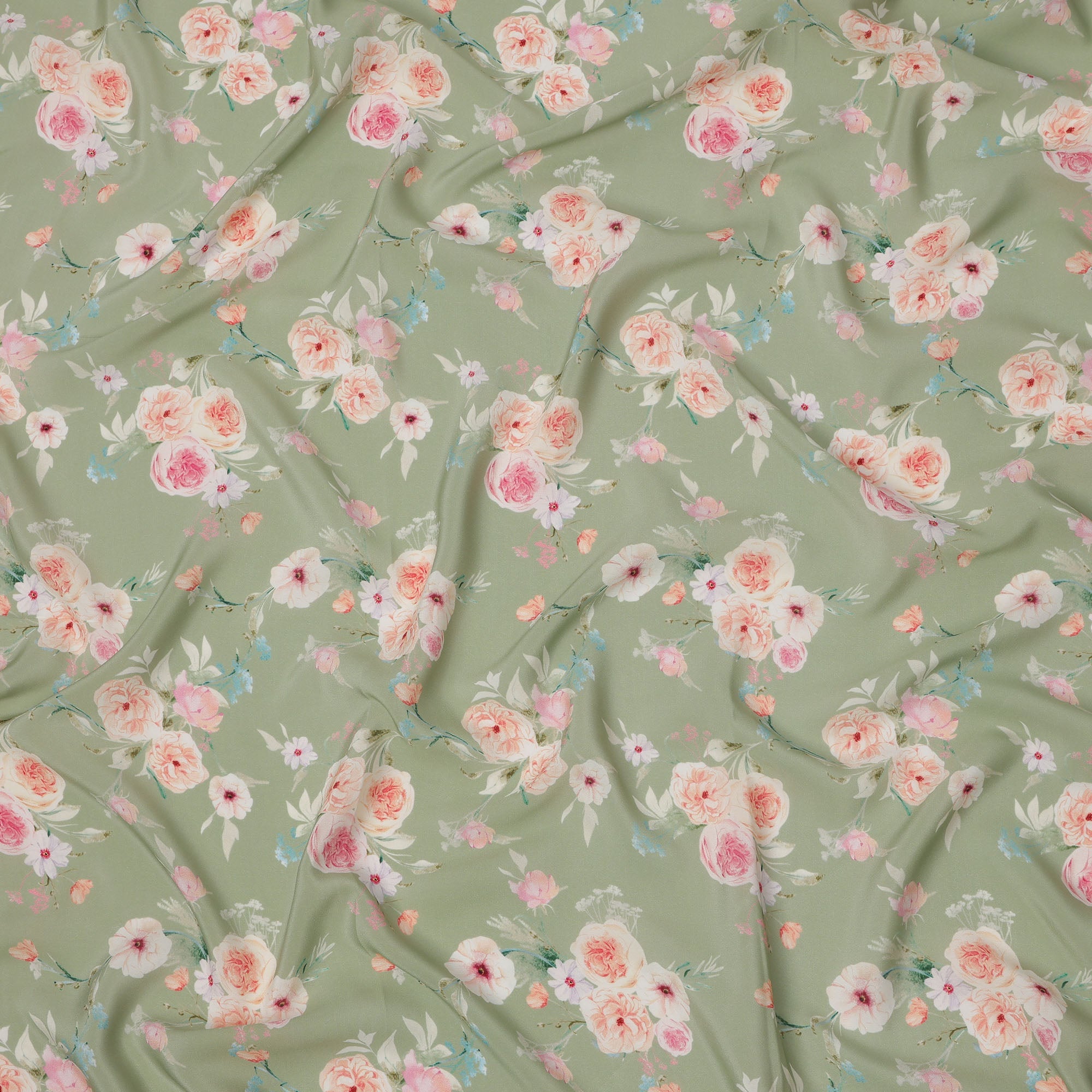 قماش كريب حريري ناعم بطبعة زهور وردية خوخي بقاعدة خضراء حكيمية، عرض 110 سم، صنع في الهند - D23976