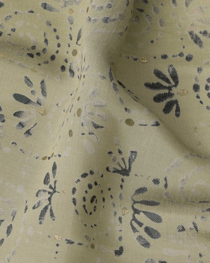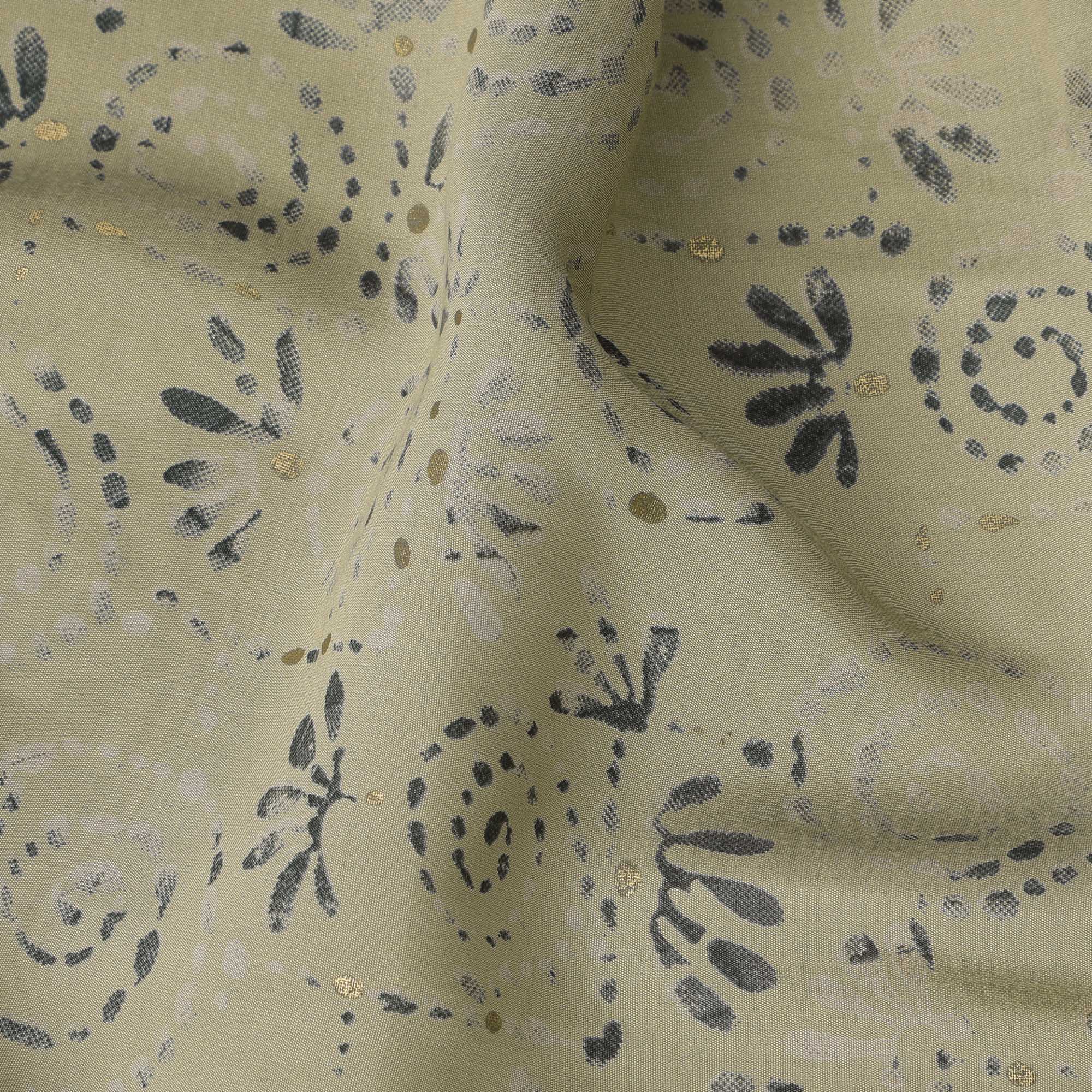 قماش فيسكوز مخلوط مطبوع مستوحى من تقنية الطباعة اليدوية باللون الأخضر الحكيم مع زخارف دوامية باللون الأزرق البحري ولمسات ذهبية، عرض 110 سم، صنع في الهند - D22819