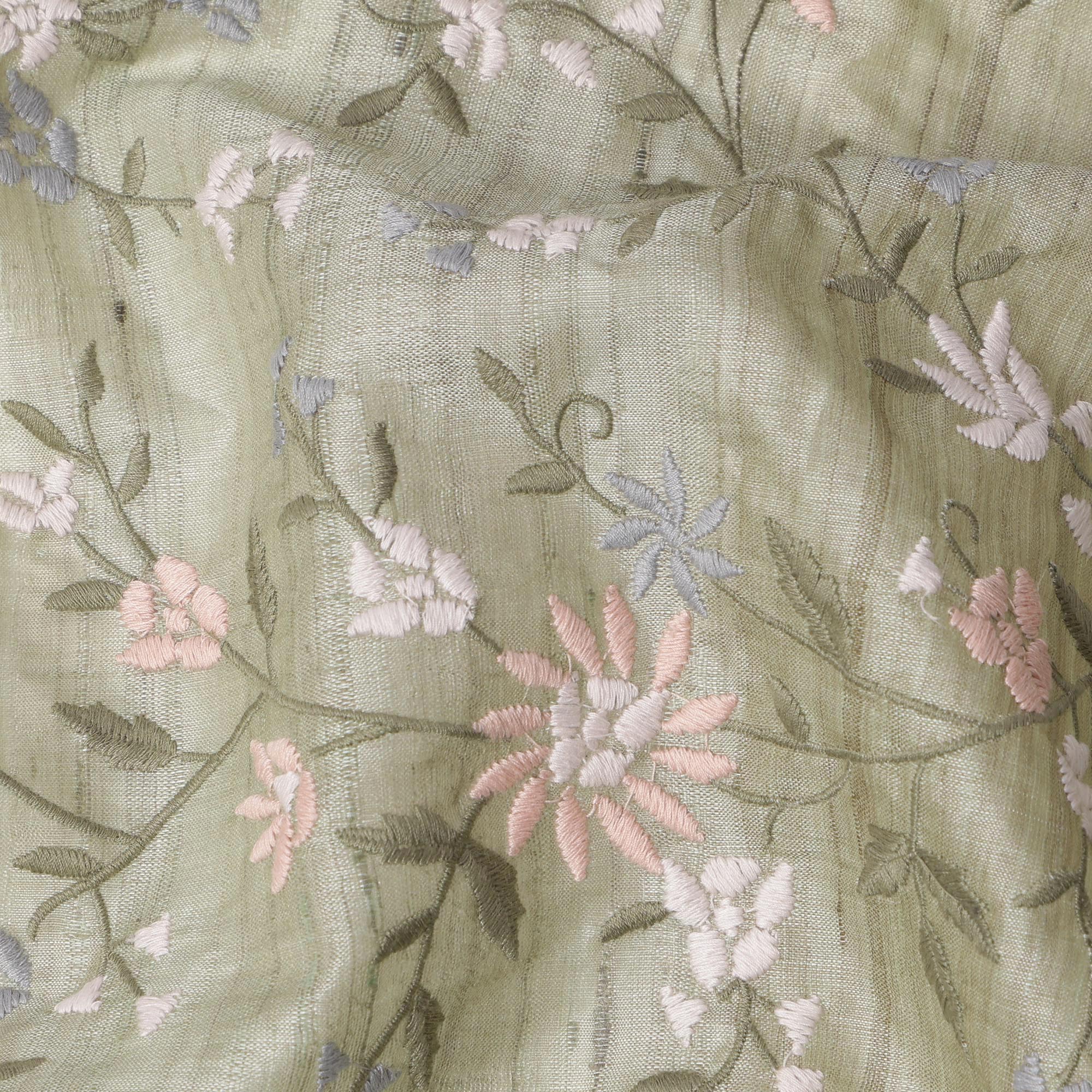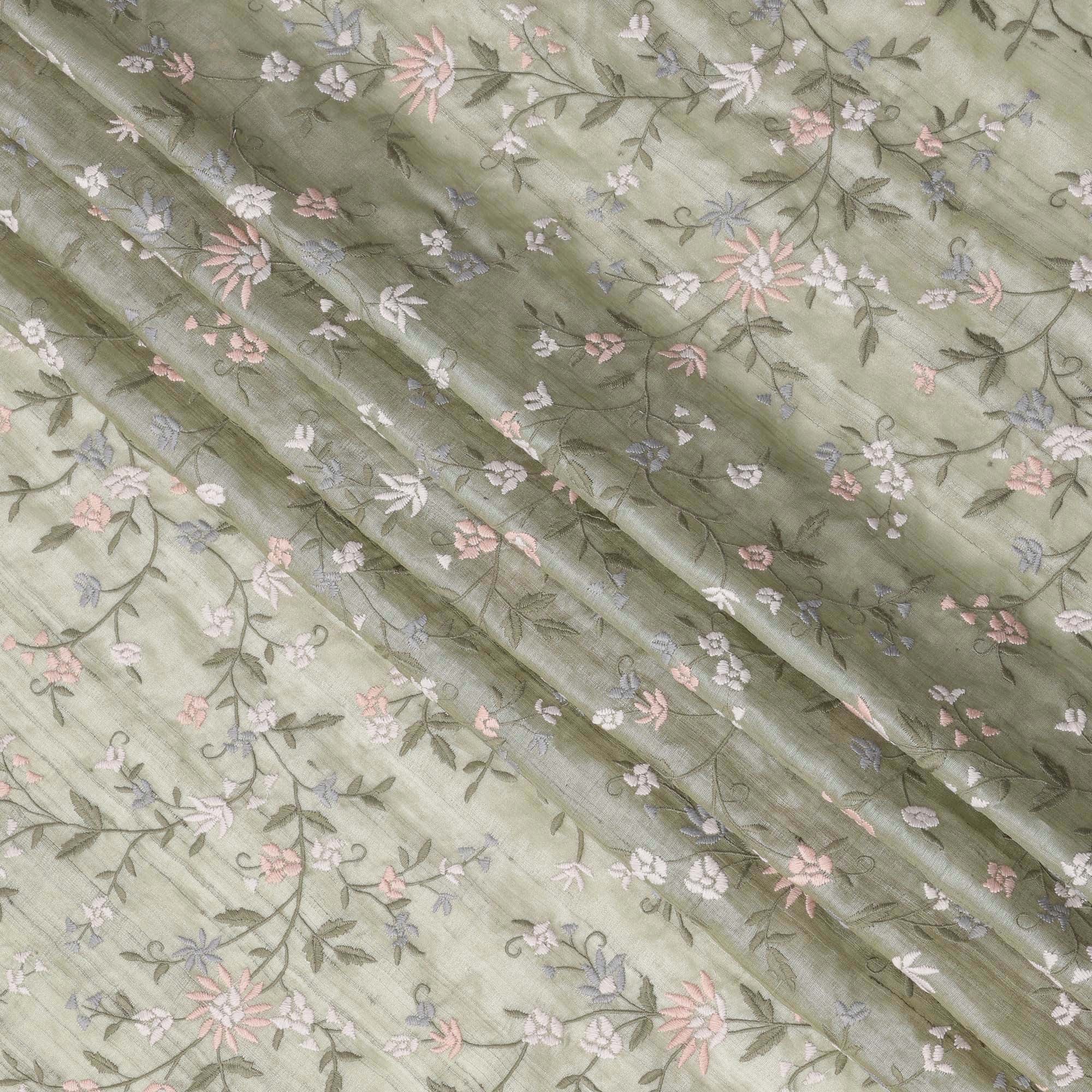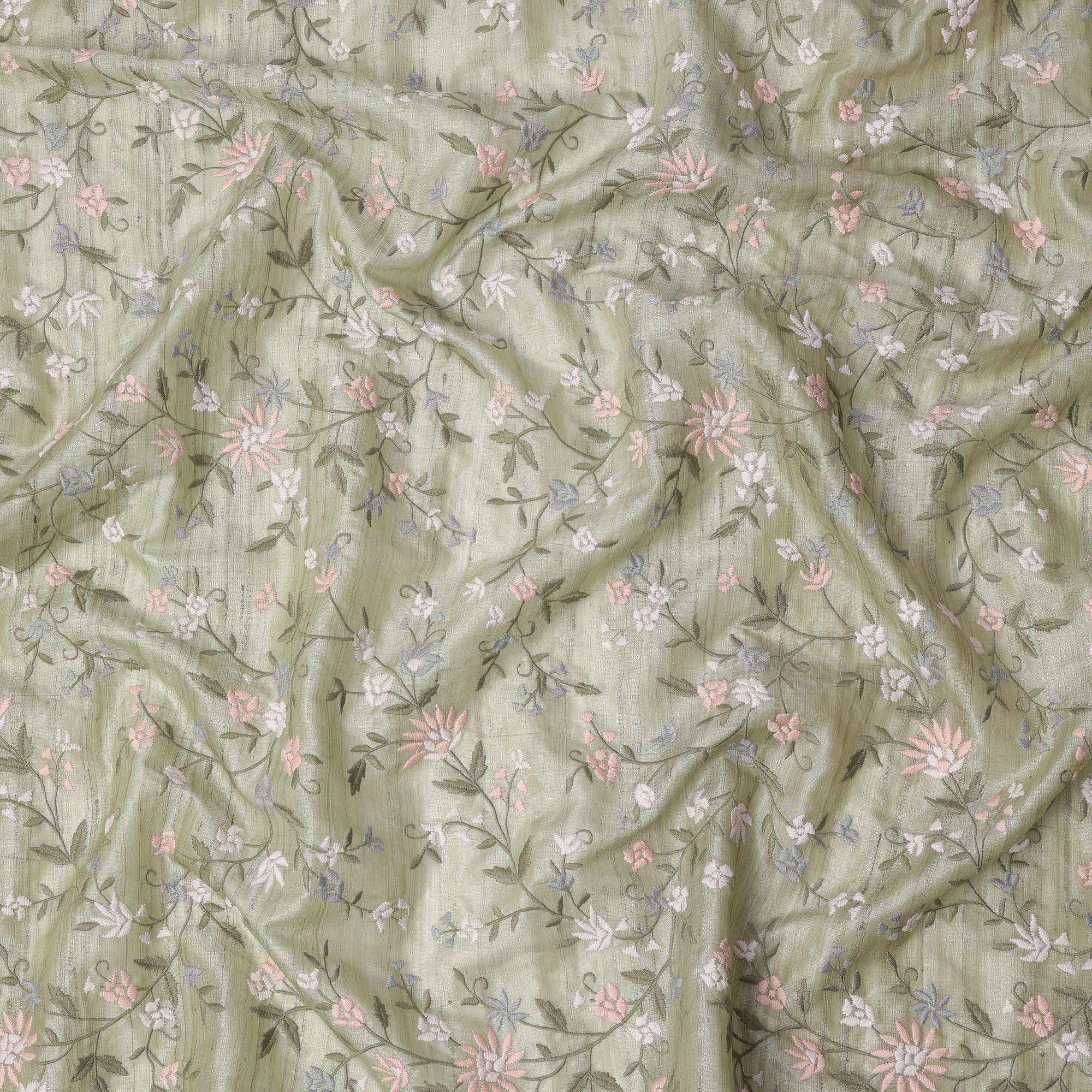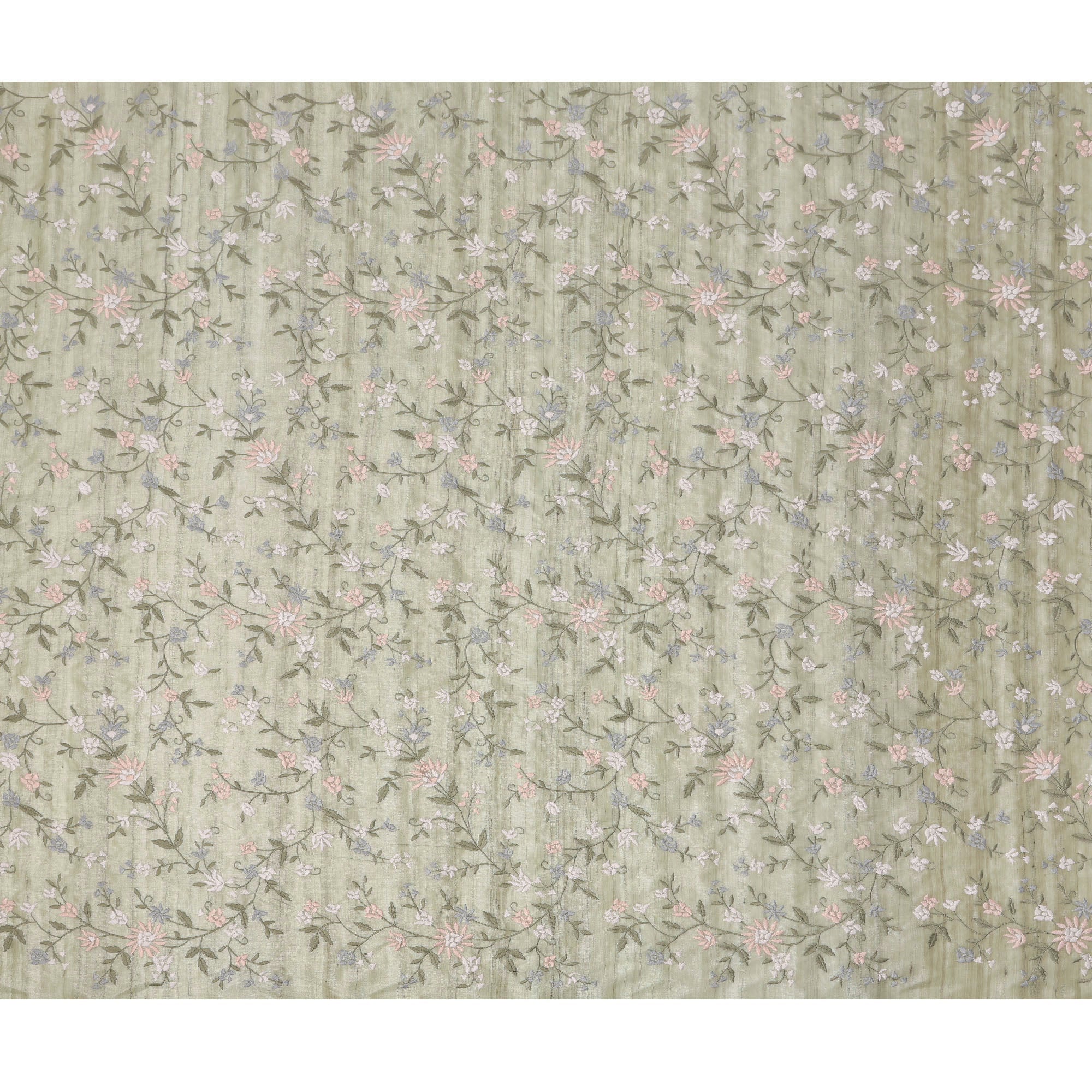 قماش حرير توسار مطرز بنقشة زهور الباستيل باللون الأخضر المريمية، عرض 110 سم، صنع في الهند -D23370