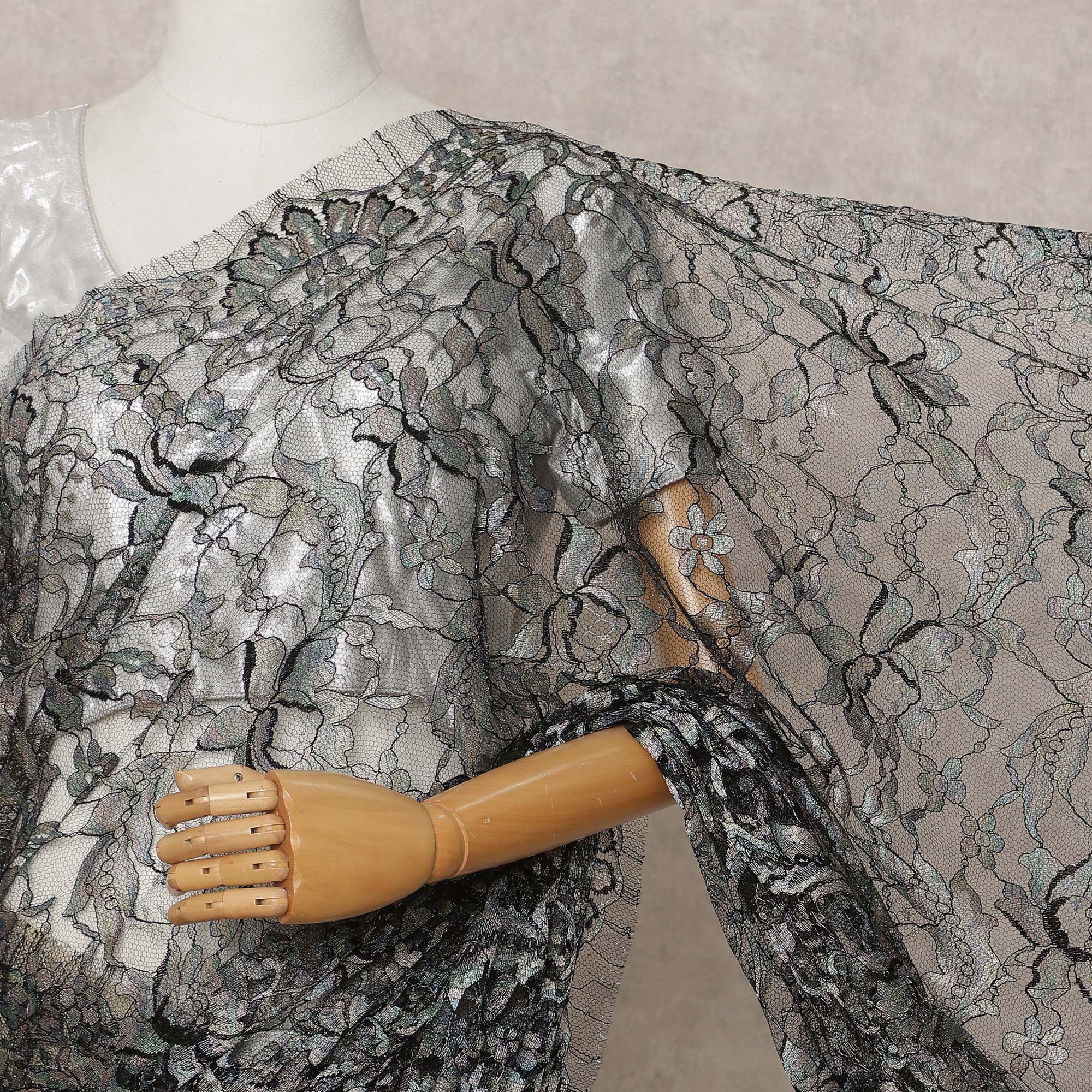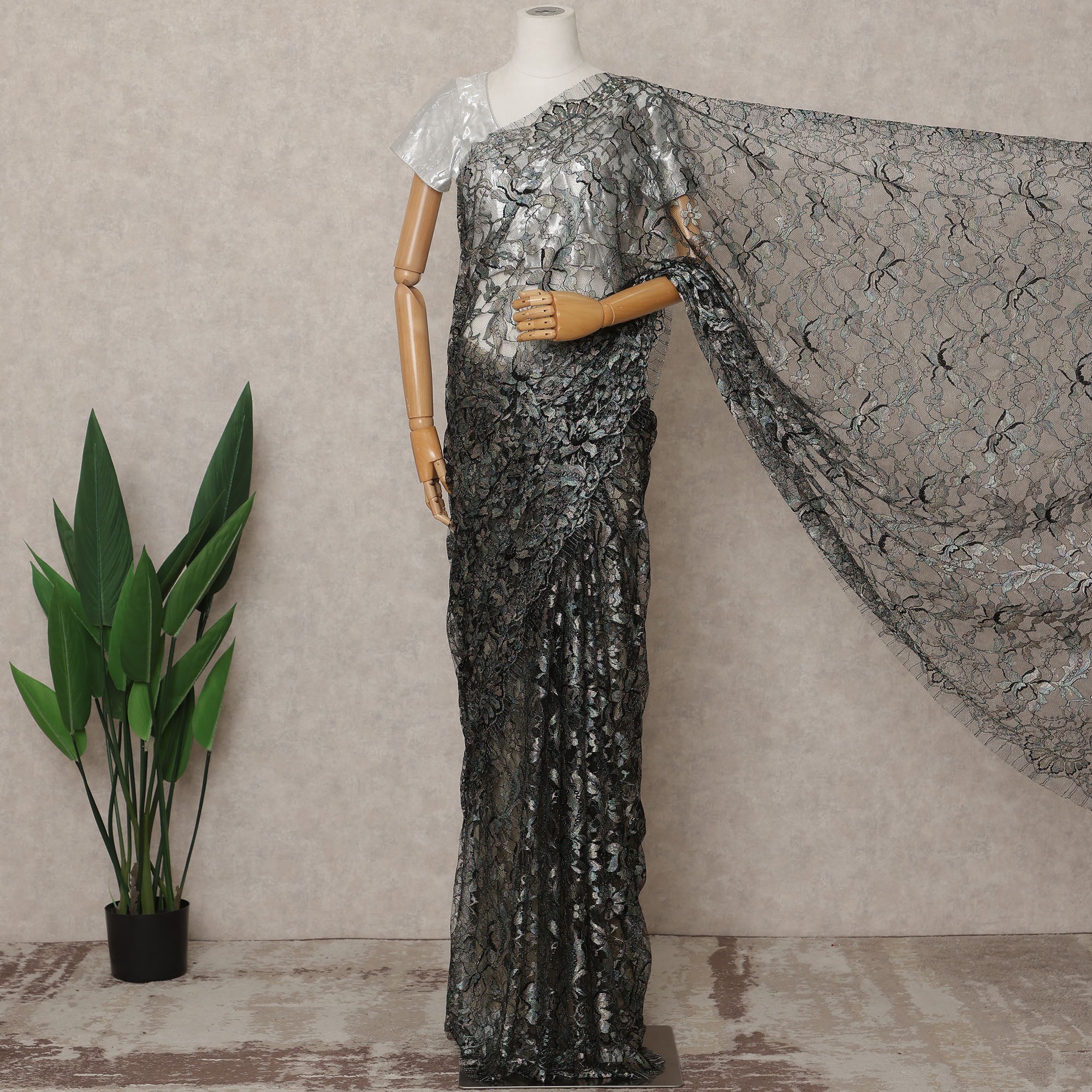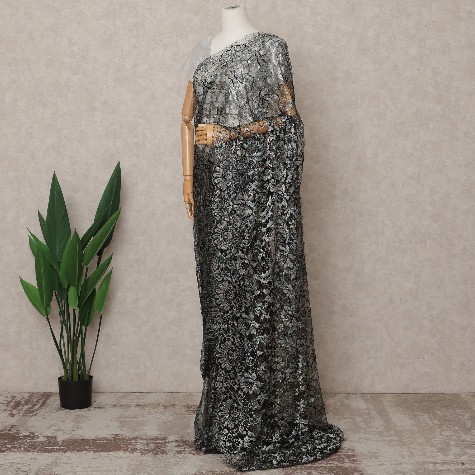 قماش ساري فرنسي فاخر متعدد الألوان من الدانتيل الشانتيلي باللون الفضي الأسود - طول 5.5 متر، عرض 110 سم، صنع في فرنسا - D25613
