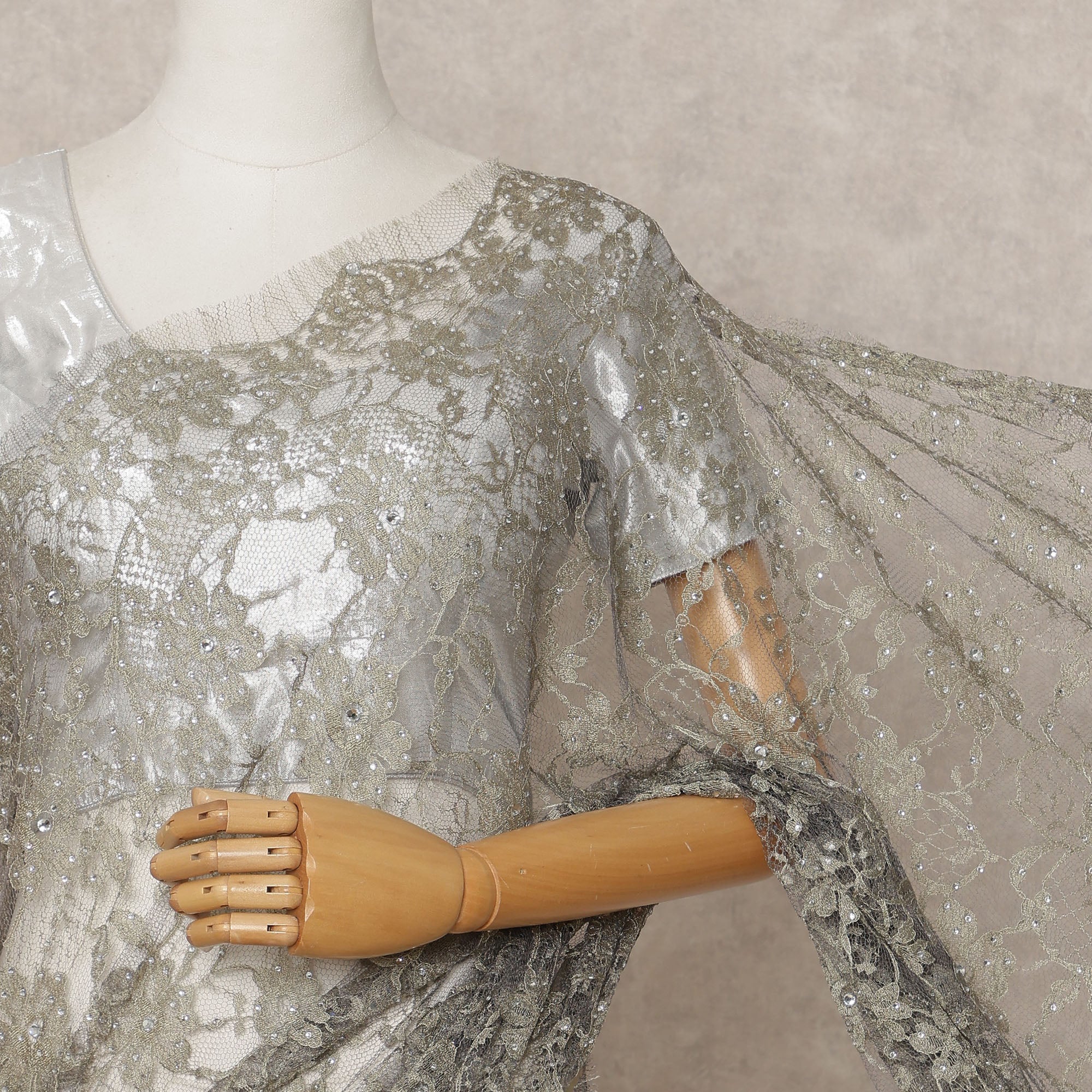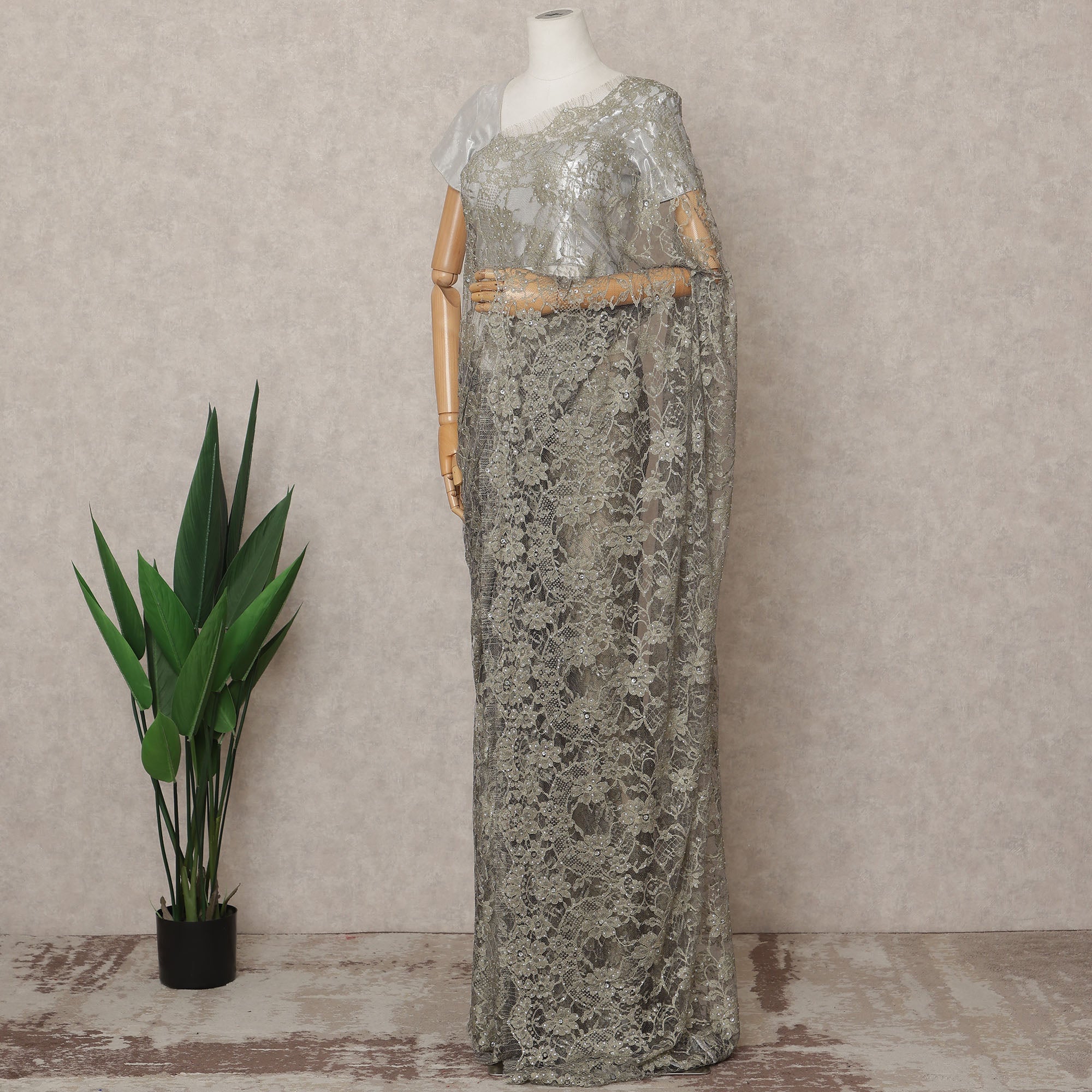 Silver Grey Premium French 2-Tone Chantilly Lace Saree with Stone Work, Width 110 Cms, Length 5.5 Mtrs, Imported from France-D25670