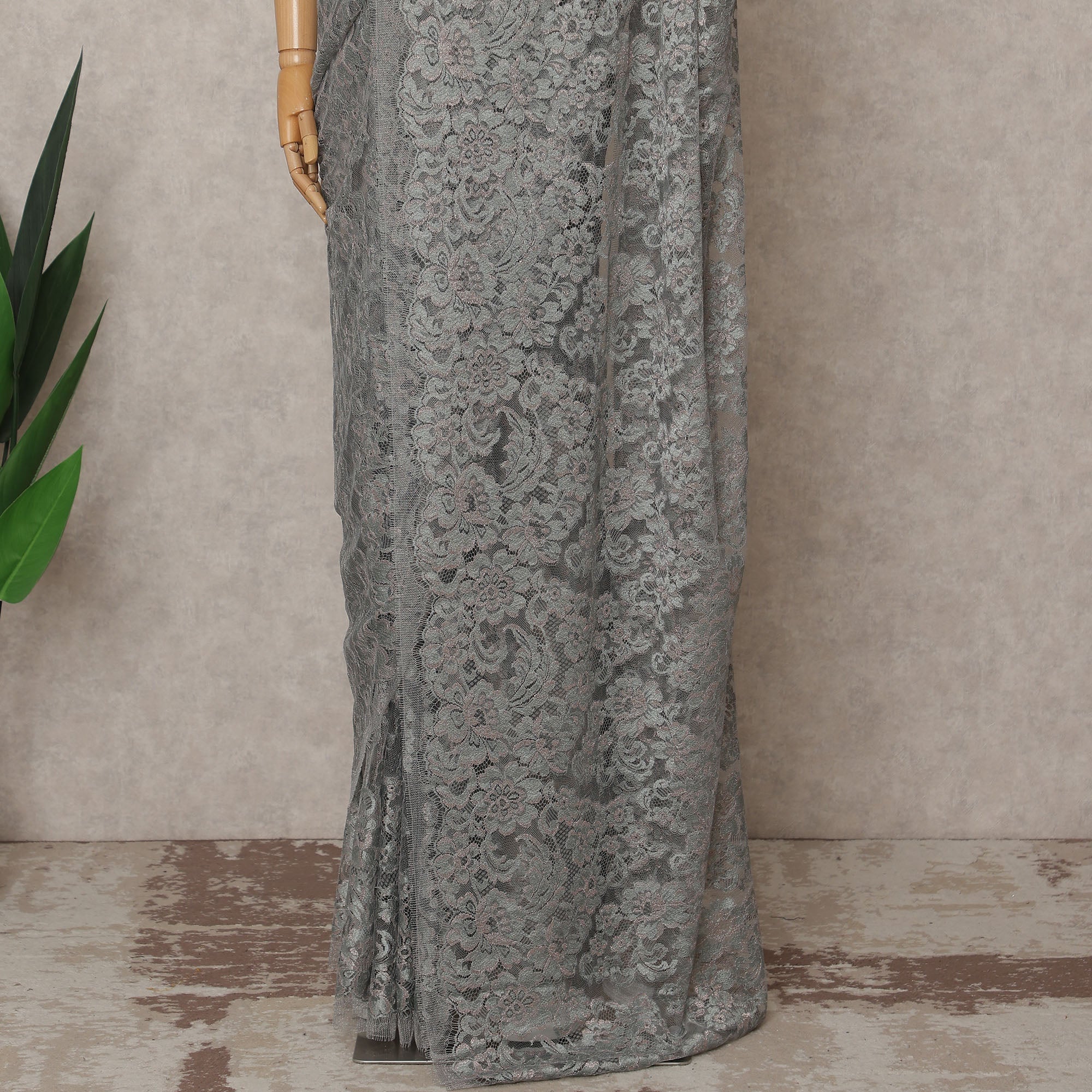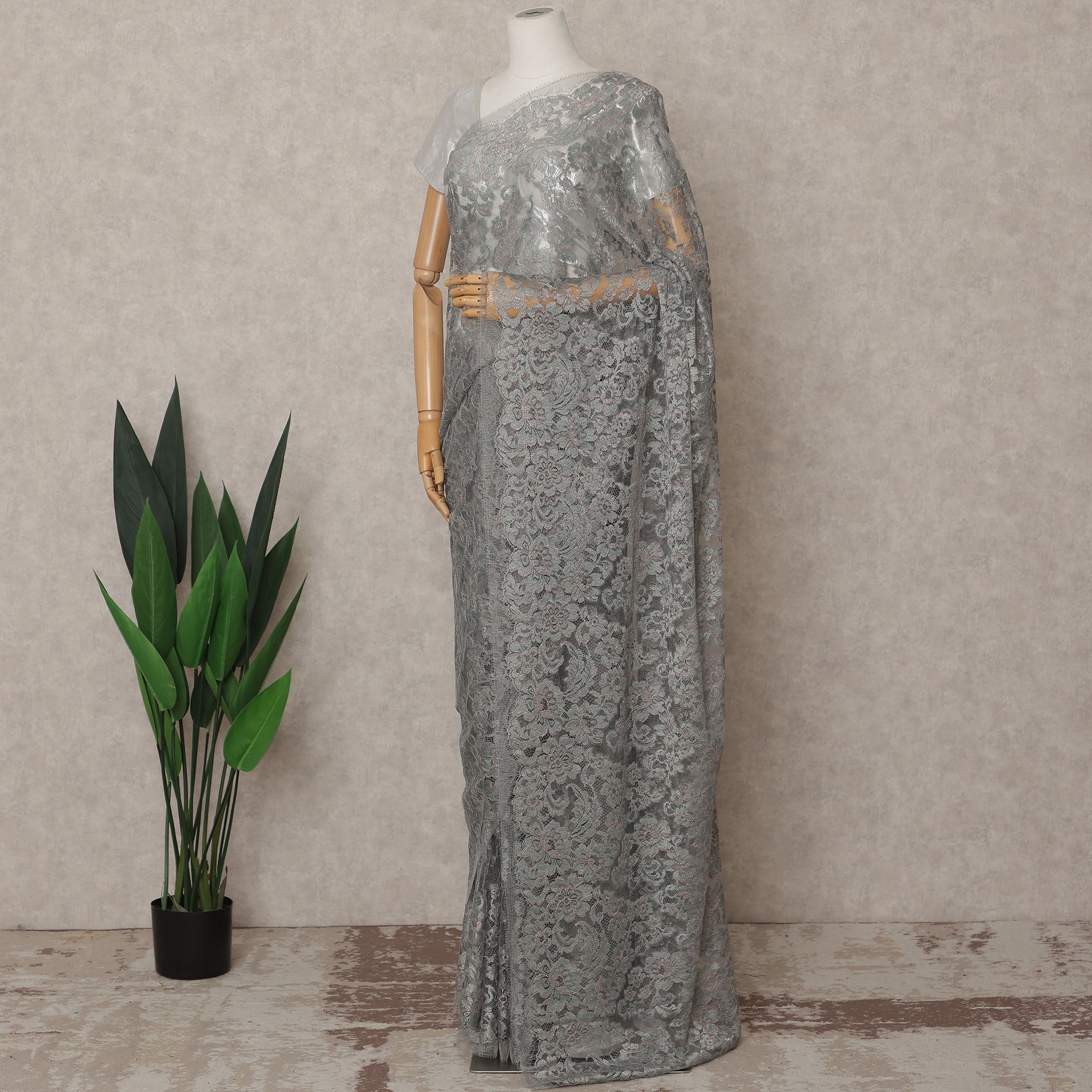 Silver Grey Premium French Metallic Chantilly Lace Saree – 5.5 Meters Length, 110 Cms Width, Crafted in France-D26115
