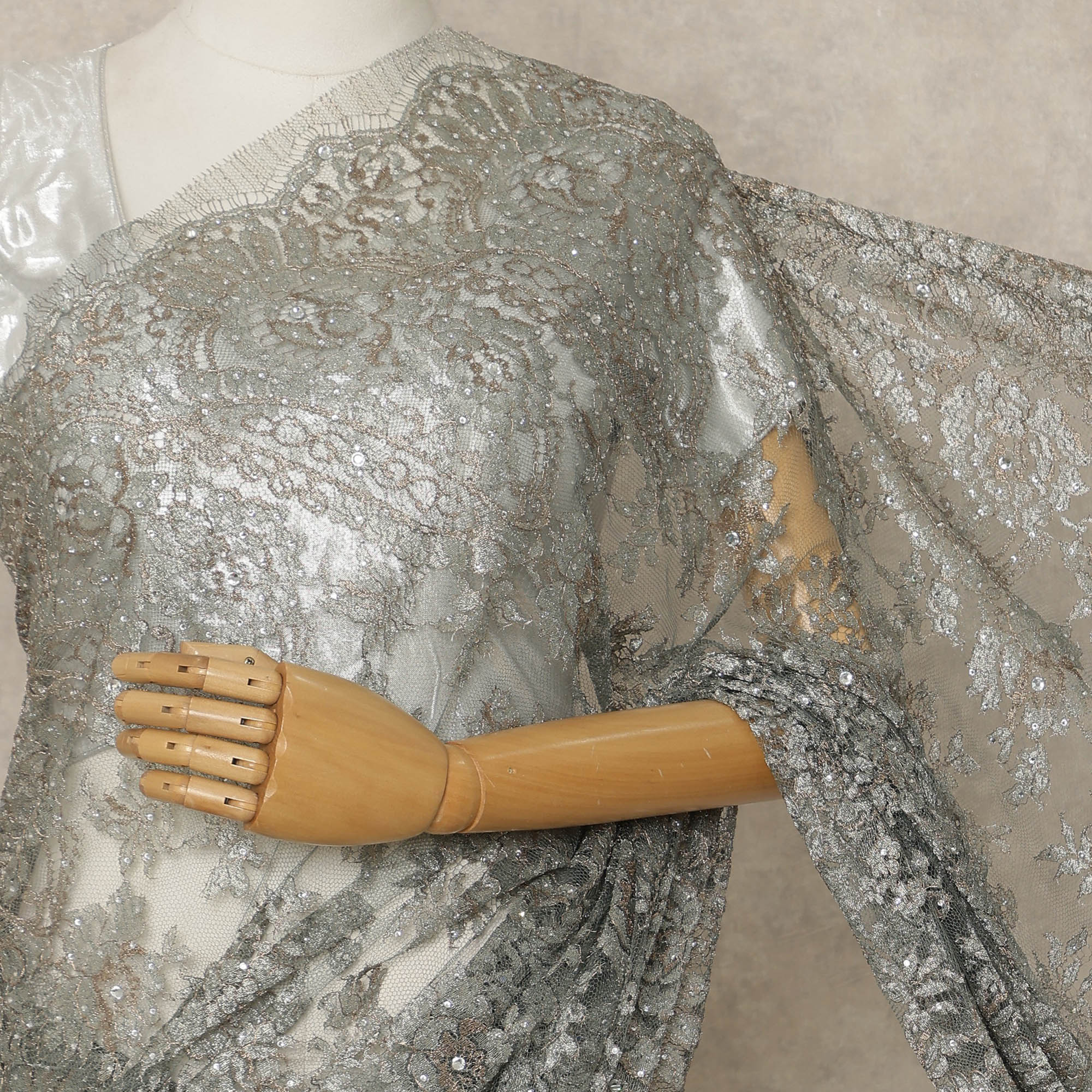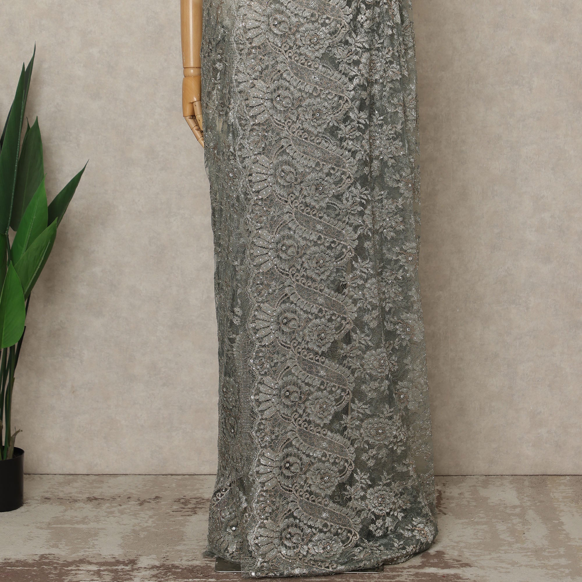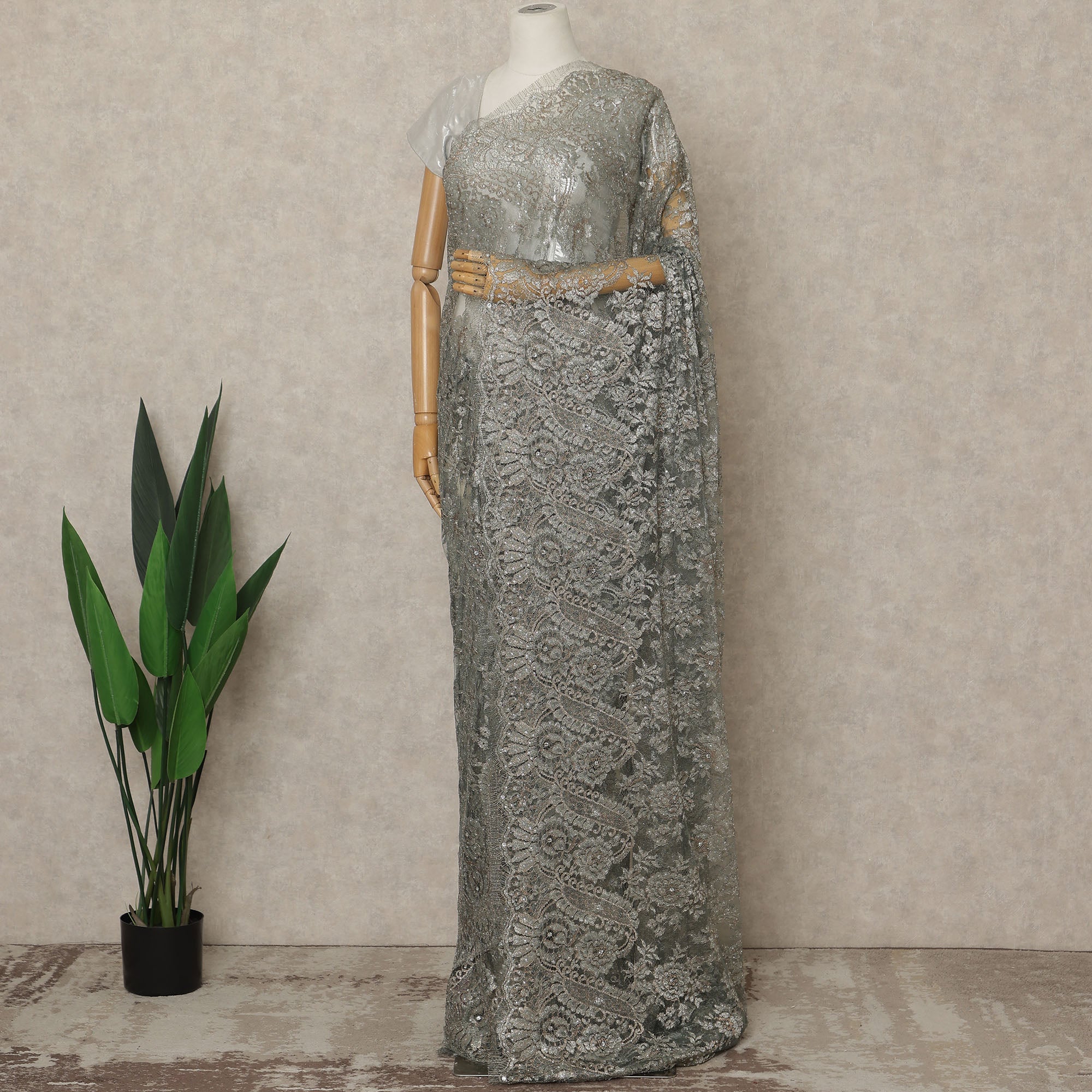 Step into refined elegance with this Silver Grey Premium French Metallic Chantilly Lace Saree, a luxurious masterpiece crafted in France that blends intricate lace artistry with a sophisticated metallic sheen; the graceful silver-grey tone elevates the delicate Chantilly floral patterns, while the shimmering highlights and intricately embellished stone work add a captivating radiance ideal for receptions, cocktail evenings, festive celebrations, and high-fashion events; woven with premium Regal Fabrics craftsmanship, this saree drapes effortlessly with a lightweight, fluid fall that enhances comfort and graceful movement, making it a perfect choice for those who love to shop online for exclusive designer sarees; measuring 5.5 meters in length and 110 cms in width, it allows versatile draping styles, and since the blouse is not included, it offers complete freedom to pair with contrasting or complementing fabrics to create your signature look; the saree beautifully embodies the finesse of authentic French lace with a modern metallic twist, making it a prized addition to any luxury wardrobe; for long-lasting beauty, dry clean only and store carefully to preserve its lustrous finish and intricate detailing.