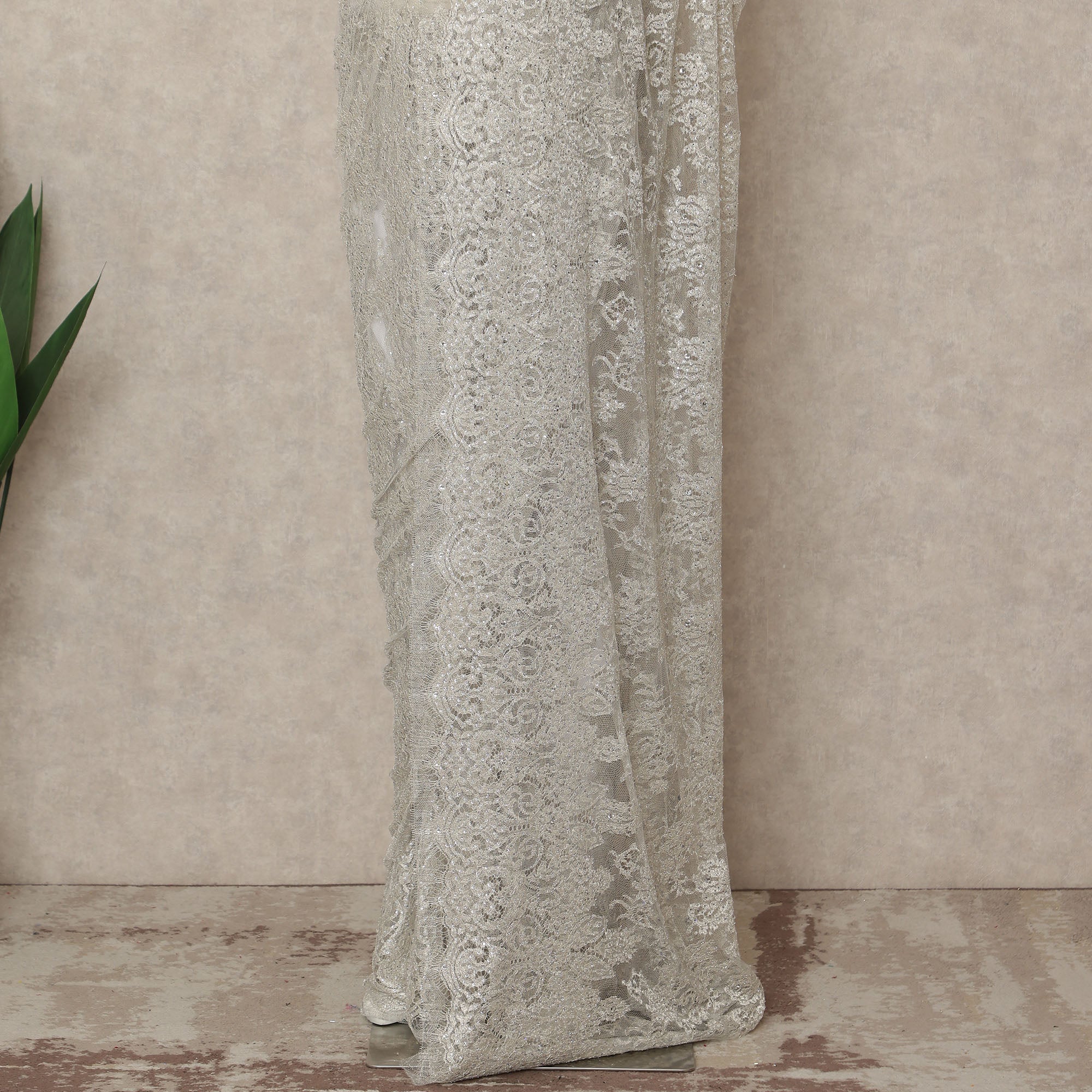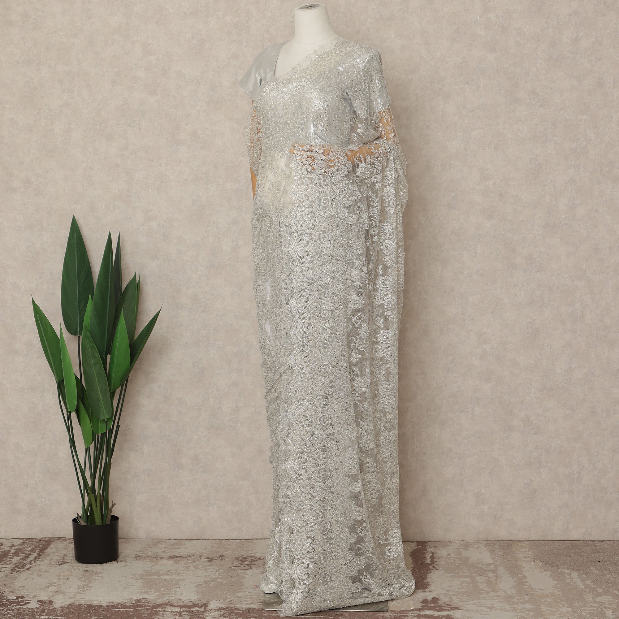 This silver grey premium French metallic Chantilly saree lace with stonework is a refined expression of modern elegance and timeless luxury. Crafted on a delicate sheer net base, it features intricate Chantilly floral motifs enhanced with metallic threadwork and carefully placed stone embellishments that create a soft, luminous sparkle. The sophisticated silver grey tone offers a graceful and versatile appeal, making it perfect for bridal wear, receptions, cocktail evenings, and grand festive occasions. Expertly crafted in France, this lace reflects superior artistry and premium quality. Measuring approximately 5.5 meters in length and 110 cms in width, it provides generous fabric for a beautifully flowing and elegant saree drape. Blouse not included.