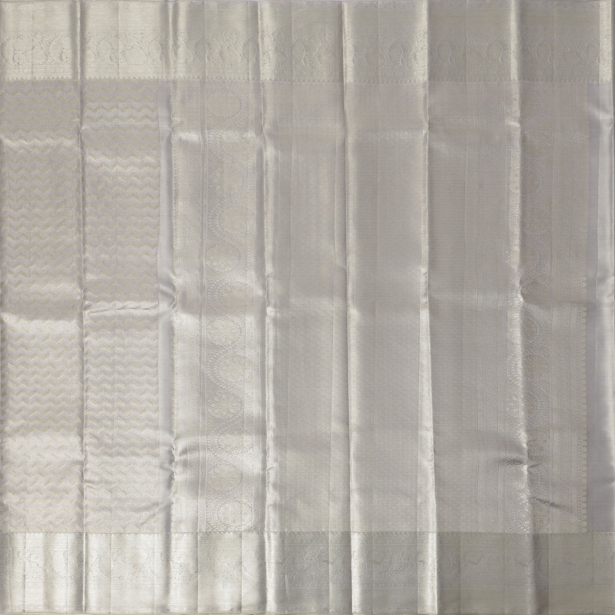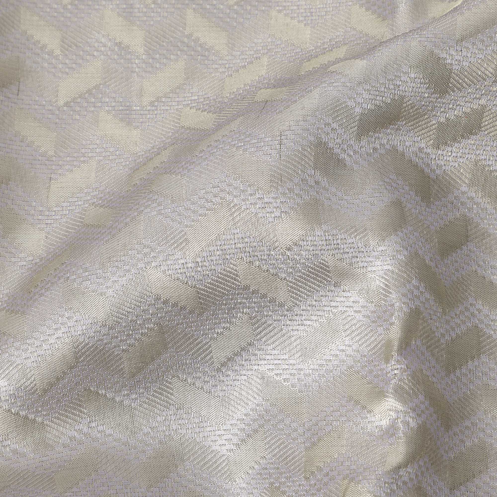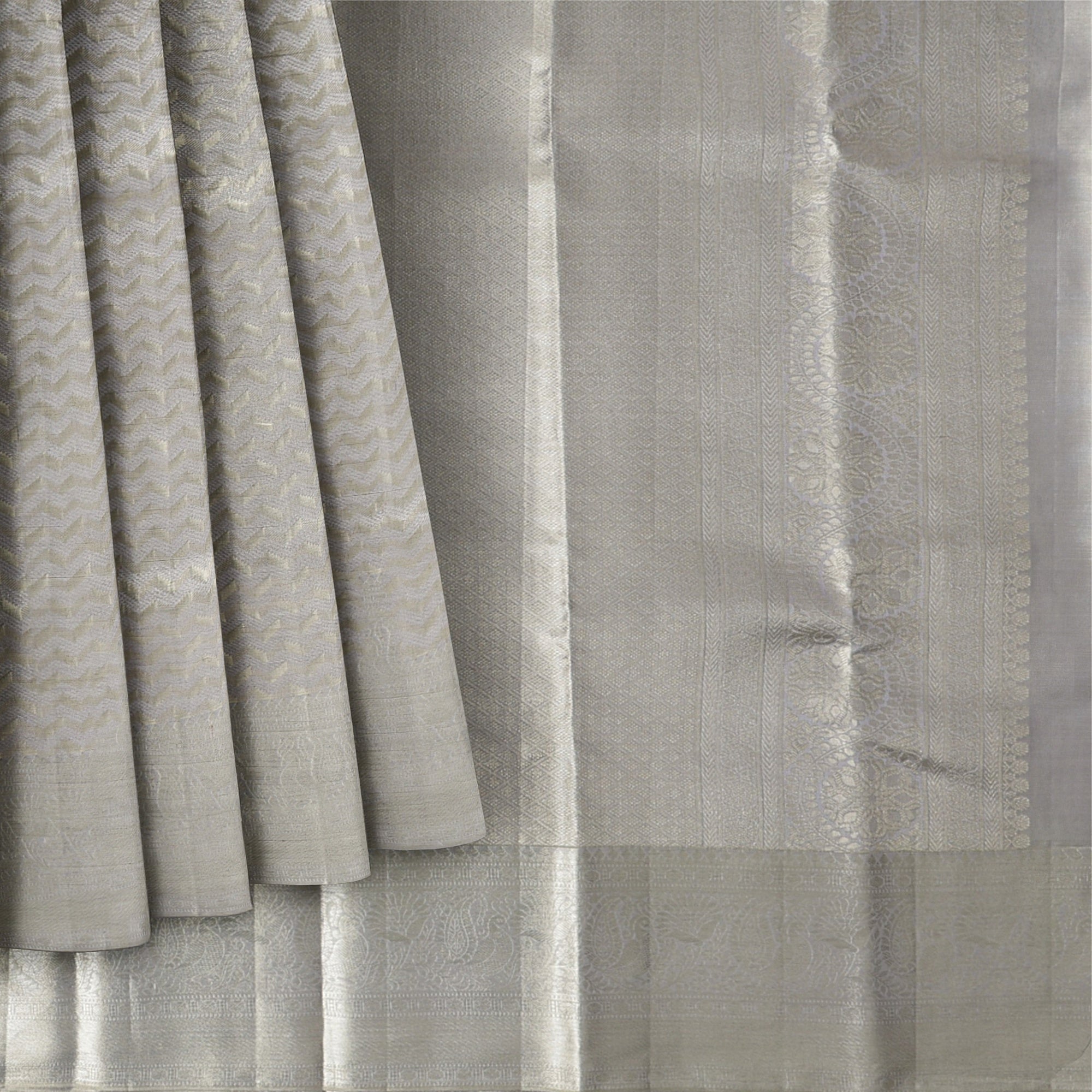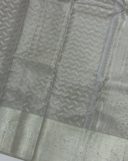 ساري زفاف كانجيفارام حرير نقي منسوج ذاتيًا باللون الرمادي الفضي، بنقشة شيفرون، بنمط هندسي رقيق، عرض 110 سم، صنع في الهند - D22755