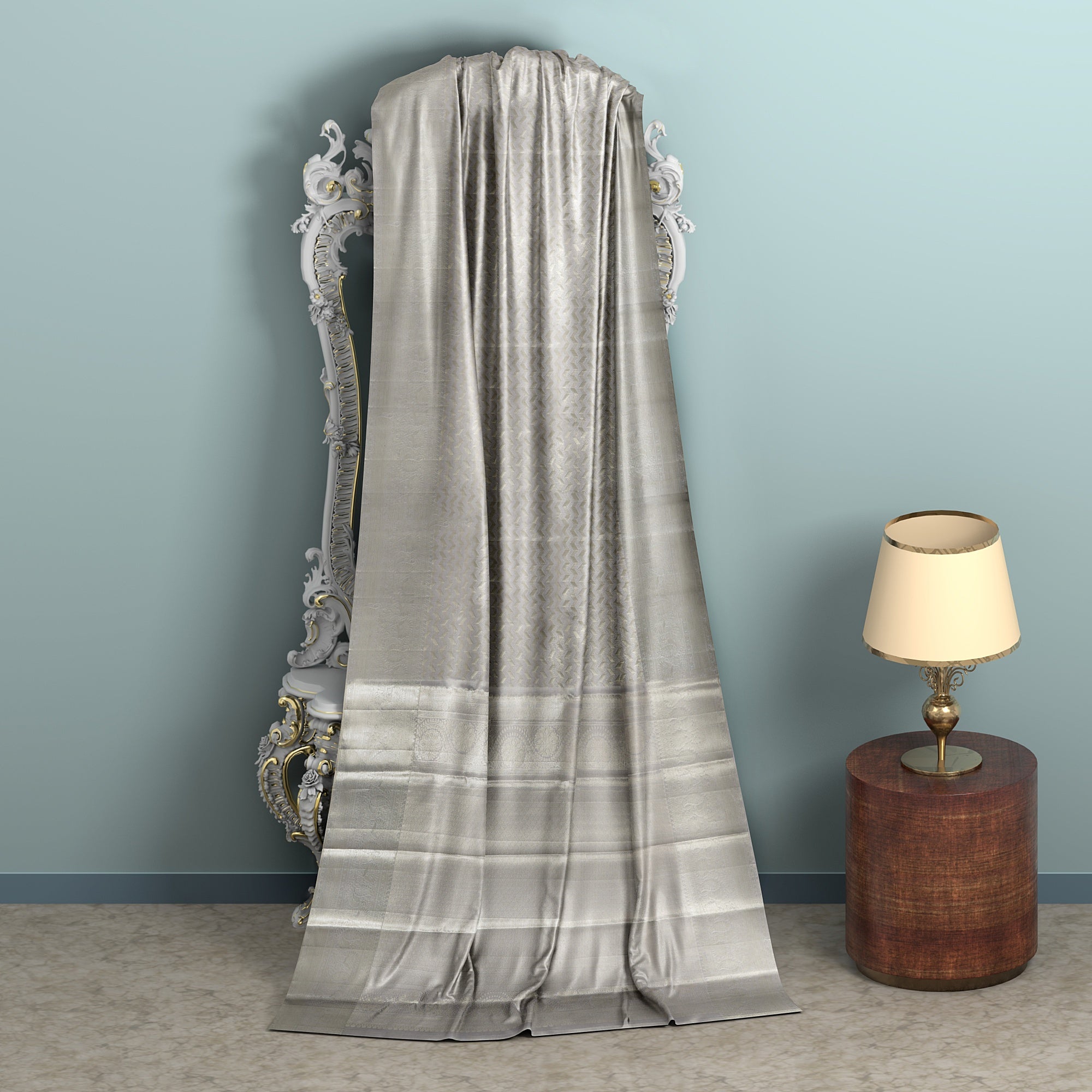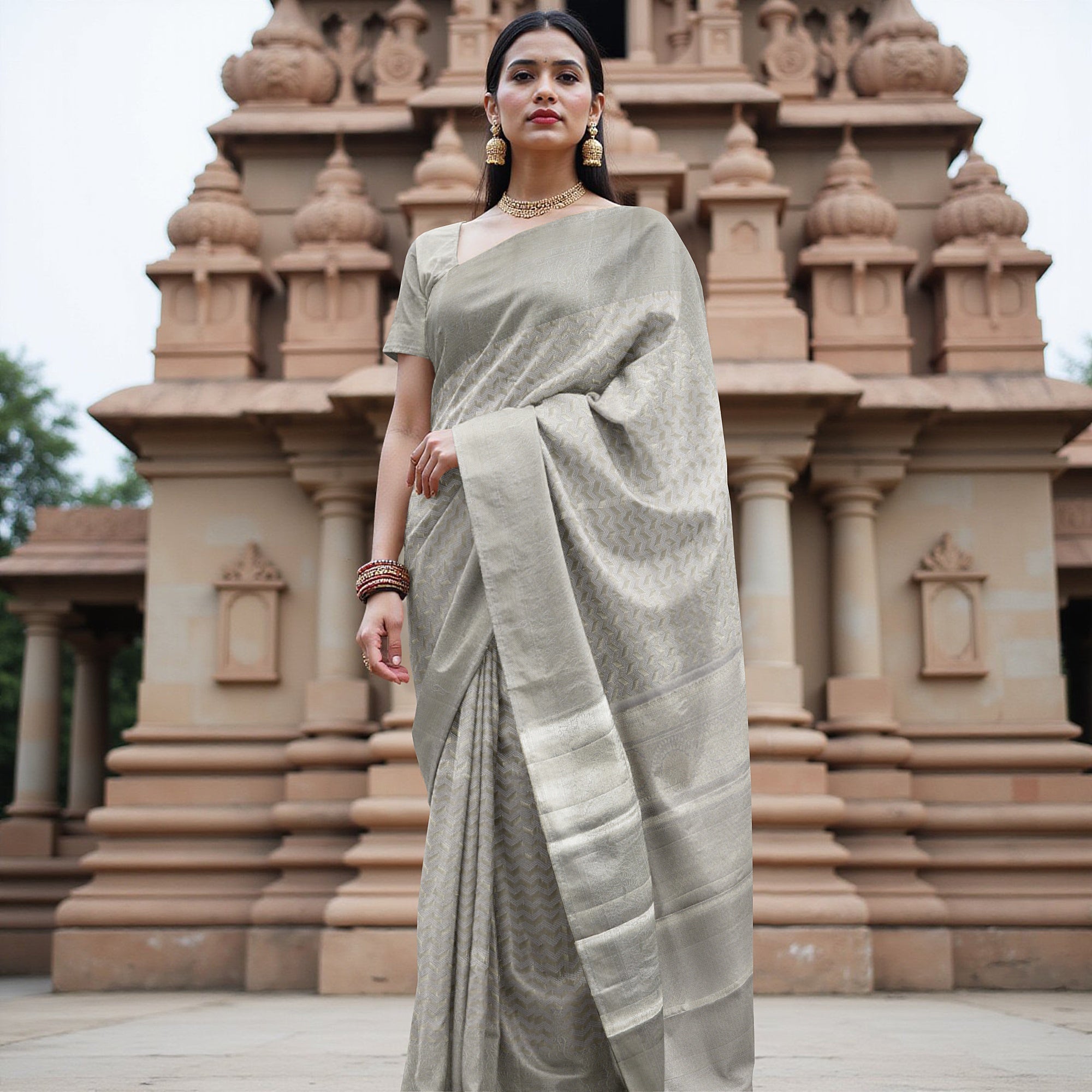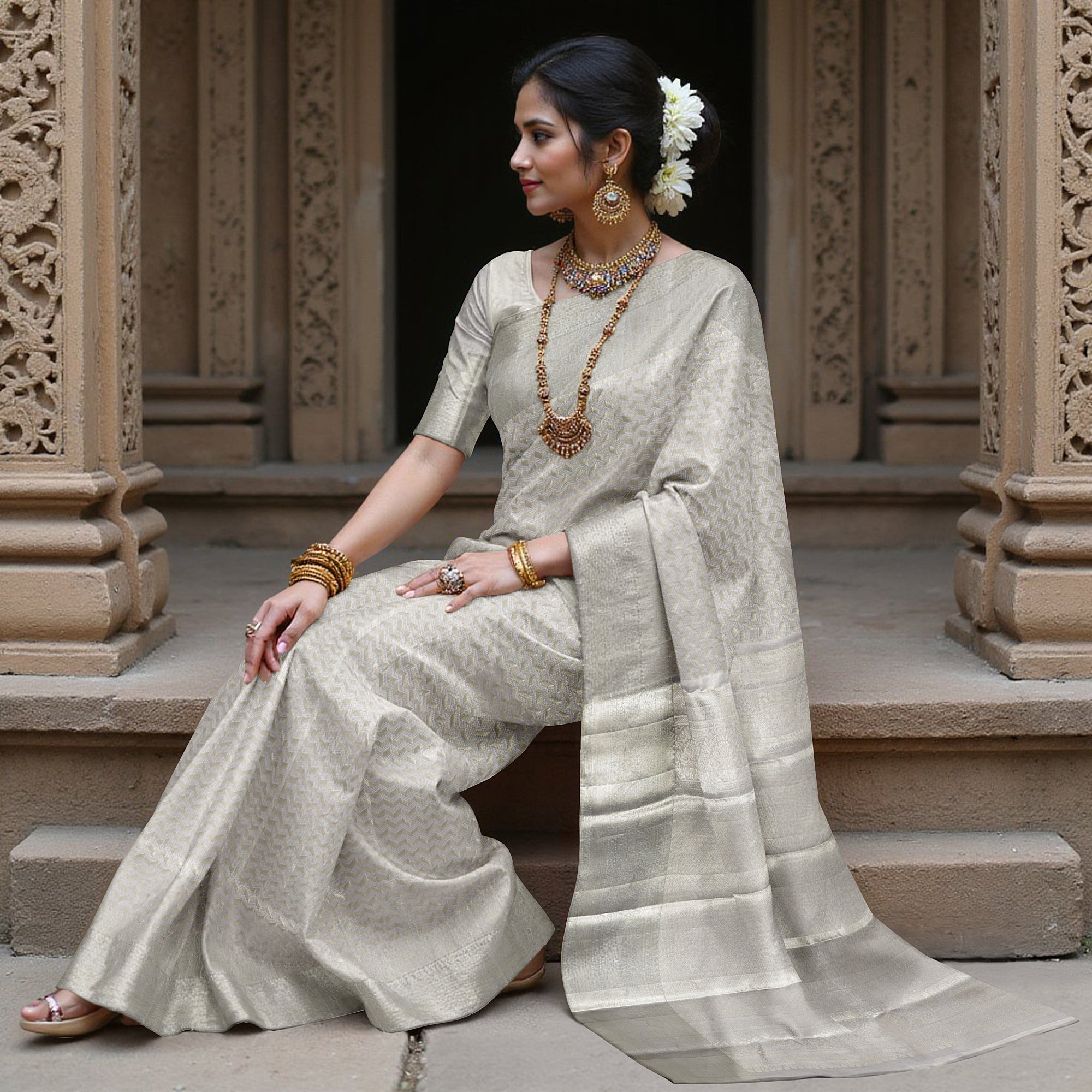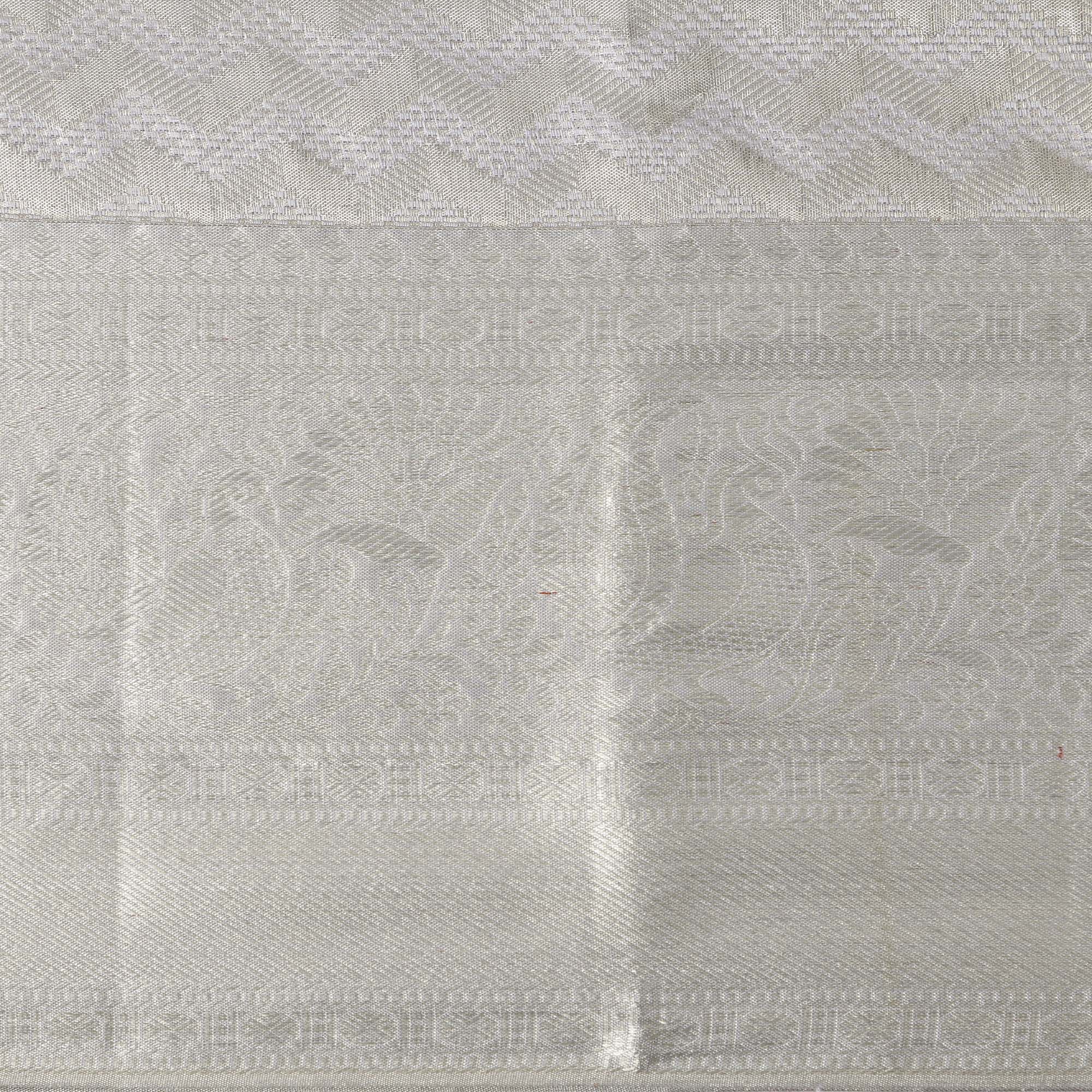 ساري زفاف كانجيفارام حرير نقي منسوج ذاتيًا باللون الرمادي الفضي، بنقشة شيفرون، بنمط هندسي رقيق، عرض 110 سم، صنع في الهند - D22755