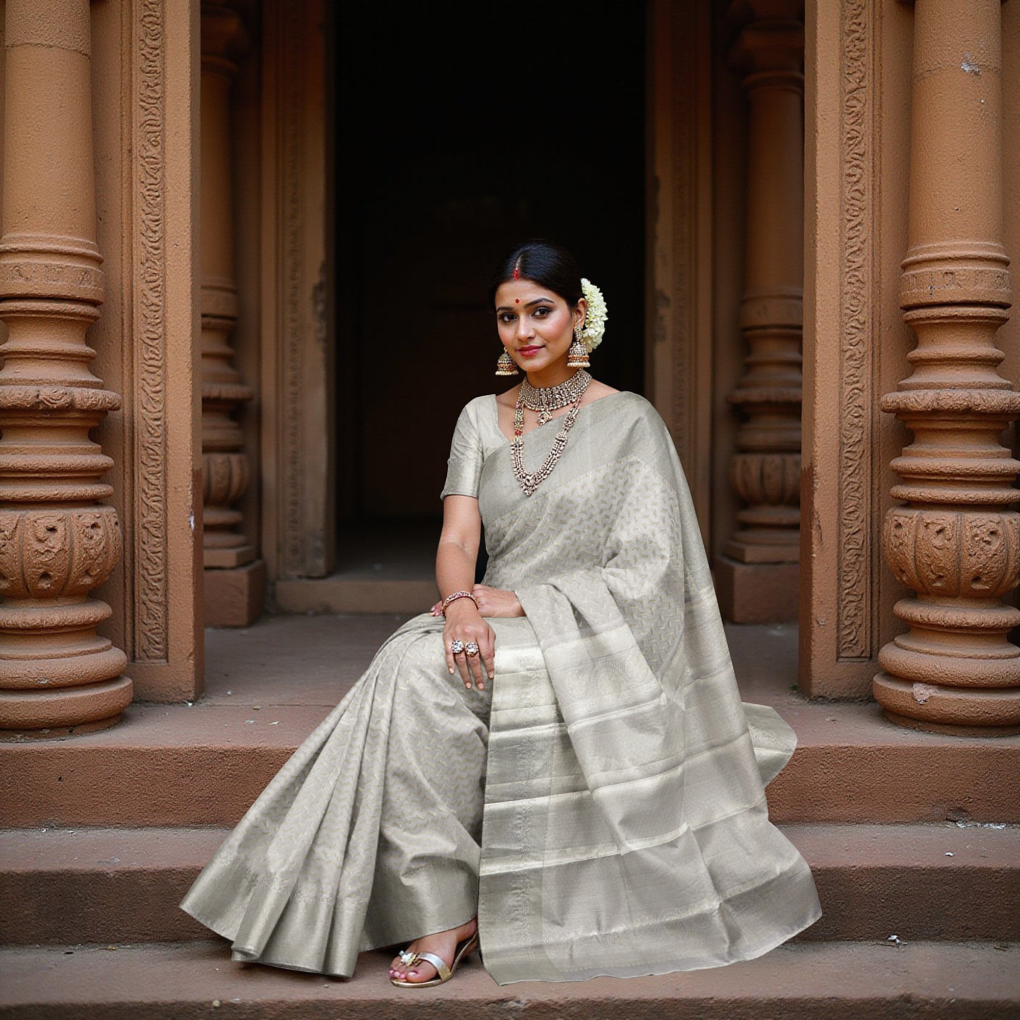 ساري زفاف كانجيفارام الفضي الرمادي، المصنوع من الحرير الخالص، يتميز برشاقة وتألق لا مثيل لهما، ويعكس الرقي البسيط الذي تجسده المنحوتات الحجرية القديمة ولوحات المعابد الجدارية. زُيّن الجسم ببراعة بنقوش شيفرون ذاتية الزاري تلتقط الضوء برقة، مما يخلق لمسة من التألق والعصرية الخالدة. مستوحى من إيقاع التناظر الهندي الكلاسيكي، يعكس الساري أناقة هادئة مثالية للعروس الجذابة. صُنع هذا الساري من أقمشة ريجال، ويستغرق نسجه 48 ساعة من الإتقان اليدوي الدقيق، حيث تلتقي التقاليد بالدقة. يتدفق ثنياته الناعمة بسلاسة، مما يجعله خيارًا مثاليًا لأي مناسبة احتفالية. يأتي مع بلوزة متناسقة، ليصبح ساريًا لا يُنسى، يمكنكِ شراؤه عبر الإنترنت والاحتفاظ به للأبد.
