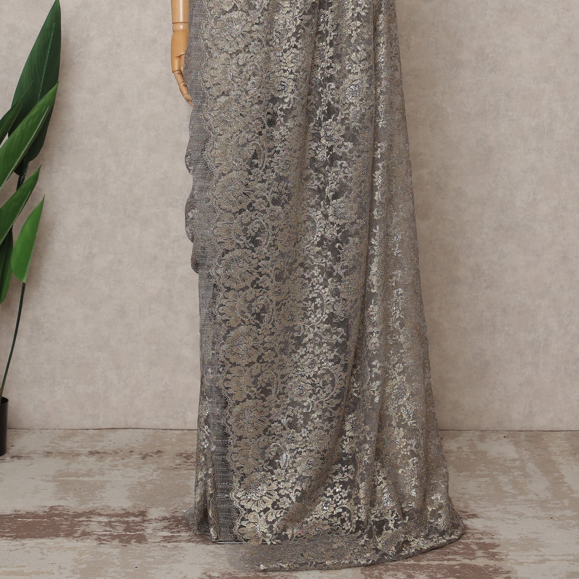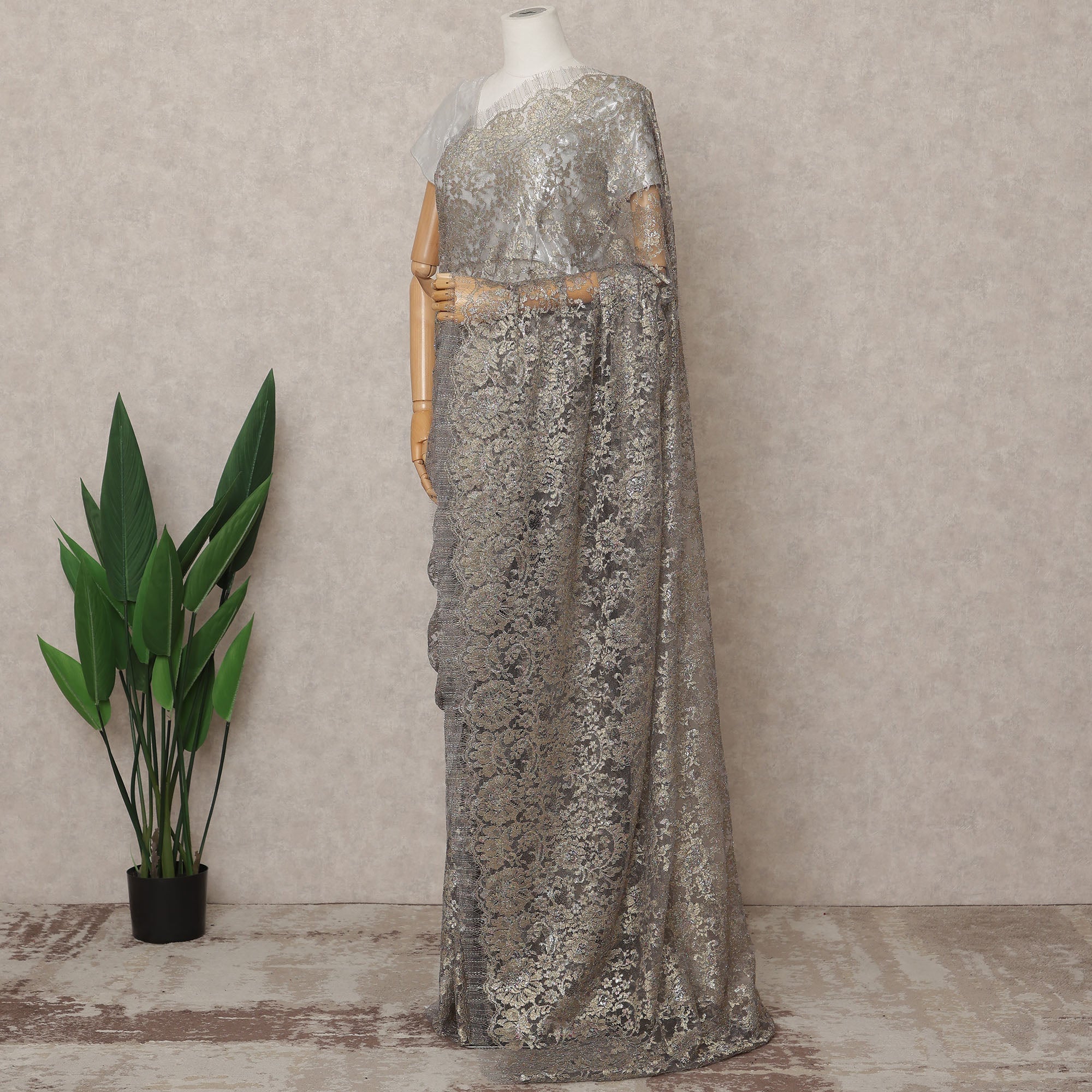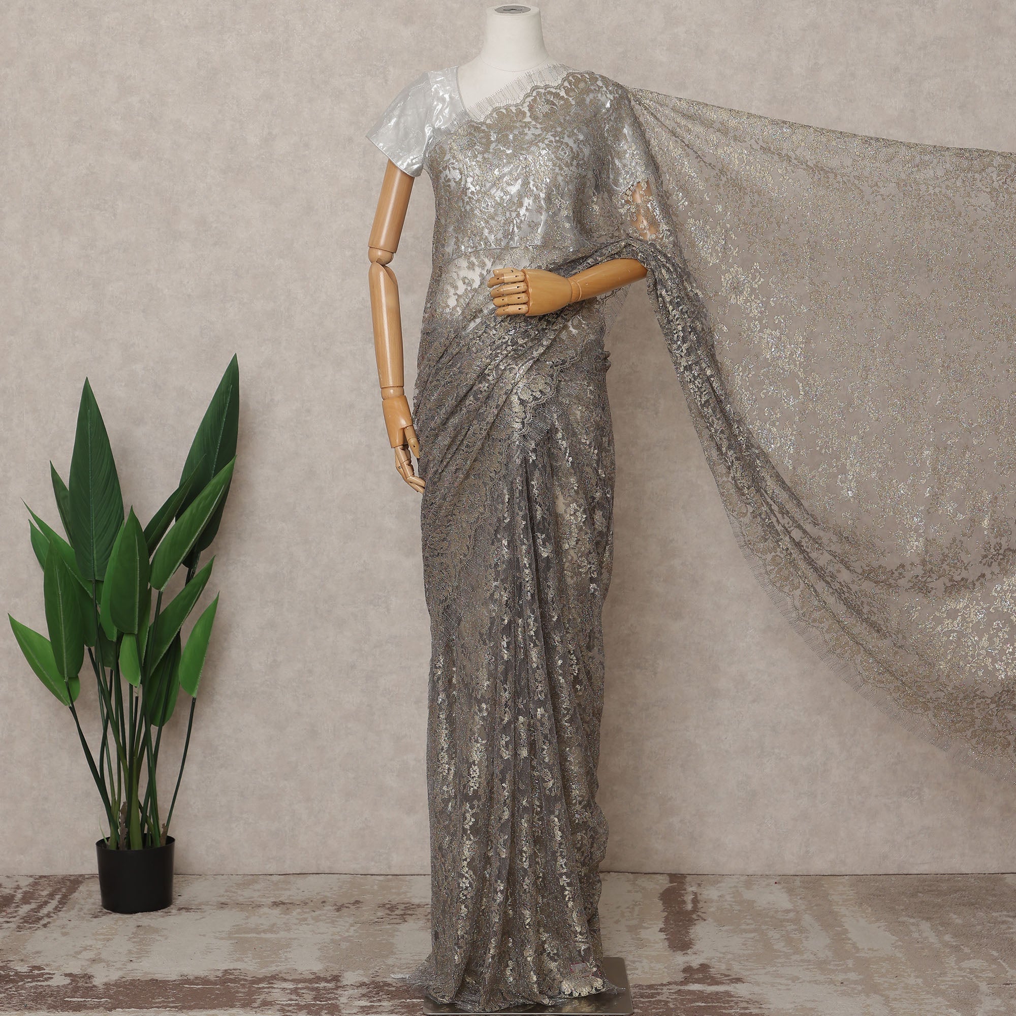 قماش ساري شانتيلي فضي معدني فاخر مصنوع في فرنسا
