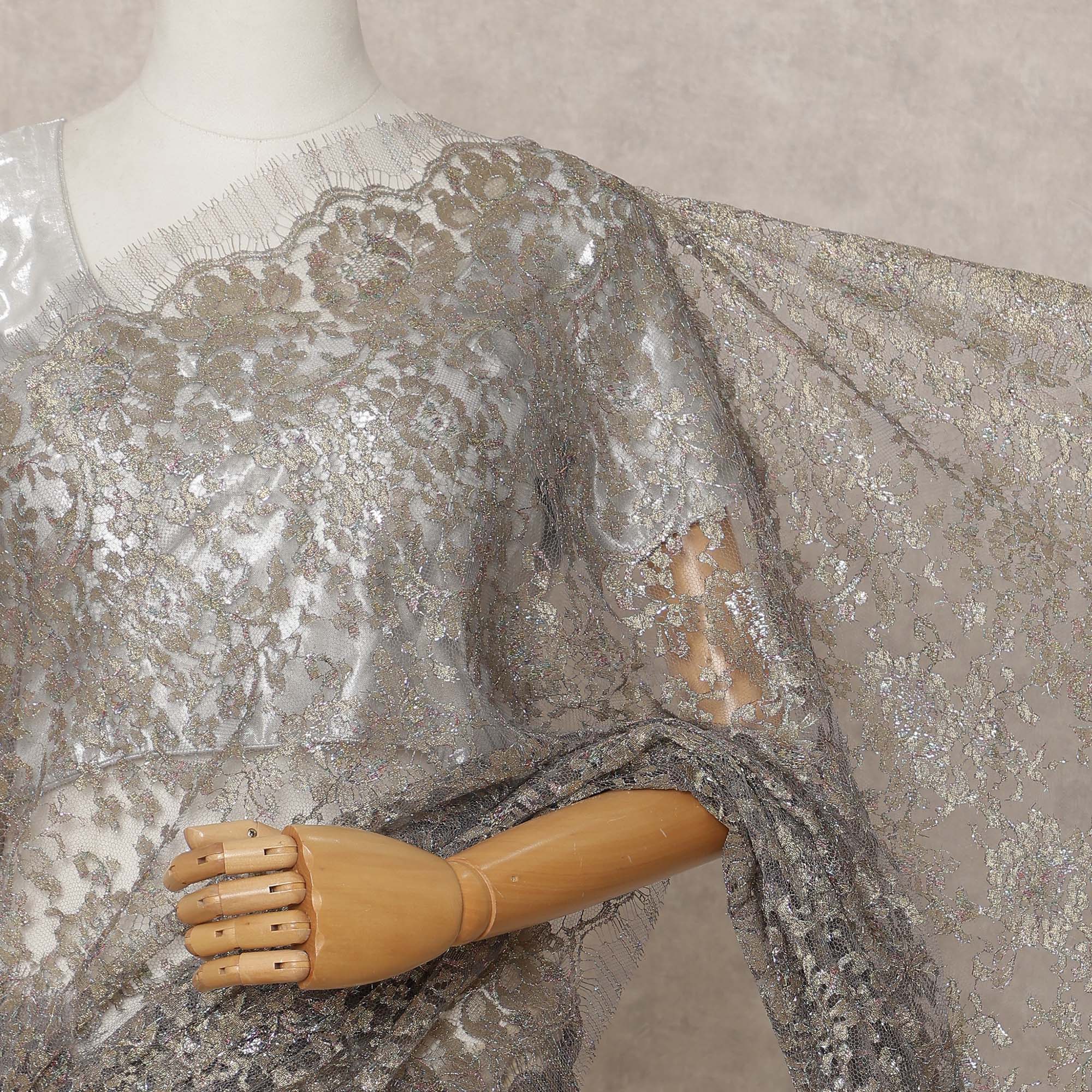 قماش ساري فرنسي فاخر من الدانتيل الشانتيلي المعدني الفضي - طول 5.5 متر، عرض 110 سم، صنع في فرنسا - D25602