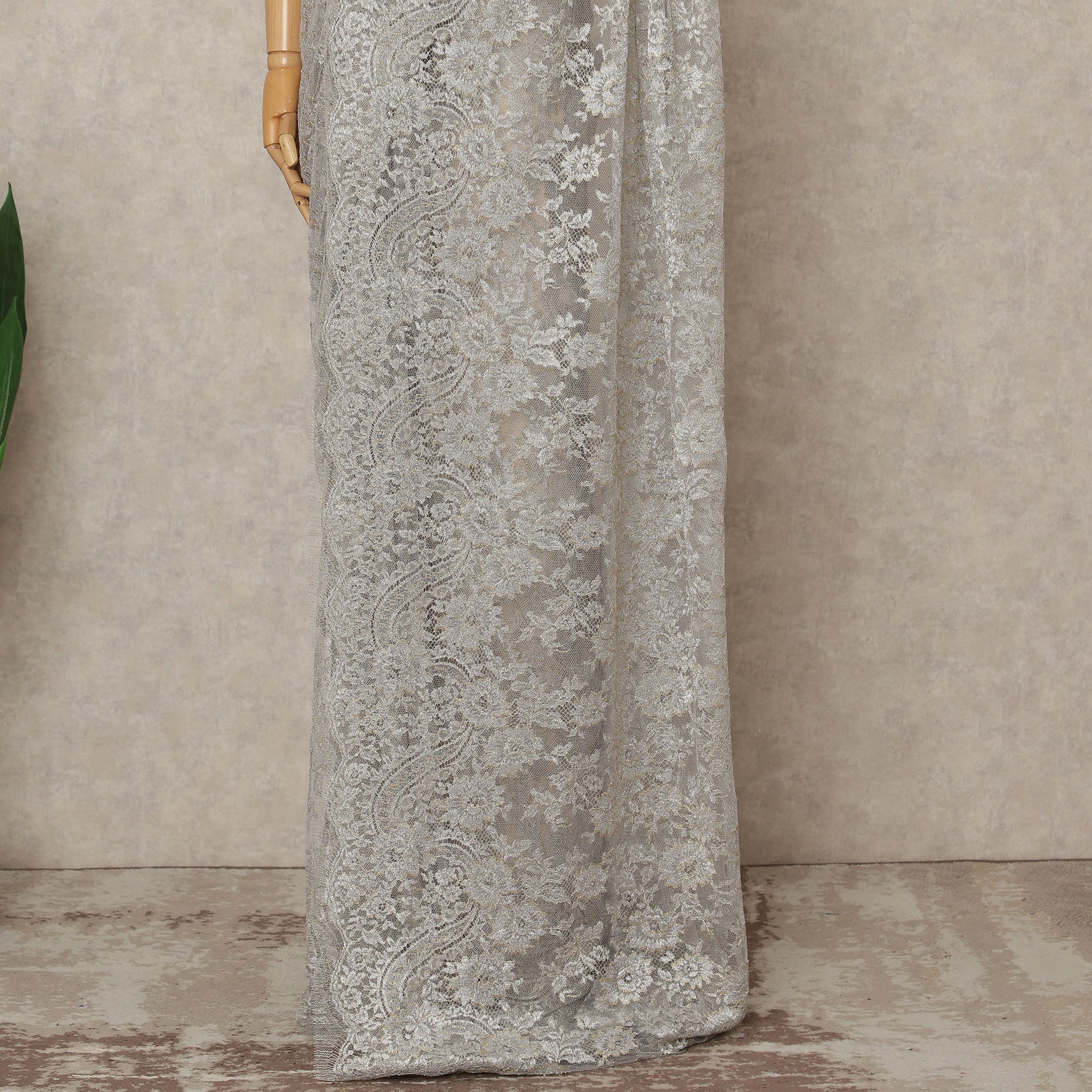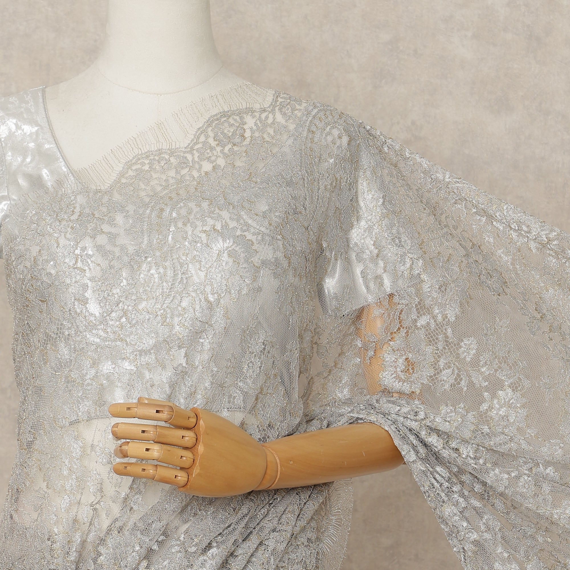Silver Premium French Metallic Chantilly Lace Saree Fabric, 5.5 Mtrs Length, 110 Cms Width, Crafted in France – Exquisite Metallic Floral Lace, Blouse Not Included-D26419