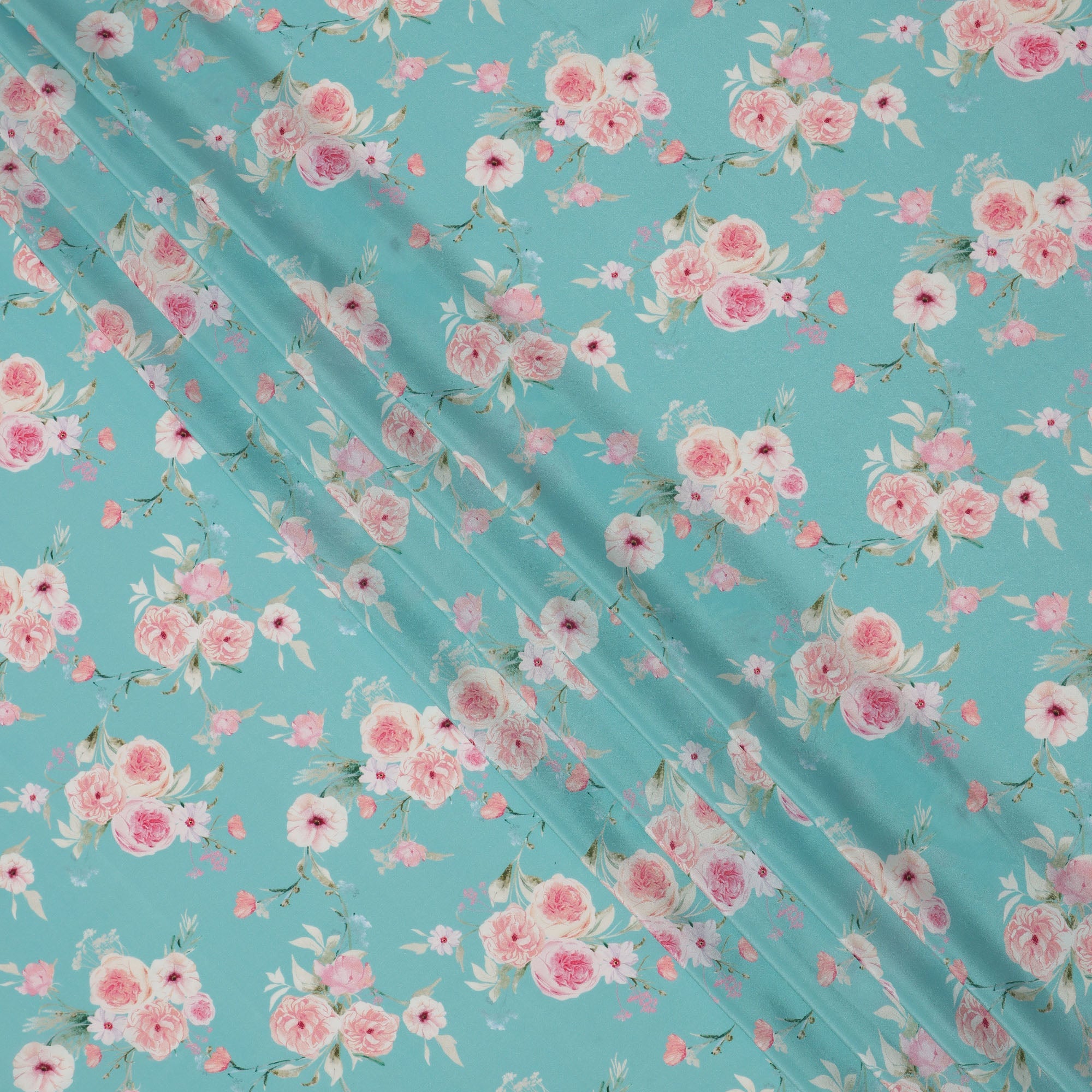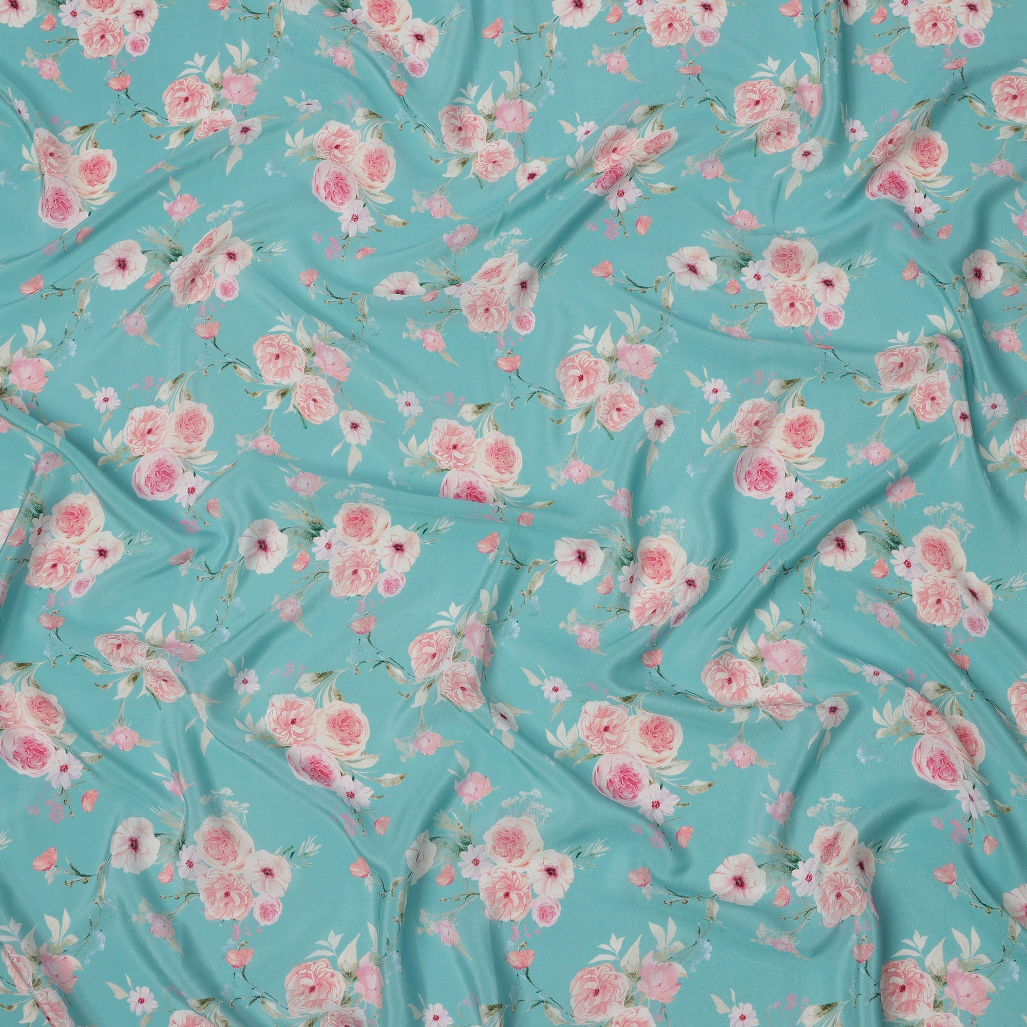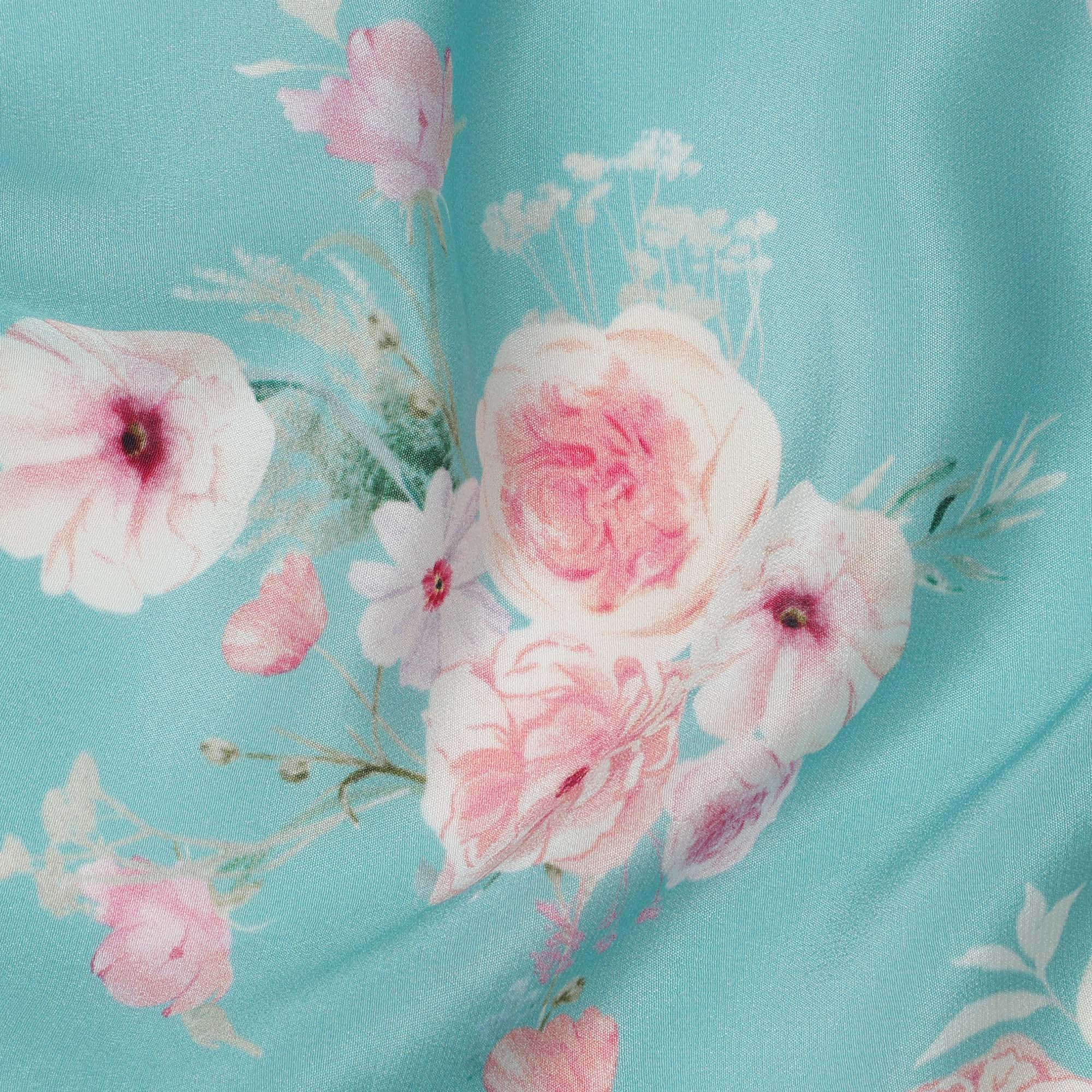 قماش كريب حريري خالص مطبوع عليه مجموعة ورود وردية خدود بقاعدة زرقاء سماوية، عرض 110 سم، صنع في الهند - D23960