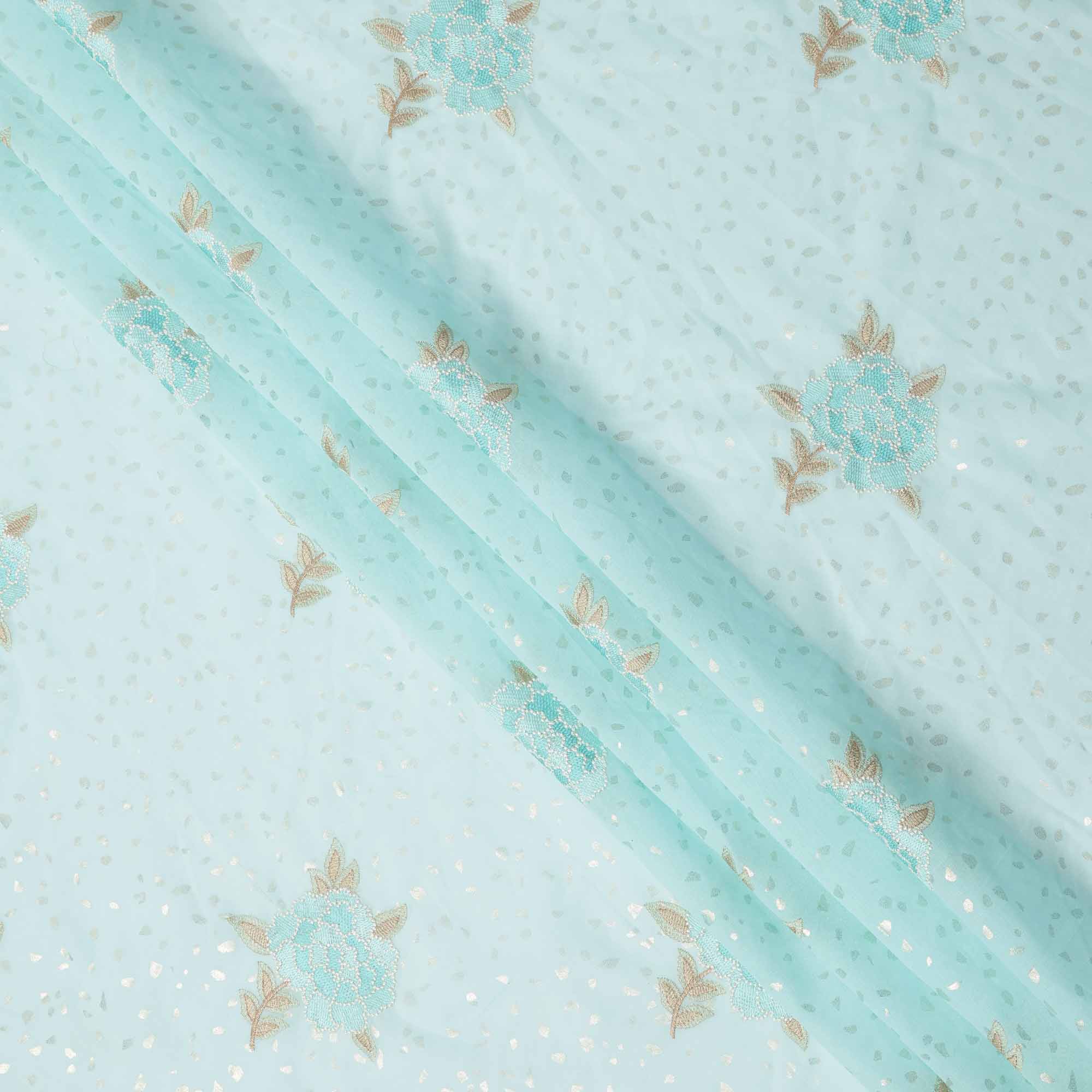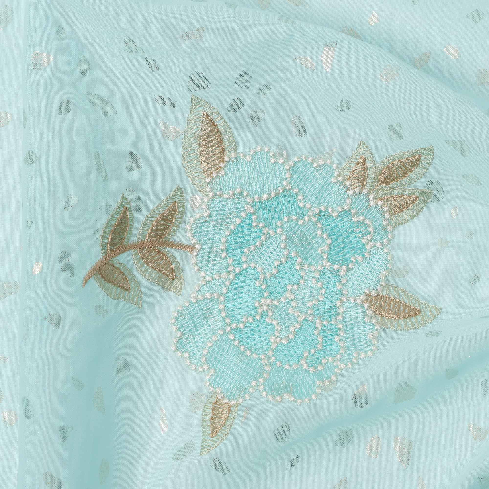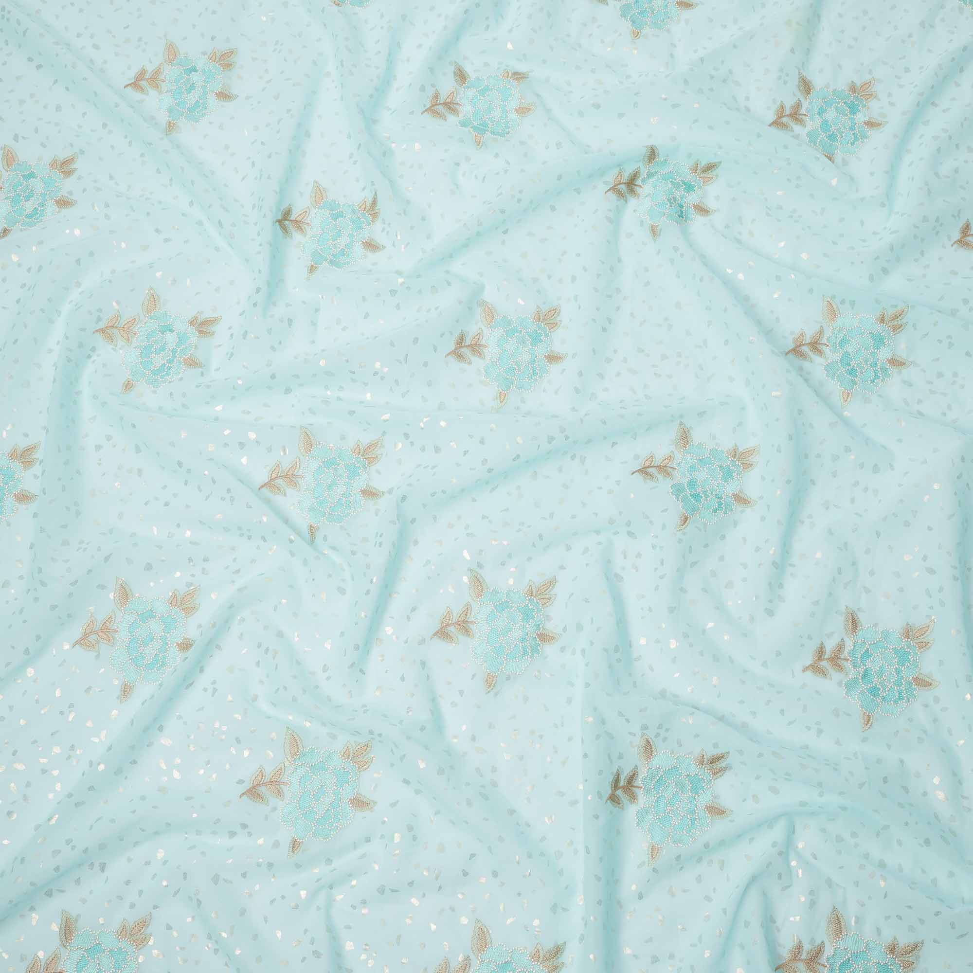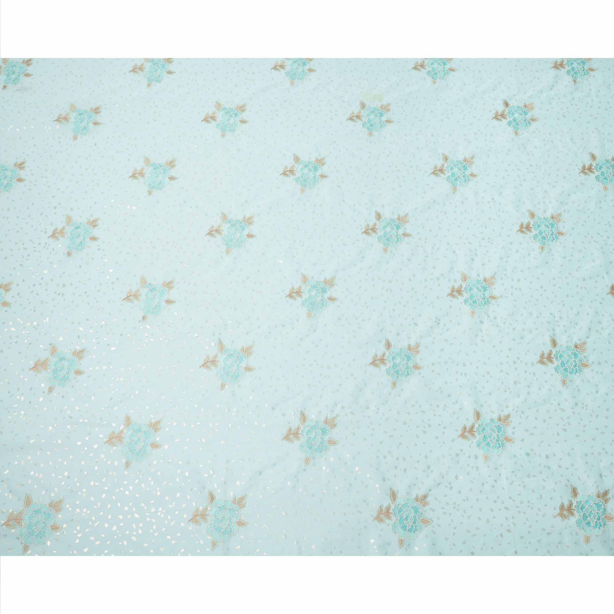 قماش فوال قطني أزرق سماوي مطرز بنقشة زهور مع تفاصيل ترتر، عرض 140 سم، صنع في الهند - D23720