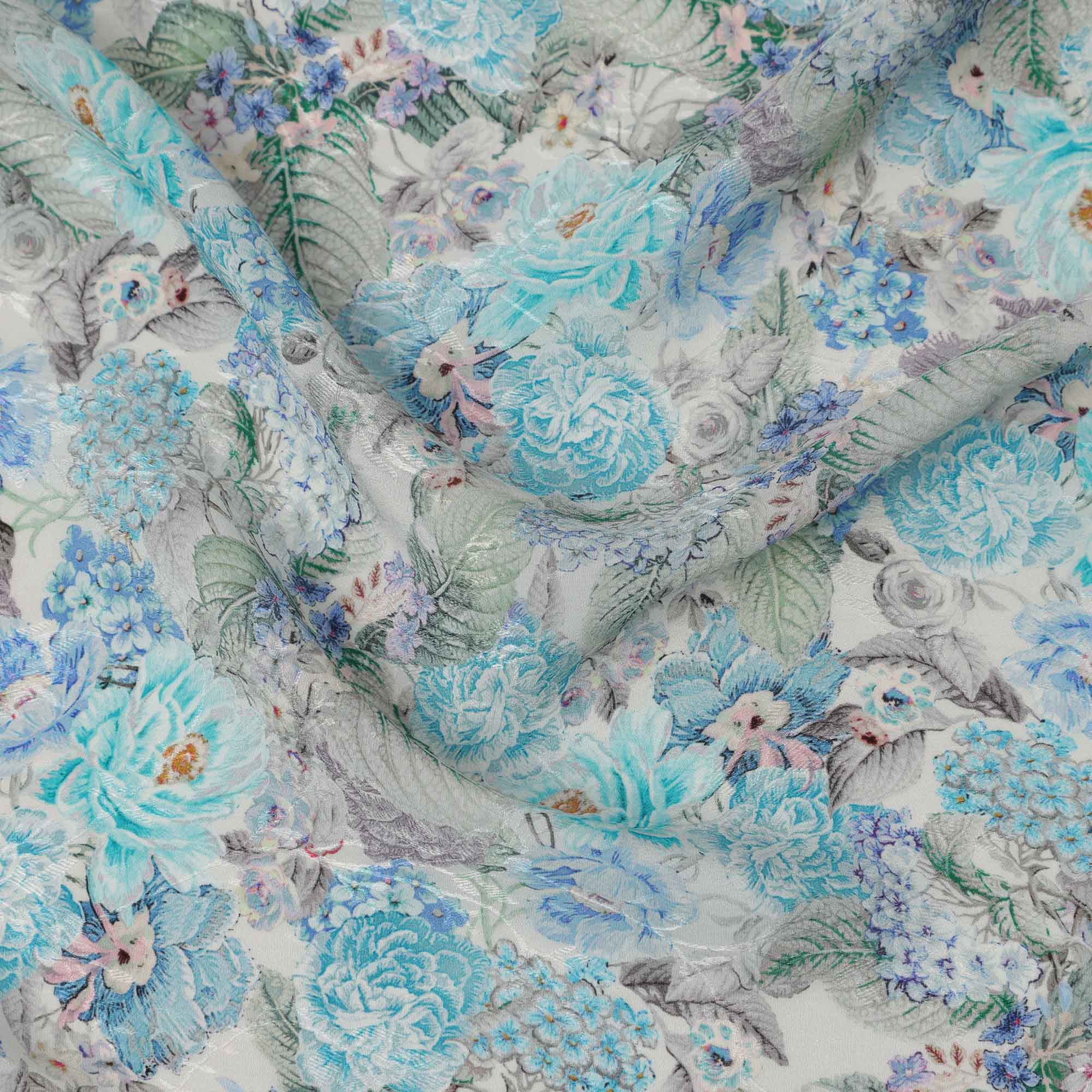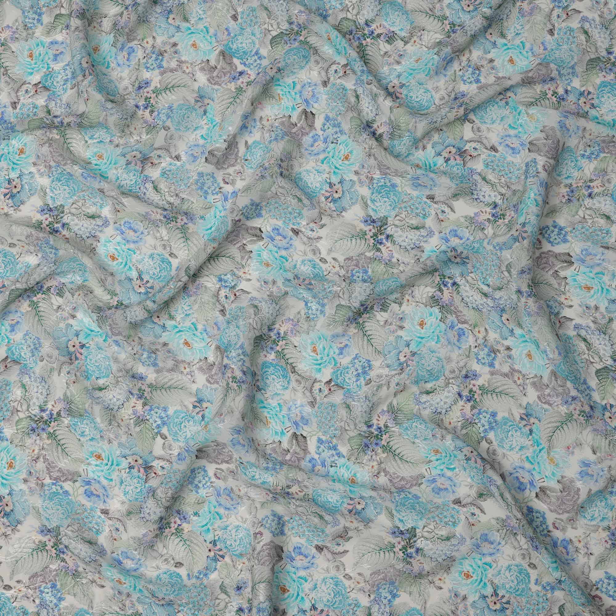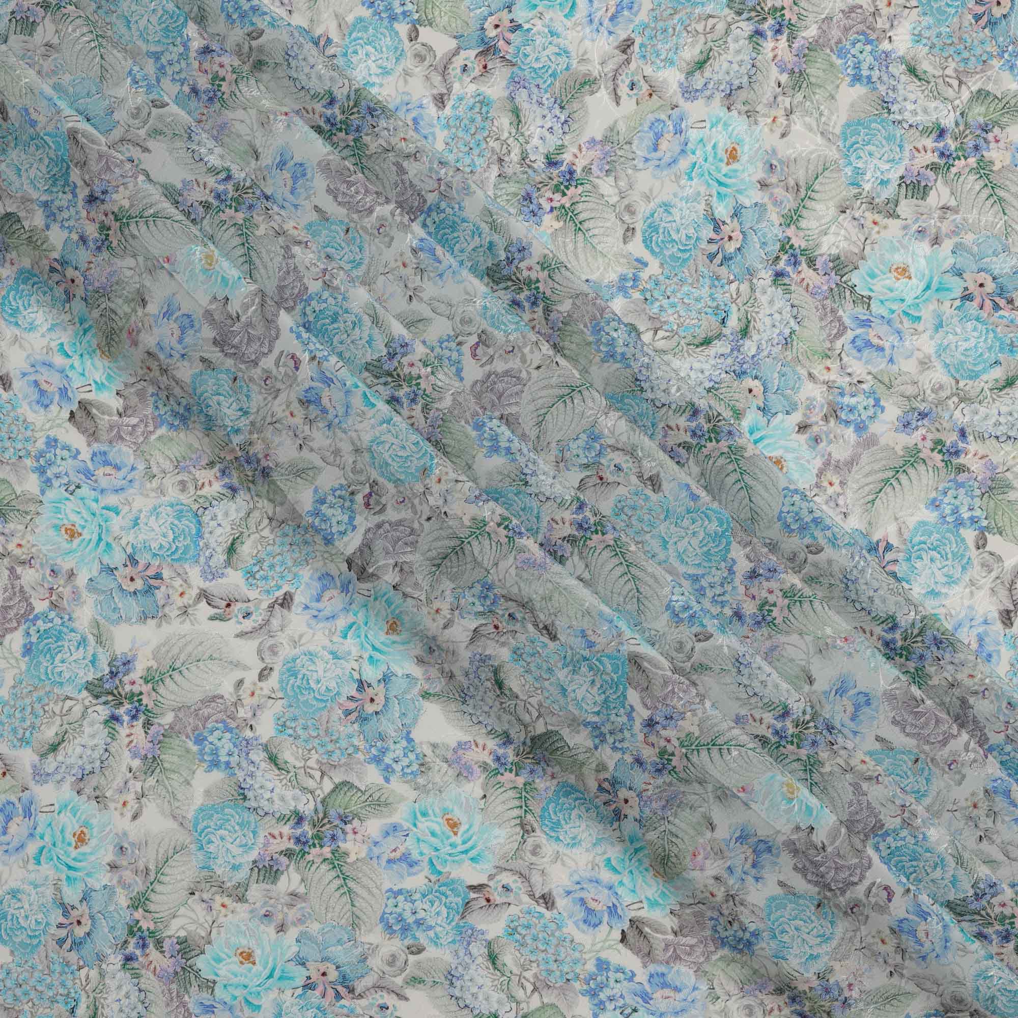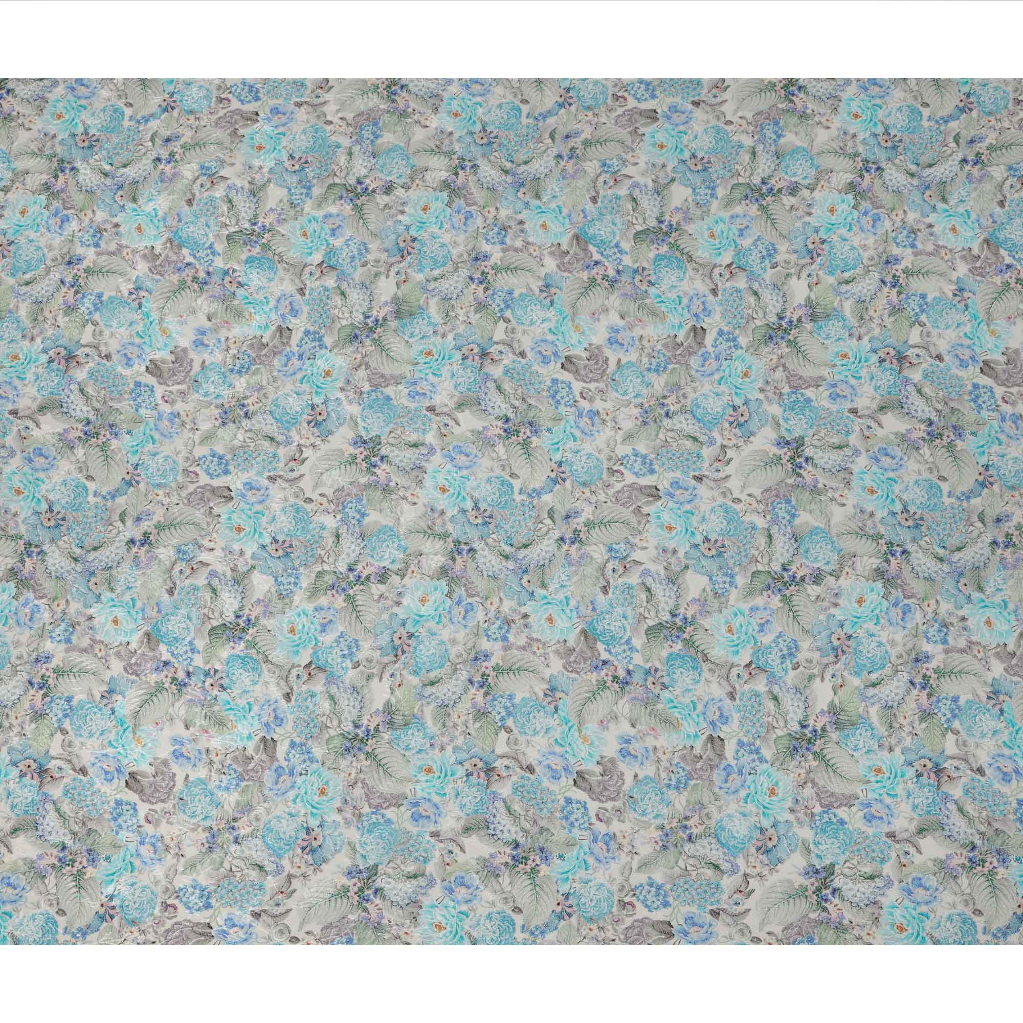 قماش كريب فيسكوز مطبوع عليه زهور باللون الأزرق السماوي، بنقشة زهور كاملة مع لمسات رمادية وأرجوانية، عرض 110 سم، صنع في الهند - D23441
